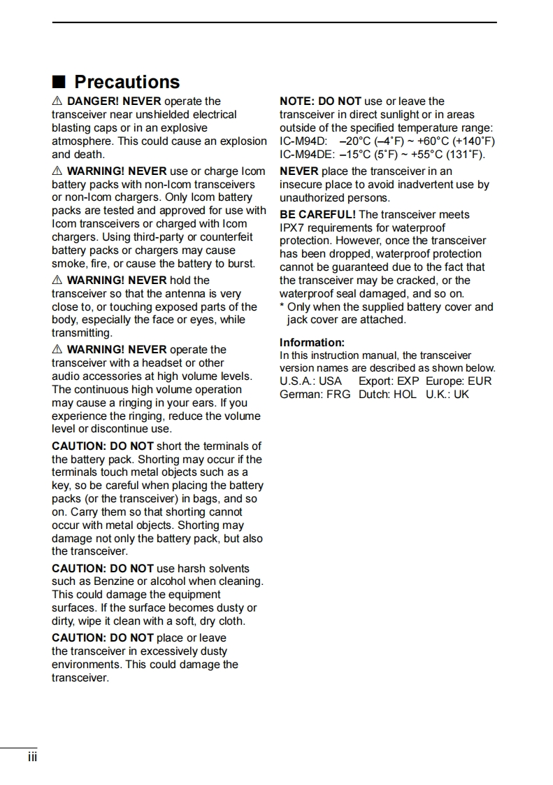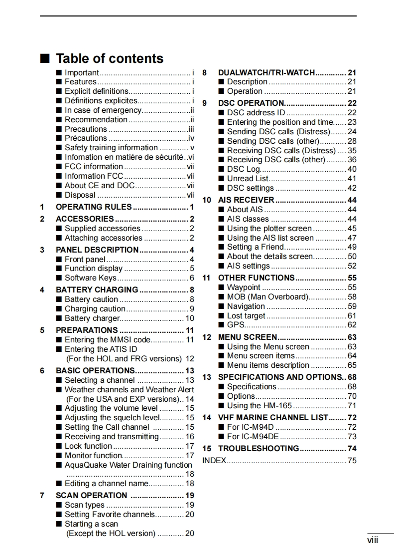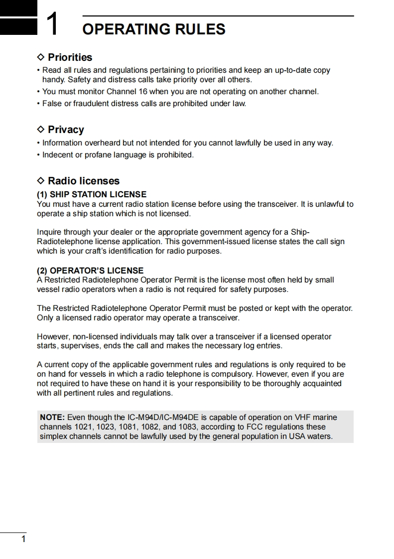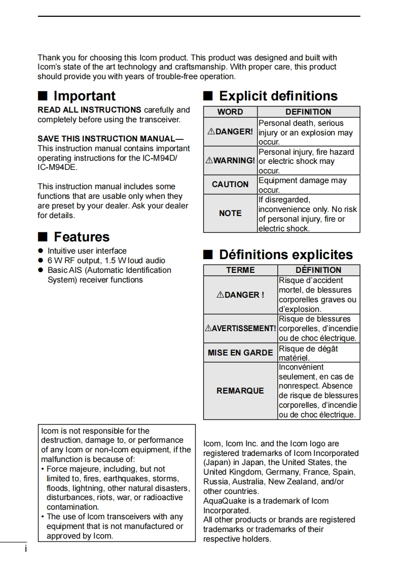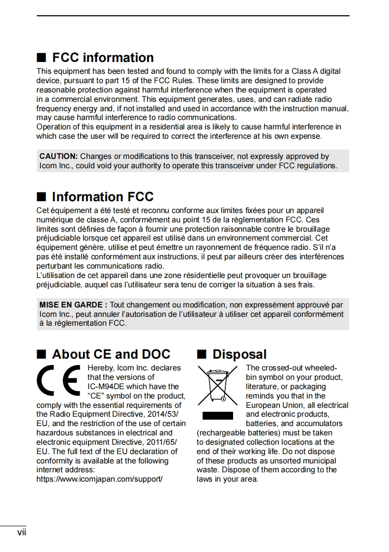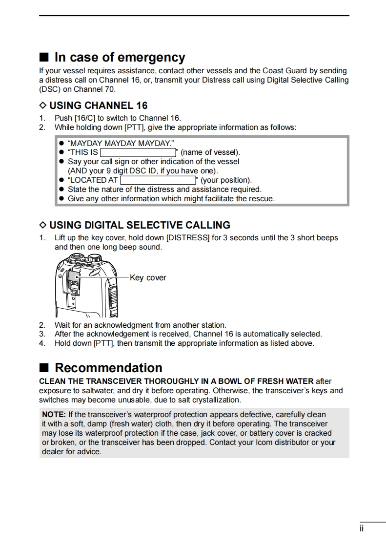 INSTRUCTION MANUALVHF MARINE TRANSCEIVERSIM94品ECOMSTBYCALLINGDTRS OR UNREADIC-M94DMENLThis device complies with Part 15 of the FCCRules.Operation is subject to the condition thatthis device does not cause harmful interference.Icom Inc.