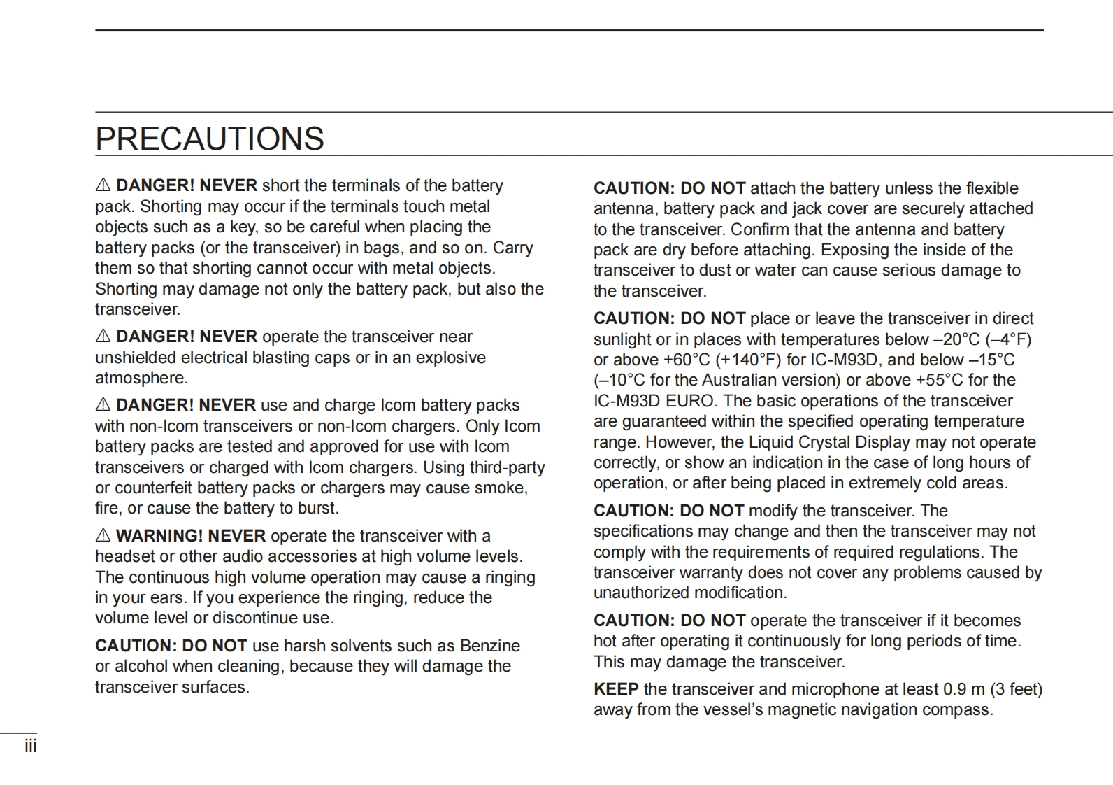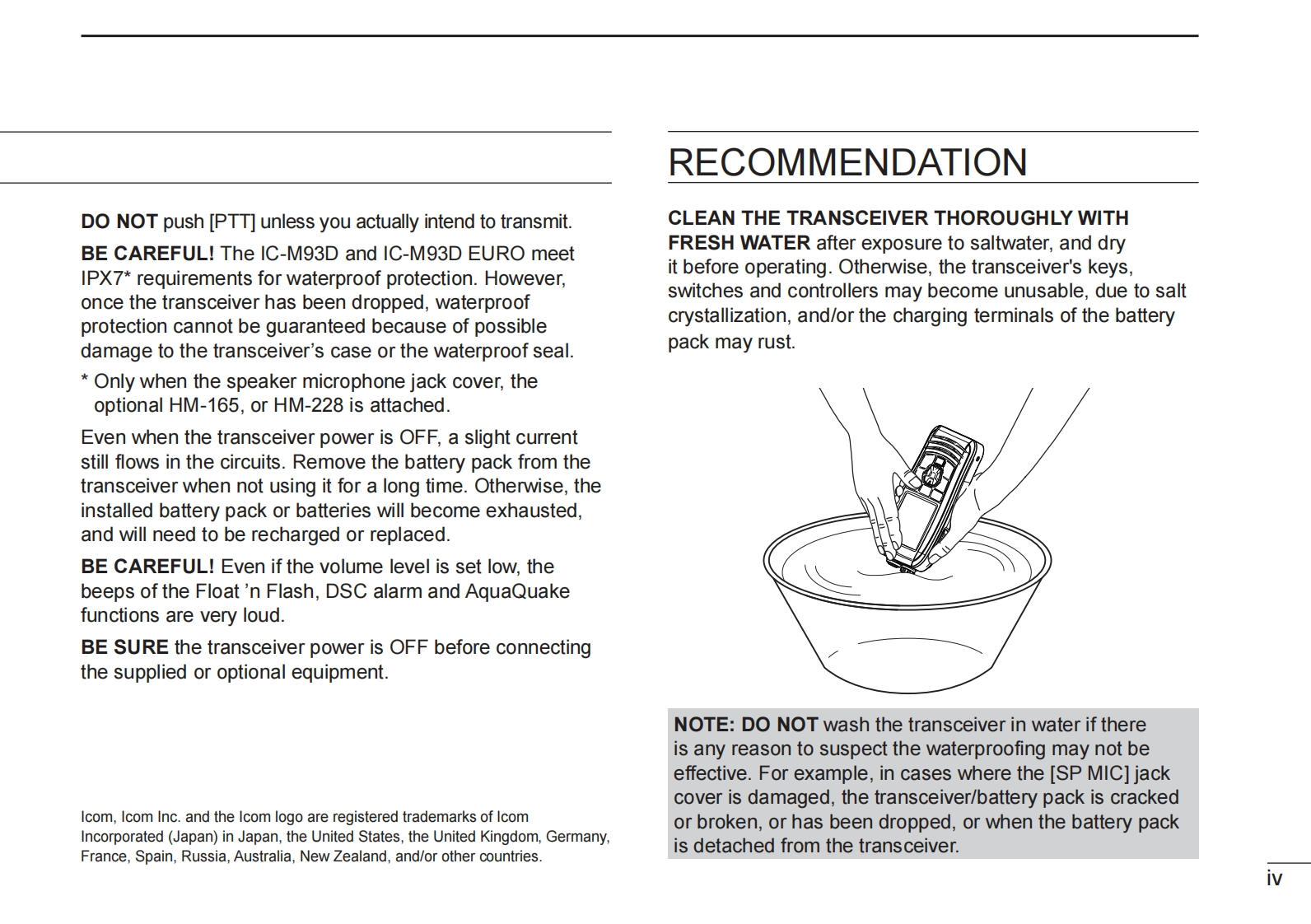 INSTRUCTION MANUALVHE MARINE TRANSCEIVERIC-M93DIC-M93DEUROTCOMIC-M93016CALLINGDTRS OTHER LOGThis device complies with Part 15 of the FCC Rules.Operation issubject to the condition that this device does not cause harmfulinterference.Icom Inc.