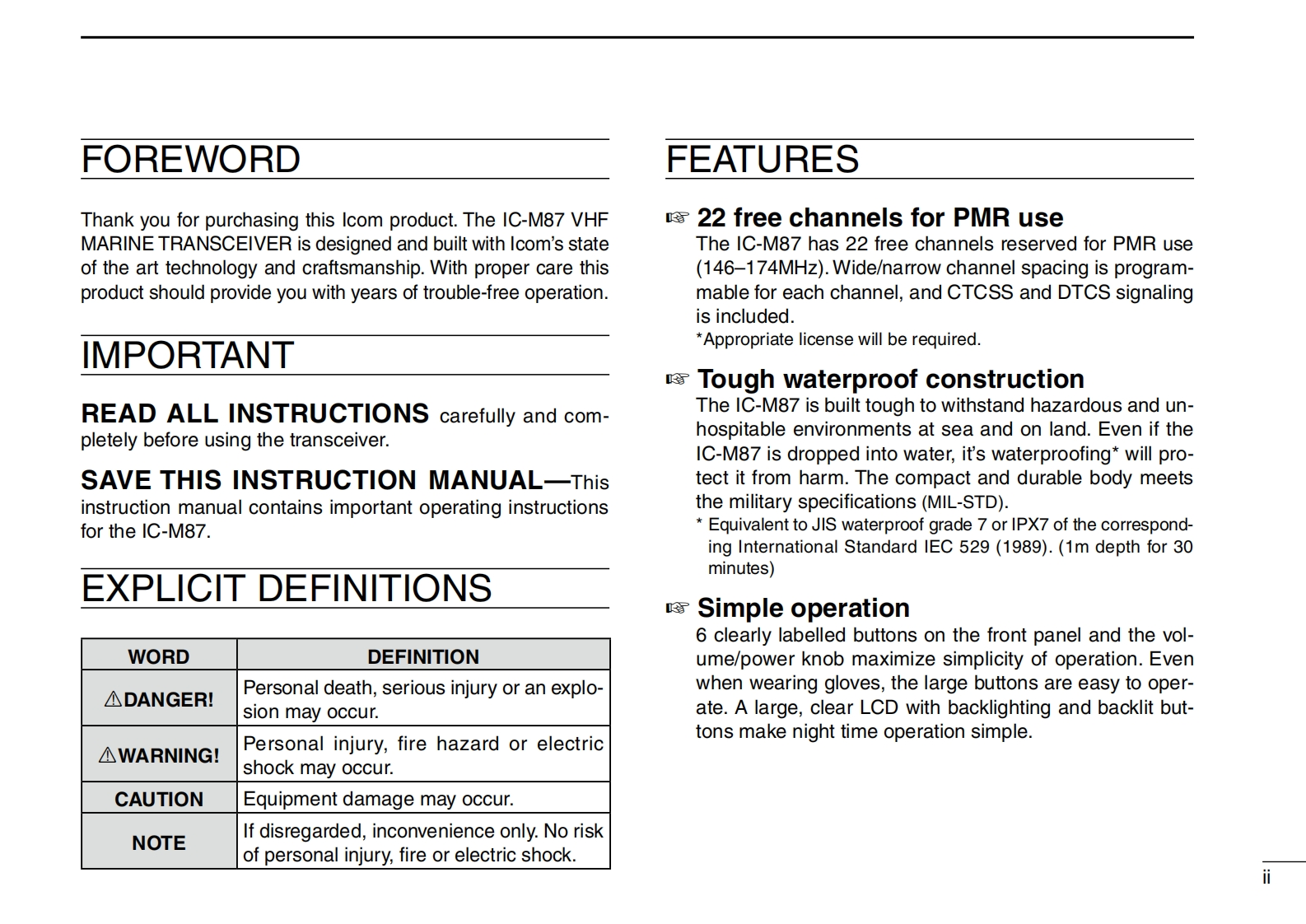 icomicm87_操作说明书手册找手册网31天前发布关注私信2.01MB40页028icomicm87_操作说明书手册此内容为付费资源,请付费后查看¥19¥21黄金会员免费钻石会员免费登录购买付费资源 第1页 / 共40页 第2页 / 共40页 第3页 / 共40页 第4页 / 共40页 第5页 / 共40页 第6页 / 共40页 第7页 / 共40页 第8页 / 共40页 第9页 / 共40页 第10页 / 共40页 试读已结束,还剩30页,您可下载完整版后进行离线阅读 THE END艾可慕 文本预览 COMINSTRUCTION MANUALVHF MARINE TRANSCEIVERIC-M87IC-M87(∈0081@Ⅱ2GEx ib IA T3LCIE 05 ATEX 6047XDUALDIALSCNLOCK16H/LIcom Inc.COM 查看更多 收起部分 喜欢就支持一下吧收藏