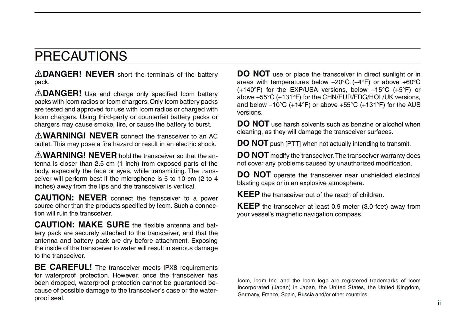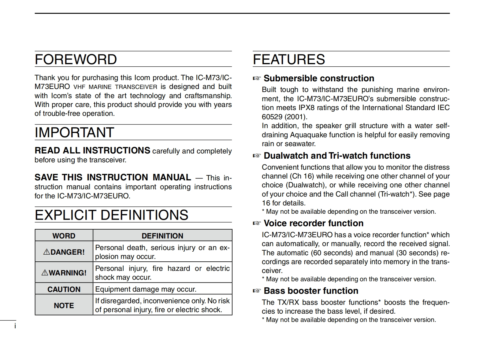 INSTRUCTION MANUALVHF MARINE TRANSCEIVERIC-M73IC-M73EUROICOMCOM6CALLINGCALLING1C-M73IC-M73EURO16/CY16/CThis device complies with Part 15 of the FCC Rules.Opera-CHWXSCANCHtion is subject to the condition that this device does not causeharmful interferenceIcom Inc.1C-M73IC-M73EURO