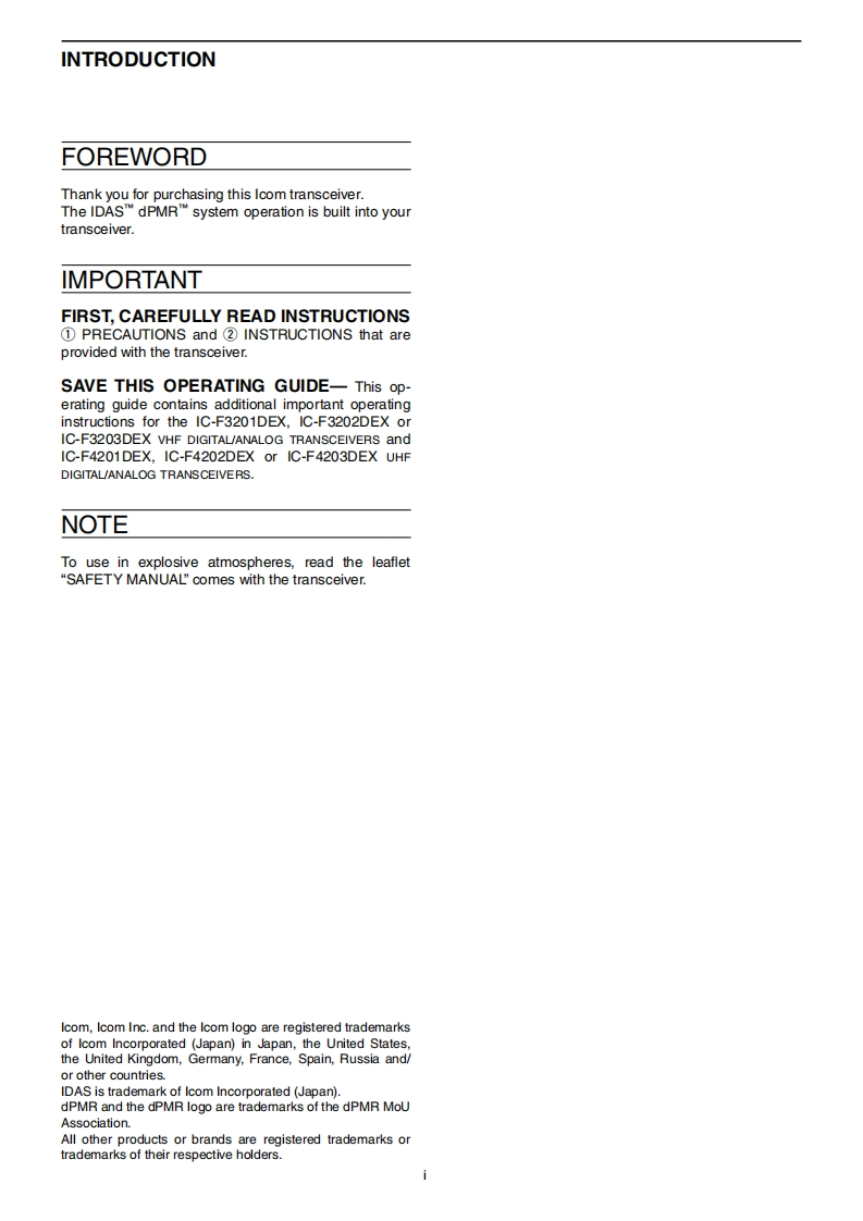 iCOM口品马COM DIGITAL ROVANCED SYSTETMd2n3OPERATING INSTRUCTIONSINTRODUCTION1ACCESSORIES2 PANEL DESCRIPTION3BASIC OPERATION4dPMRTM OPERATIONVHF DIGITAL/ANALOG TRANSCEIVERS5SPEAKER MICROPHONEIC-F3200DEXseriesUHF DIGITAL/ANALOG TRANSCEIVERSIC-F4200DEXseriesIcom Inc.