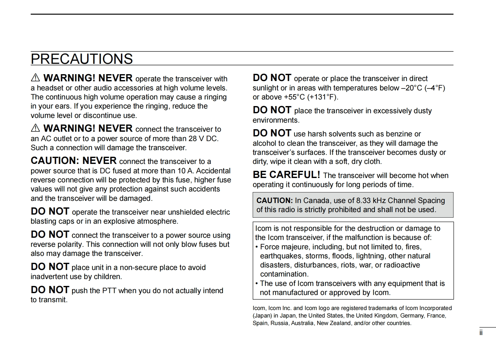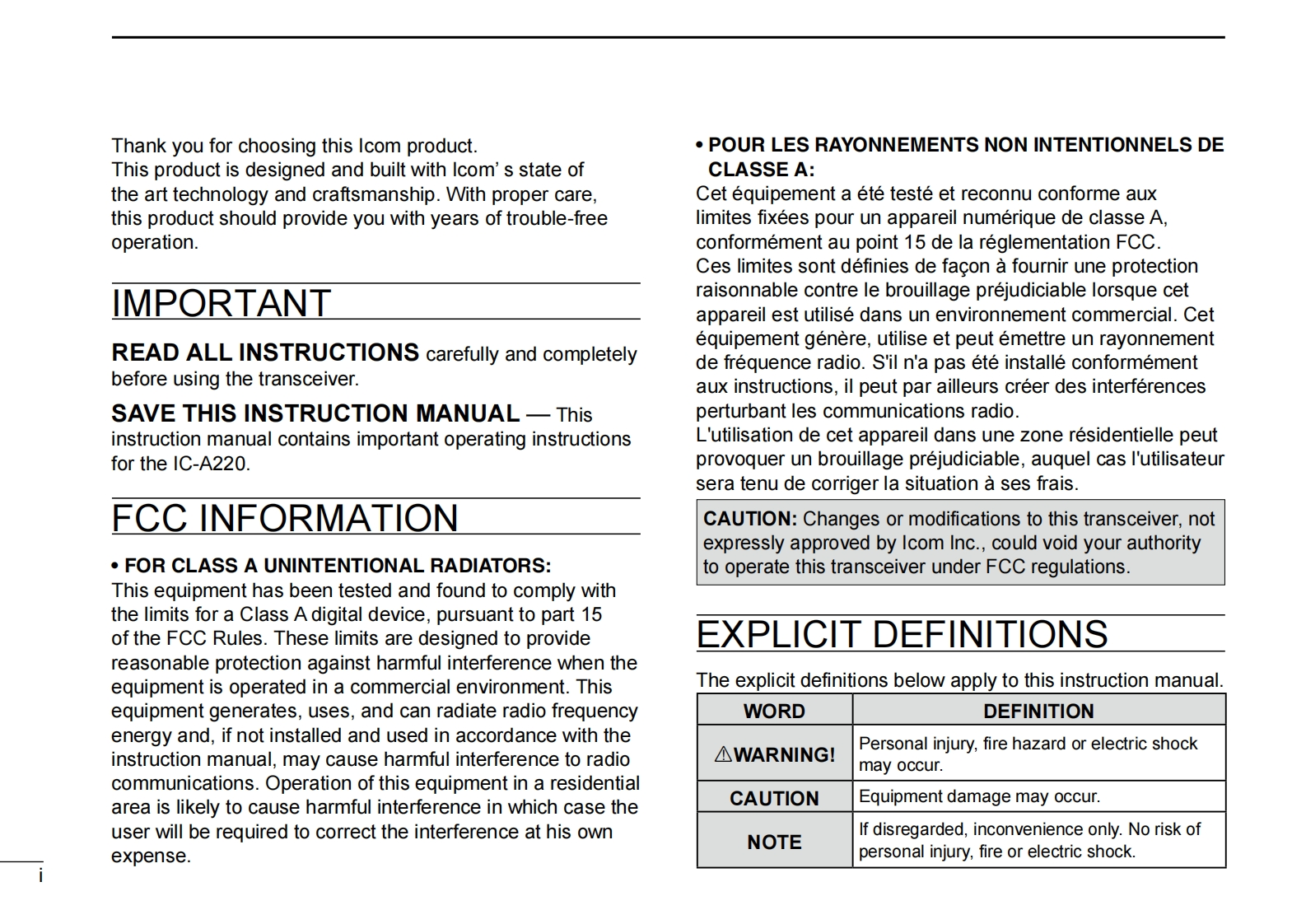 INSTRUCTION MANUALVHF AIR BAND TRANSCEIVERDUAL ECCOMRCL◆COMMIC-A220VOLB118.00136.975MEMA-7186D-1EX-5OFF1C-A220Certified TSO C128a and C169aThis device complies with Part 15 of the FCC Rules.Operation is subject tothe condition that this device does not cause harmful interference.Icom America Inc.