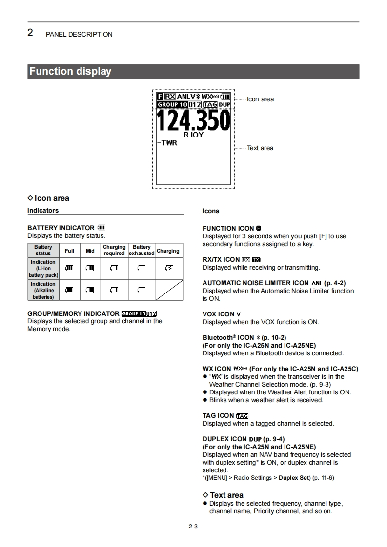 iCOMFULL MANUALINTRODUCTION1ACCESSORIES ATTACHMENTS2 PANEL DESCRIPTION3BATTERY CHARGING4BASIC OPERATIONSVHF AIR BAND TRANSCEIVERSVOR NAVIGATION1-A8(For only the IC-A25N and IC-A25NE)-A25C6WAYPOINT NAVIGATION(For only the IC-A25N and IC-A25NE)-A8-A25NE7 SCAN OPERATION8MEMORY OPERATION9OTHER FUNCTIONS10 Bluetooth OPERATION(For only the IC-A25N and IC-A25NE)11 MENU ITEMS12 SPECIFICATIONS AND OPTIONS13 TROUBLESHOOTINGINDEXIcom Inc.