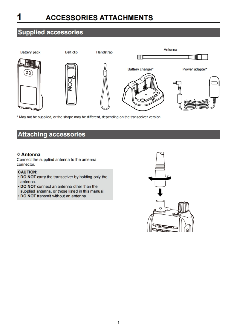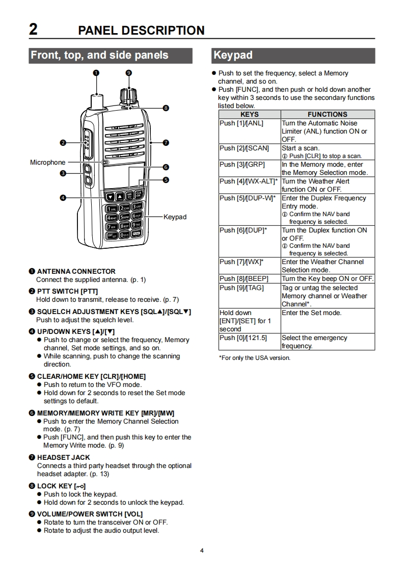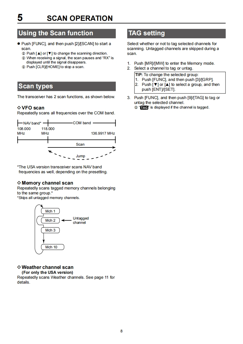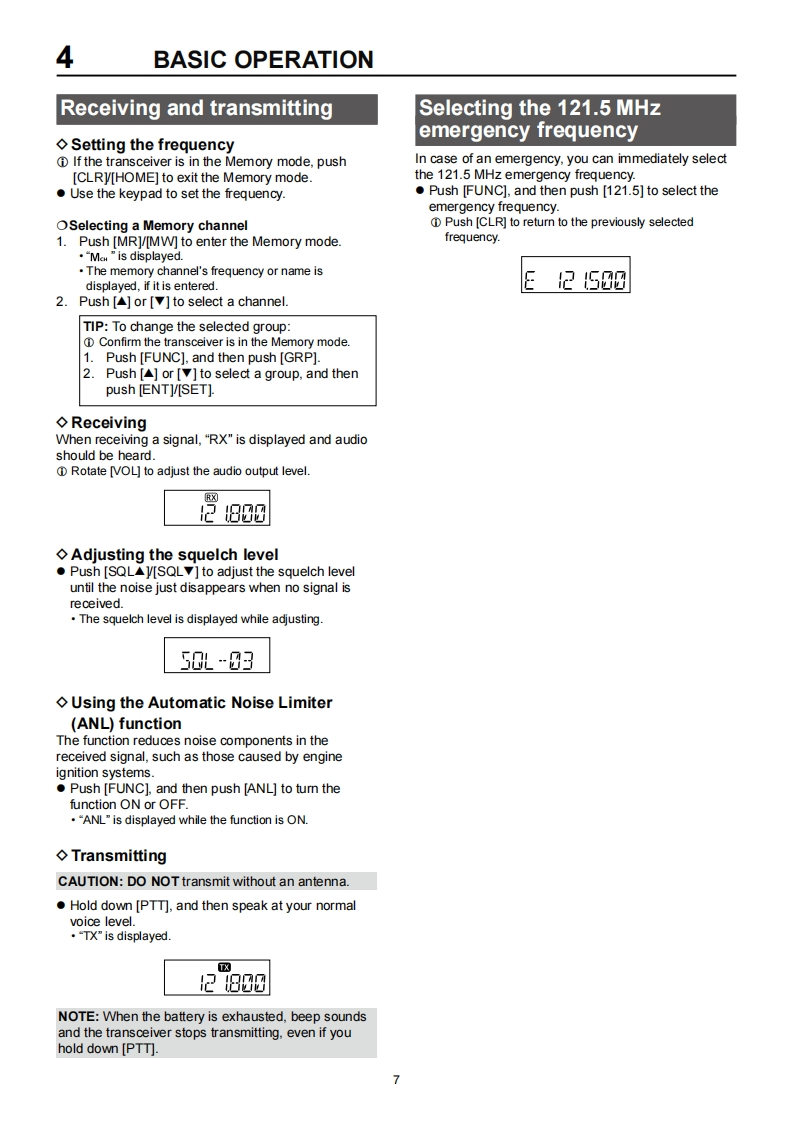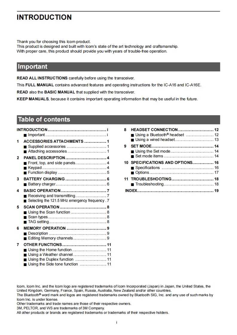 COMFULL MANUALINTRODUCTION1ACCESSORIES ATTACHMENTS2 PANEL DESCRIPTION3BATTERY CHARGING4BASIC OPERATIONVHF AIR BAND TRANSCEIVERS5 SCAN OPERATIONICAIGE6 MEMORY OPERATION7OTHER FUNCTIONS8 HEADSET CONNECTION9 SET MODE10 SPECIFICATIONS AND OPTIONS11 TROUBLESHOOTINGINDEXIcom Inc.