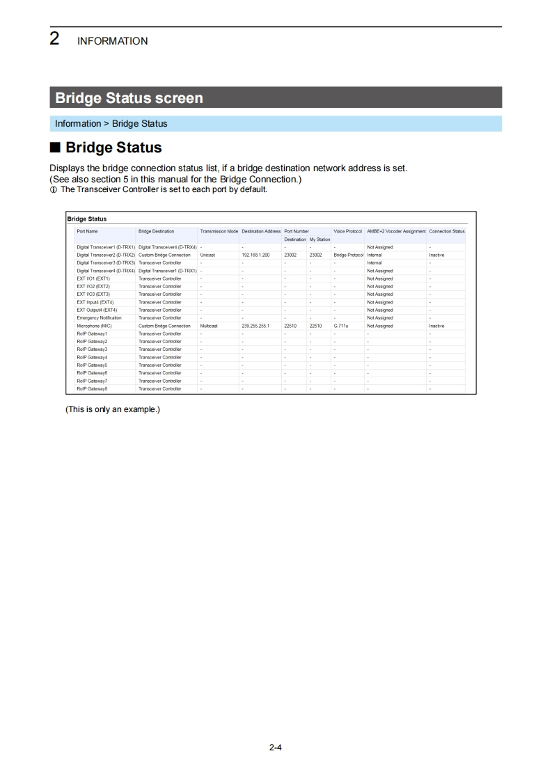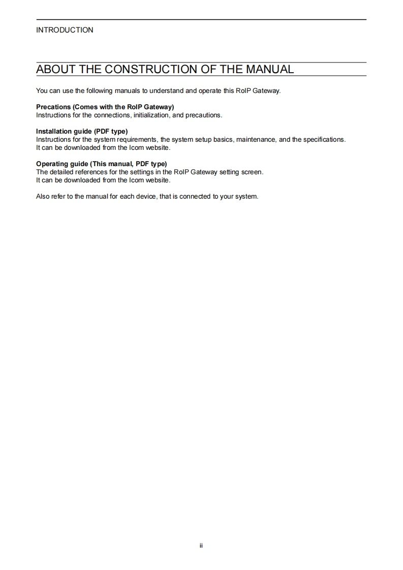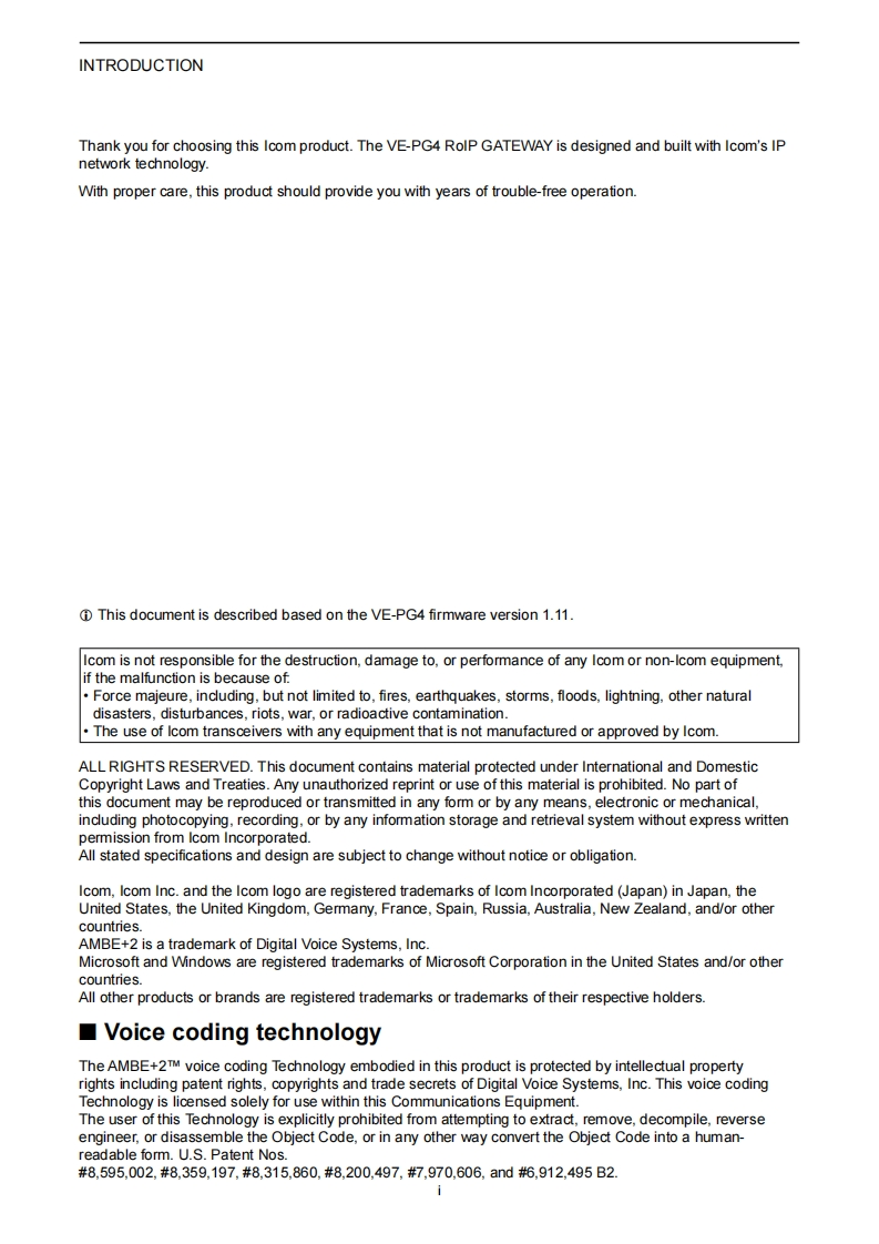icomOPERATING GUIDERoIP GATEWAYINTRODUCTIONVE-PG41 TOP2 INFORMAITON3 NETWORK SETTINGS4 ROUTER SETTINGS5 BRIDGE CONNECTION SETTINGS6 TRANSCEIVER CONTROLLER7 CONNECTION PORT SETTINGS8 DESTINATION SETTINGS9 EXPERT SETTINGS10 IP LINE SETTINGS11 PBX12 PBX TRANSCEIVER CALL SETTINGS13 PBX EXTENSION14 PBX ADVANCED SETTINGS15 MANAGEMENTIcom Inc.