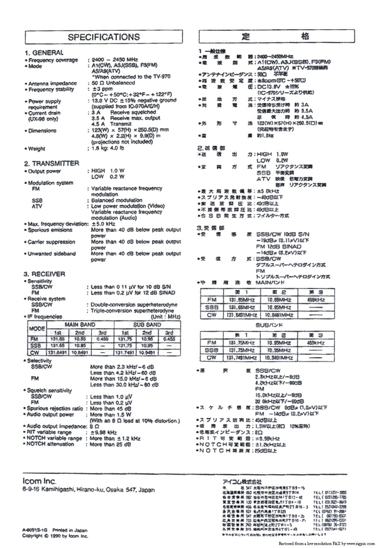 GcOMINSTRUCTIONSThank you for purchasing the UX-98 2400 MHzBAND UNIT.2400MHz BAND UNITUX-98The unit adds 2400 MHz SSB.CW,FM and option-al ATV mode operation capability to your1C-970A/E/H.FOREWORDThe UX-98 atlows you to operate in all modes on theAfter installation,the supplied stickers should be at-2400 MHz band.Moreover,by connecting an option-tached as below.al TV-970 ATV ADAPTER,you can enjoy amateur tele-(2400 MHz ANT]Near the 2400 MHz antenna connector.vision operation.[2400 MHz ATV]Near the TV IF input and output jacks.Please refer to the IC-970A/E/H instruction manual forThere are 2jacks for 2400 MHz ATV operation that ac-operation;refer to the TV-970 instruction manual forcept an optional TV-970.ATV operation.Red jack TV IF input from the TV-970Black jack TV IF output to the TV-970The cables to the TV IF input and output jacks shouldbe fastened using the supplied wire tie.INSTALLATIONGRomove top and bottom covers.2 Remove 2 screws.then remove this antenna hole cover.(Refer to p.37 of the IC-970A/E/H instruction manual.)Remove 1③insta1 the UX-98with①Connect P77DCscrew.then rethe supplied radiationmove the TVJpower cable)tosheet:then,tighten theP1 of the UX-98.hole cover.suppled 6 screws.©Connect P4罗--12 mm length(11-pin plug4pc5】⑦Connect the coaxi.from the UX-98)af cable (markedto J4 on theRadiationred)to J4 on theLOGIC unit.sheetUX98.-JACK8 Connect the coaxi-boardal cable (notmarked)to J5 onUX-98the UX-98.0P1P778 mm length2pGs)】J9oscunitP⑤Attach the JACK bo8rdLOGIC unitthen tighten the boardusing the screwremoved from the TVJConnect the coaxial6 Connect P78(12-pin plug)hole cover.cable (P3)from theto J9 on the UX-98UX-98 to J3 on theOSC unit.Replace the top and bottom covers.NOTE:An optional CR-293 HIGH-STABILITY·FREQUENCY STABILITYCRYSTAL UNIT should be installed when using the1C970 standard:±3ppm(0C-+50C:+32F~+122月transceiver with the UX-98 2400 MHz BAND UNIT.With CR-293:±0.5Ppm(0C-+60C:+32F~+140月