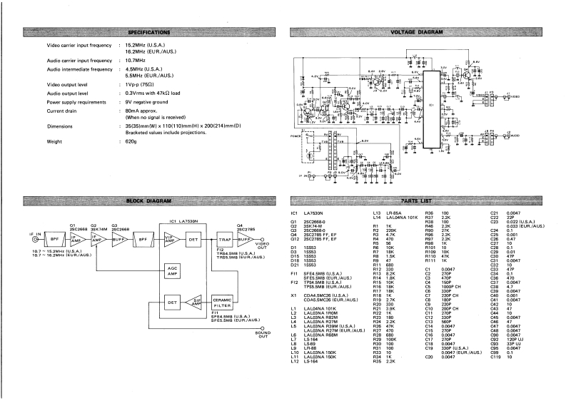 UNIT INSTALLATIONICOMInstal the TV-R7000 on the side af the C-R7000INTERCONNECTIONOPERATING INSTRUCTIONSrecehver in the following way:1.Connect the TV-R7000 IF IN plug to the [10.7MHz1.Connect a suitable TV antenno.The CR7000IF OUTPUT]terminal on the IC-R7000.antenna connector impedance is 5002,and a suitableINSTRUCTIONS1.Remowe the two screws indicated in Fig.1 from thematch can be made with a 7512 feedline.rear panel of the TV.R7000.Slide and pull theunit's cover out as shown in Fig.1.Align it in the proper direction along the plane ofpolarization to ensure reoeiving alear pictures.TV-R7▣OO2.Turn ON the power pitches on the IC-R7000and TV-R7000.3.Push the [FM]MODE SELECT SWTTCH and slidethe FM SELECTOR SWITCH to the [FM(21)positien on the IC-R7000 for wtting the FM-mideTV RECEIVE ADAPTER(150kHzl mode.The FM SELECTOR SWITCH is located on the rearFig.12.Connect the wpplied video cable between thepaneLINTRODUCTION[VIDEO CUTPUT]terminal on the TV-R7000and a wideo input terminal on the monitor CRT4.Tune the dial to the sural center frequency of theThank you for choosing this ICOM product.2.Attach the TV-R7000 cover to the side of thedisplay or TV set.TV sigral and not to the picture carrier frequeney.IG-月7C00 using the tw0 suppliad seris.月HroThe TV-R7000 is a telvision receive adapter for useFig.2.3.Connect the supplied video cable between the5.Adjust the [AF GAIN]CONTROL on thewith an IC-R7000 COMMUNICATIONS RECEIVER.[AUDIO OUTPUT]terminal on the TV-A7000IC-R70CO to a comfortable listening level.SoundThe TV-A7000 converts TV signals received by theto the manitor CRT display or TV set,it needed.is emitted from the intemal speaker.If an extermalIC-R7000 to video signals,displaying pietures on thespeakir is conneeted through an 2ppropriste audloCRT display.amplliar,sound will be emitted from that speaker鲜weLFor best rewlt核paw腰r同dthe网instructions beforeusing the adopter,and keep them handy for futurereference.Aural canoerINSTALLATION●UNPACKINGF1g.2Pktune carrier3.After inatalling the TV-R7000 cover on theIC-A7000,attach the TV-R7000 unit to the coverusing the two previously removed sorews.4.If a speaker is connected to the [AUDIO OUTPUT]45M地U5.Aterminal through an sppropriate amplitier,sound5.5MEUR/U线.Iwill be emitted from the external spealer.NOTE:The output leal should be approm4y0.3 Vrm at IkHz wi协47k2load.Impodance of an amplitier oonnected to the [AUDIO OUTPUT]ICOM INCORPORATEDTVR7000 and Aooessorim0400as01.cable....barminal on the TV-R7000 should be at1619 KAMIKURATSUKURI.HIRANO-KUFig.3e1CkOSAKA 547.JAPANA0825Prinned in dapsn