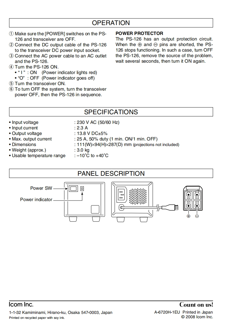 ICOMThank you for purchasing the PS-126 DcINSTRUCTIONSPOWER SUPPLY.The power supply is designedto use with an Icom HF or VHF/UHF all modeDC POWER SUPPLYtransceiver.PS-126Please read these instructions thoroughly be-fore operating the PS-126.PRECAUTIONS·△WARNING!NEVER apply AC voltage that·△CAUTION!The socket-outlet must be nearexceeds the specified voltage to the PS-126'sthe DC power supply and must be easily ac-AC power cable.Excessive voltage couldcessible.cause a fire or ruin the power supply.·△USE INDOORS ONLY!NEVER expose the·△WARNING!Immediately turn the powerpower supply to rain,snow or any liquids.supply OFF and remove the AC power cableDO NOT use or place the power supplyif it emits an abnormal odor,sound or smoke.in areas with temperatures below -10C orContact your Icom dealer or distributor for ad-above +40C.vice.DO NOT use chemical agents such as benzine·△CAUTION!EVER let metal,wire or otheror alcohol when cleaning,as they can damageobjects touch any internal parts through thethe power supply's surfaces.slits of the case or terminals on the rear panelDO NOT place the power supply against wallsof the power supply.This may result in an elec-or put anything behind the power supply.Thistric shock.will obstruct heat dissipation.·△CAUTION!NEVER connect the power sup-KEEP the power supply out of the reach ofply to a DC power source using reverse polari-children.ty.This will damage the power supply.USE an AC outlet that can supply more than·△CAUTION!NEVER open the top cover..750 VA capacity.AVOID the use of a multi-There are no user adjustment parts.Open-plug adaptor.ing the case may expose you to electric shockand incorrect reassembly may cause a firehazard.·△CAUTION!NEVER put the power supply inIcom,Icom Inc.and the coM are registered trade-any unstable place(such as on a slanted sur-marks of Icom Incorporated (Japan)in the Unitedface or vibrating area).This may cause injuryStates,the United Kingdom,Germany,France,Spain,to you and/or damage to the power supply.Russia and/or other countries.Versions of the PS-126 which displaythe "CE"symbol on the serial numberseal,comply with the essential require-ments of the European Radio andTelecommunication Terminal Directive1999/5/EC.