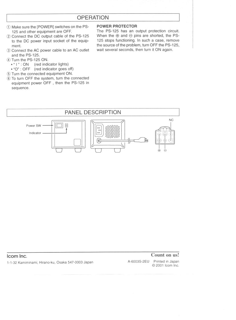 iCOMThank you for purchasing the PS-125 dcINSTRUCTIONSpower supply.The PS-125 is designed forIcom equipments required 13.8V DC 25ADC POWER SUPPLY(Max.).Please read these instructionsthoroughlyPS-125before operating the PS-125.PRECAUTION·△NEVER apply AC voltage that exceeds theKEEP the power supply out of the reach ofspecified voltage for the PS-125 rear panel.children.Excessive voltage could cause a fire or ruinUSE the power supply with an Icom equipmentthe power supply.only.Other brands may have different pin·△NEVER expose the power supply to rain,assignment.snow or any liquids.USE an AC outlet that can supply more than·△NEVER open the top or bottom covers.750VA capacity.AVOID the use of a multi-plugThere are no user adjustment points.Openingadaptor.the case may expose you to electric shock andDO NOT use strong cleaning agents such asincorrect reassembly may cause a fire hazard.benzine or alcohol.ALWAYS unplug the AC·△NEVER let metal,wire or other objects touchcable from the AC outlet,then use a dry softany internal components through the slits ofcloth when cleaning the power supply.the cases.This will electric shock.DO NOT place liquids on or near the power·△CAUTION!The socket-outlet must be nearsupply.the DC power supply and must be easilyDO NOT place the power supply against wallsaccessible.or put anything to behind the power supply.·△ACHTUNG!Die Steckdose muB nahe beiThis will obstruct heat dissipation.diesem Gerat angebracht und zugangliichsein.SPECIFICATIONS。Input voltage230V AC·Input current:2.3AOutput voltage:13.8VDC±5%Max.output current:25ADimensions:111(W)×94(H)×287(D)mm(projections not included)4.4W0×3.7(H)×11.3(D)inWeight:3.0kg:6b10ozUsable temperature range:-10^Cto+40^C;+14Fto+104℉