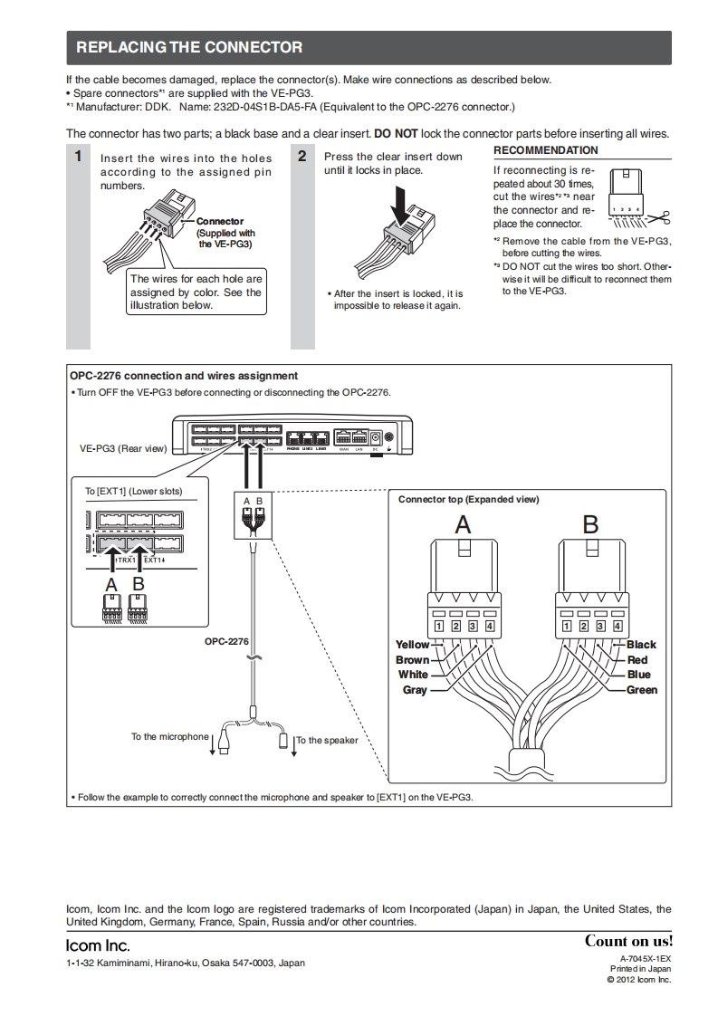 TCOMINSTRUCTION MANUALCONNECTION CABLEThank you for purchasing this lcom product.The OPC-2276 CONNECTION CABLE is used to connect aOPC-2276microphone and a speaker to the VE-PG3.READ ALL INSTRUCTIONS carefully and completely before using the cable.CONNECTING THE OPC-2276Turn OFF the VE-PG3,and then connect the OPC-2276,as shown below.SpeakerVE-PG3(Rear view)·Monoral plug:3.5(dmm(1/8Inputimpedance:画血回@higher than 8·Power capacity:more than 1WTo [EXT1](Lower slots)Be sure to insert theTo the speakerAconnectors top side upIcom's microphone(Example:SM-26)ABottomTo the microphone0PC-2276.The [EXT1]and [EXT2]ports (lower slots)accept the OPC-2276 connectors,however,follow the example to correctly connect the microphone and speaker to ONLY the [EXT1]on the VE-PG3.CAUTIONVerify that the VE-PG3 is turned OFF when connecting or disconnecting the cable.Hold the connector body when connecting or disconnecting them.When other cables are connected,you canuse needle-nose pliers to carefully insert orremove connectors.ConnectorNeede-nose pliersbodyNEVER pull the connector by holding thecable.This will damage the cable.*If the cable becomes damaged,replace theconnector(s).See "REPLACING THECONNECTOR"on the reverse side forVE-PG3(Rear view)replacement details.LNever bend or pinch the cable.Never place a heavy object on the cable.Never touch the cable with wet hands.Always connect the cable correctly.An incorrect connection could damage the VE-PG3 andor the microphone and speaker