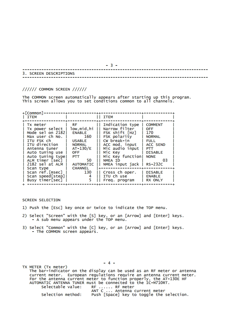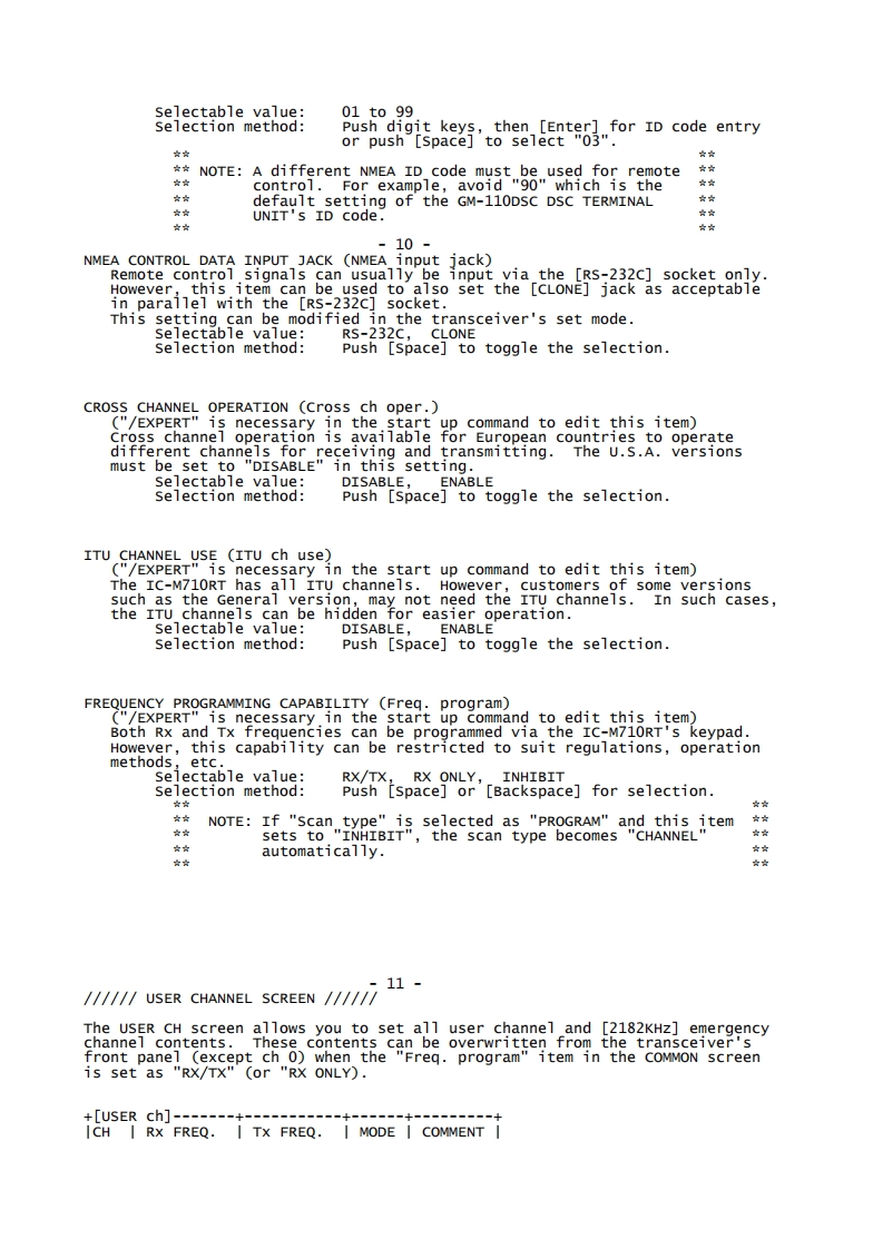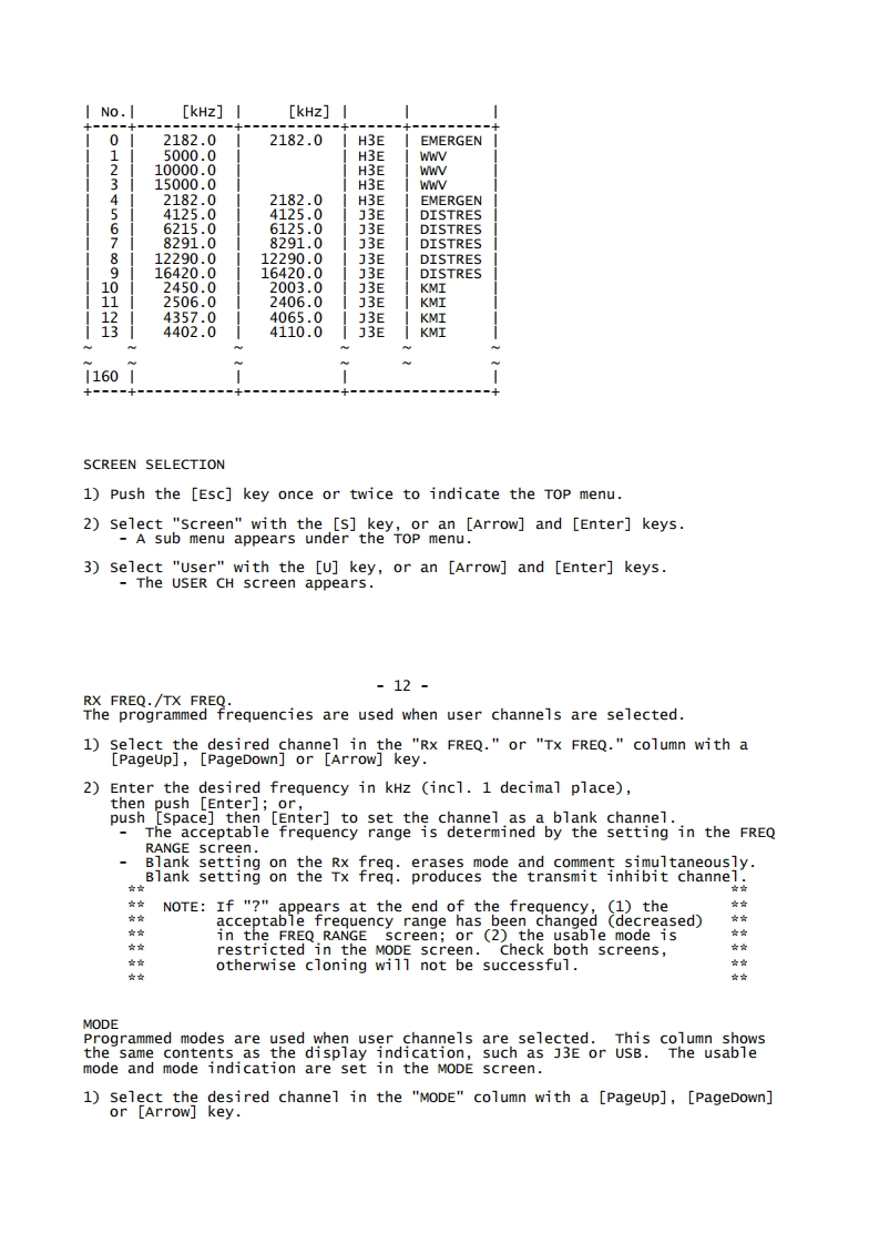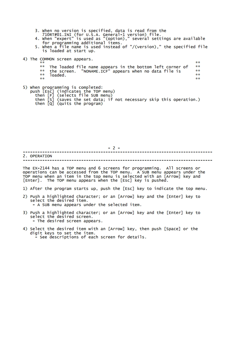 EX-2144 FIELD PROGRAMMING SOFTWAREFor the IC-M710RT(C)1998 Icom Inc.Rev 1.01Portions of the software copyrighted by Microsoft Corporation 1982-1988☆☆★☆This program is designed to perform cloning for the★IC-M710RT MF/HF MARINE TRANSCEIVER on ly.★★Before using.the program,make a backup copy of the *★★original disk.☆★☆★☆TABLE OF CONTENTS1.PROGRAM START UP AND SHUT DOWN2.OPERATION33.SCREEN DESCRIPTIONCOMMON SCREEN.USER CH SCREEN.12ITU SIMP SCREEN ..14FREQ RANGE SCREEN16MODE SCREEN············184.CLONING OPERATION.·.·······205.FILE SAVING AND LOADING............2224-1-1.PROGRAM START UP AND SHUT DOWN1)Boot up DoS.(Microsoft(R)windows(R)3.1/95 are not supported.2)Insert the EX-2144 backup disk.Please quit any applications which are using the RS-232c port(s).3)Type the start command:★★EX2144 /(option)/(version)[Enter]*★★★★1.#01,#02,#03,#06,#11,#12 can be used as"(version)".#01:U.S.A.General version#02:U.S.A.Marine version#03:U.S.A.GMDSS version#06:KOR version#11:Europe Marine version#12:Europe GMDSS version2.When the version is specified,the correspondingdefault settings are read.