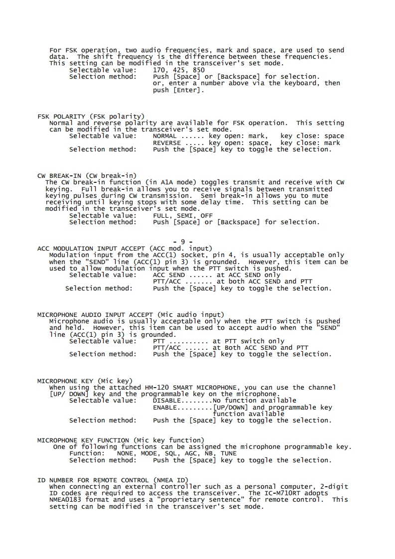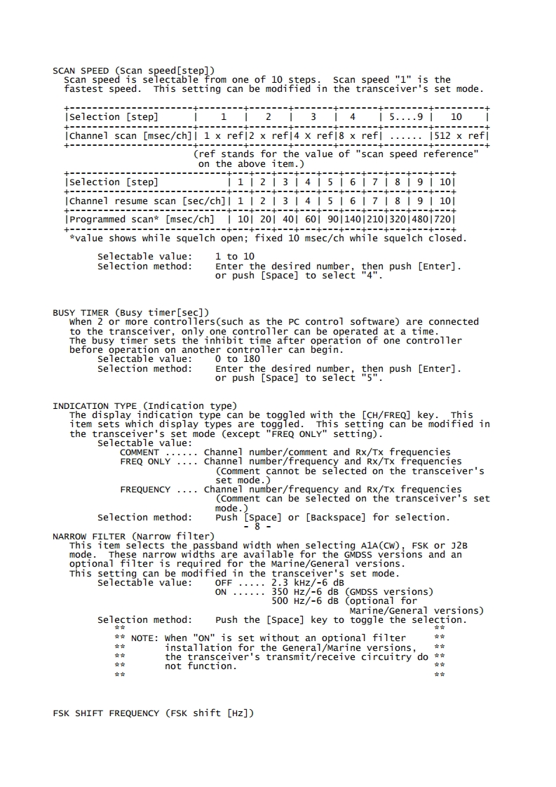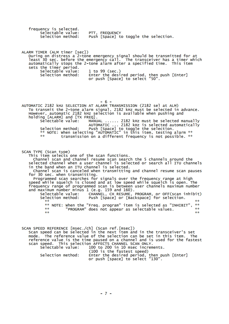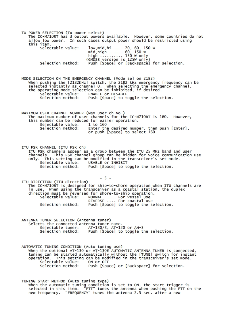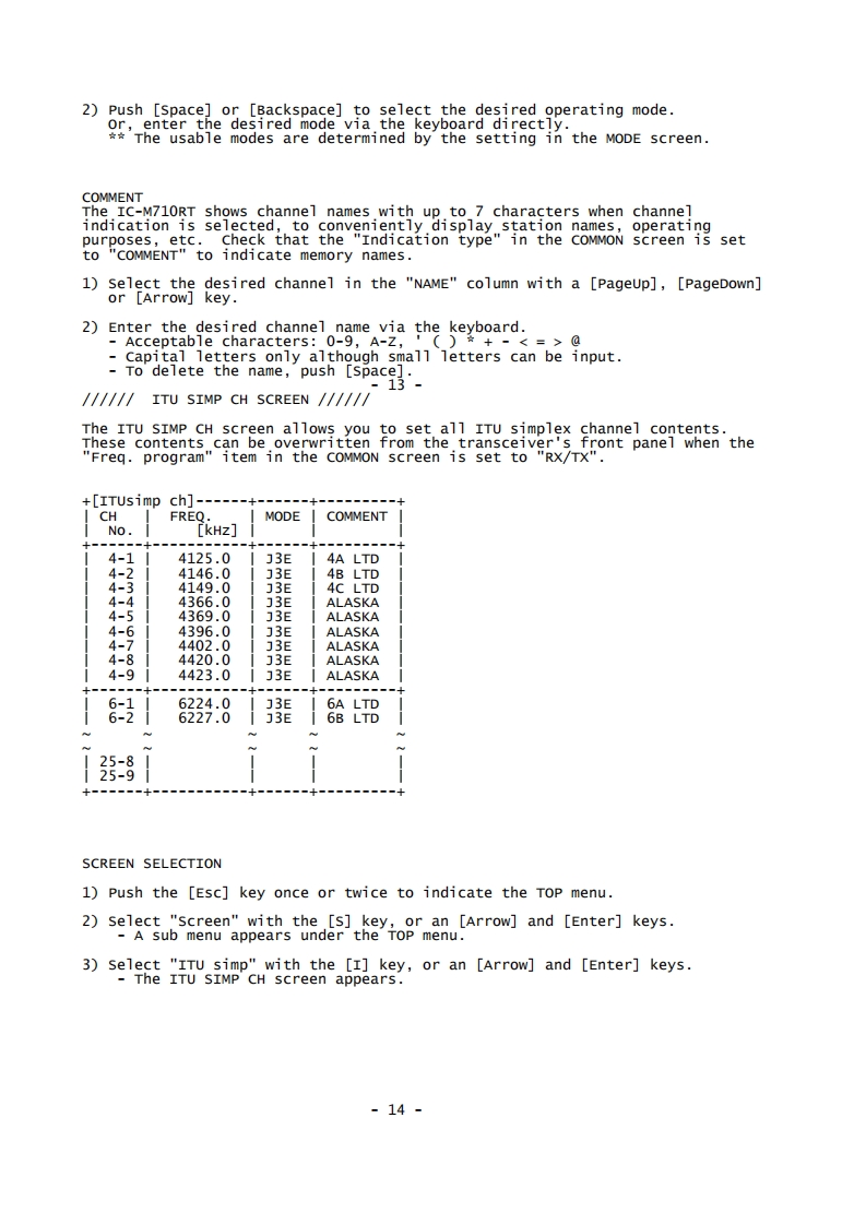 EX-2144 FIELD PROGRAMMING SOFTWAREFor the IC-M710RT(C)1998 Icom Inc.Rev 1.01Portions of the software copyrighted by Microsoft Corporation 1982-1988☆☆★☆This program is designed to perform cloning for the★IC-M710RT MF/HF MARINE TRANSCEIVER on ly.★★Before using.the program,make a backup copy of the *★★original disk.☆★☆★☆TABLE OF CONTENTS1.PROGRAM START UP AND SHUT DOWN2.OPERATION33.SCREEN DESCRIPTIONCOMMON SCREEN.USER CH SCREEN.12ITU SIMP SCREEN ..14FREQ RANGE SCREEN16MODE SCREEN············184.CLONING OPERATION.·.·······205.FILE SAVING AND LOADING............2224-1-1.PROGRAM START UP AND SHUT DOWN1)Boot up DoS.(Microsoft(R)windows(R)3.1/95 are not supported.2)Insert the EX-2144 backup disk.Please quit any applications which are using the RS-232c port(s).3)Type the start command:★★EX2144 /(option)/(version)[Enter]*★★★★1.#01,#02,#03,#06,#11,#12 can be used as"(version)".#01:U.S.A.General version#02:U.S.A.Marine version#03:U.S.A.GMDSS version#06:KOR version#11:Europe Marine version#12:Europe GMDSS version2.When the version is specified,the correspondingdefault settings are read.