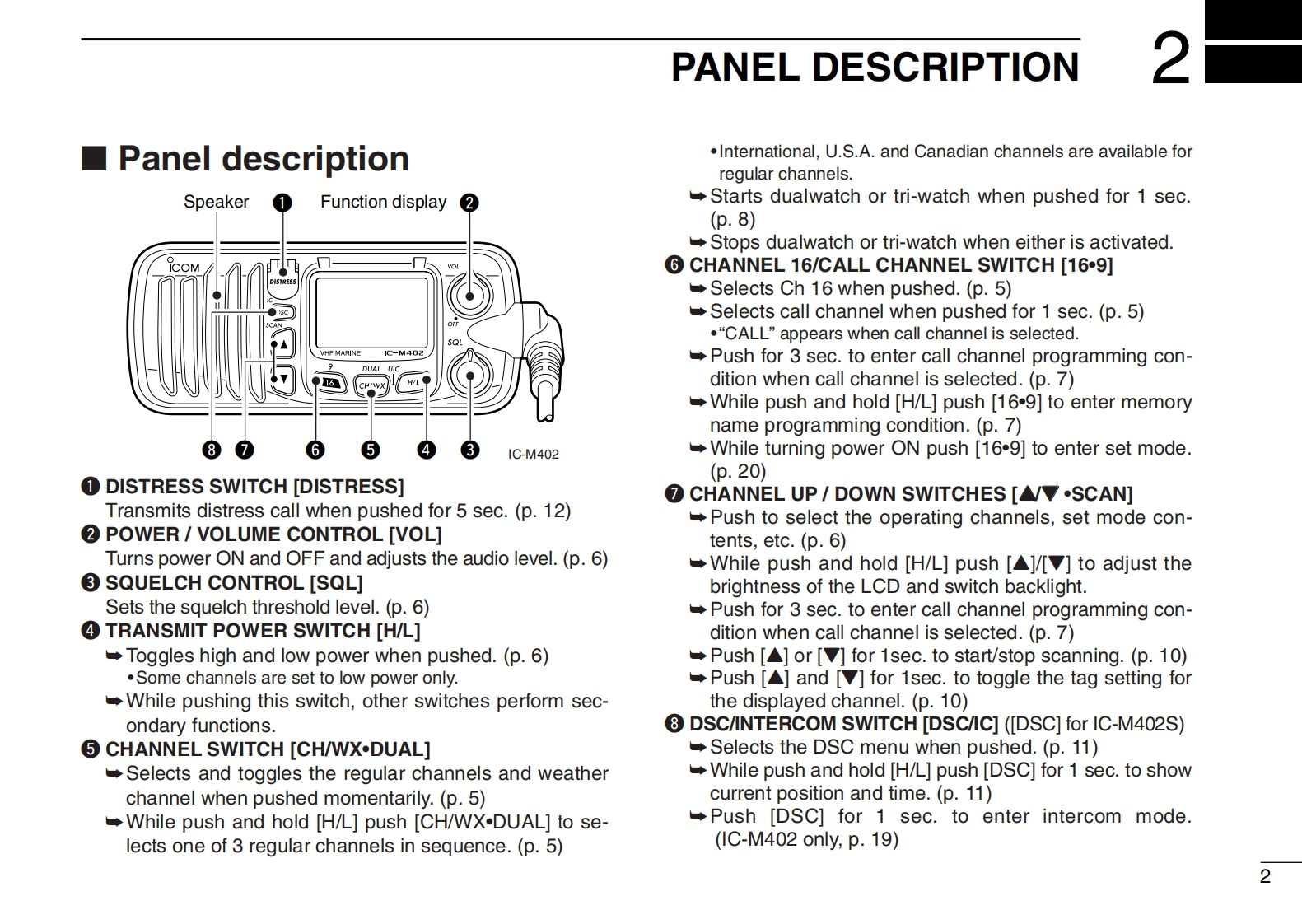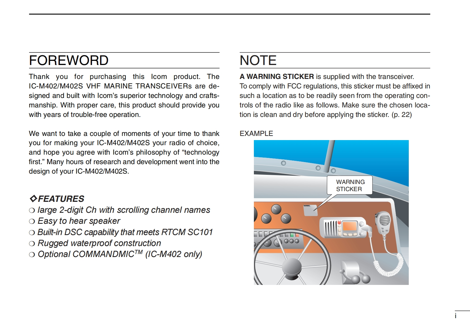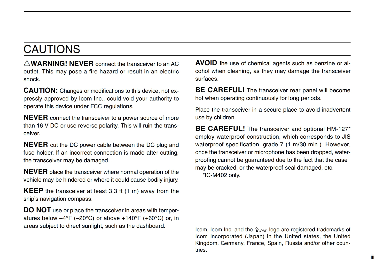COMINSTRUCTION MANUALVHF MARINE TRANSCEIVER1C-M402(REMOTE-CONTROL MIC COMPATIBLE)VHF MARINE TRANSCEIVERCOMVOLBUSYIC-M402SLOWVHF MARINE1C-M402This device complies with Part 15 of the FCC rules.Operation is sub-DUALject to the following two conditions:(1)This device may not cause16CH/WXH/Lharmful interference,and(2)this device must accept any interferencereceived,including interference that may cause undesired operation.1C-M402Icom Inc.