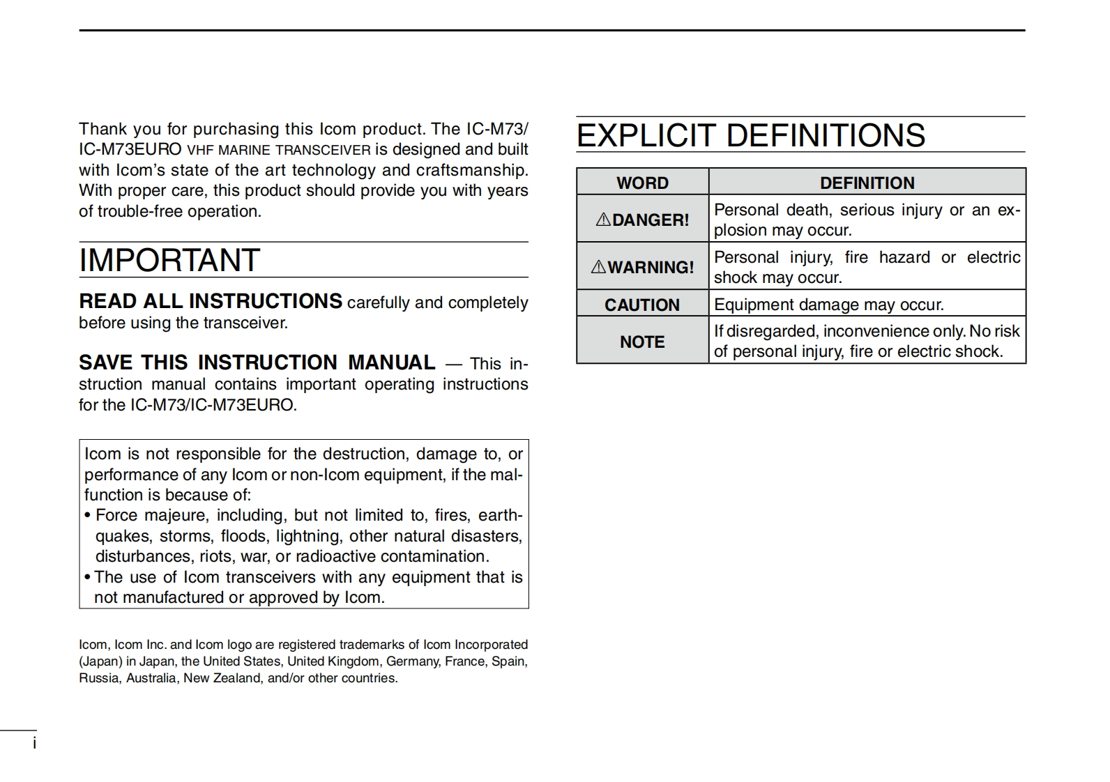 INSTRUCTION MANUALVHF MARINE TRANSCEIVERIC-M73IC-M73EUROCOMCOM北思CALLINGCALLINGIC-M73IC-M73EURO16/CFAV16/CYThis device complies with Part 15 of the FCC Rules.Opera-Cn兴CCHtion is subject to the condition that this device does not causeharmful interference.Icom Inc.1C-M73IC-M73EURO(These transceivers use the FA-S64V)
