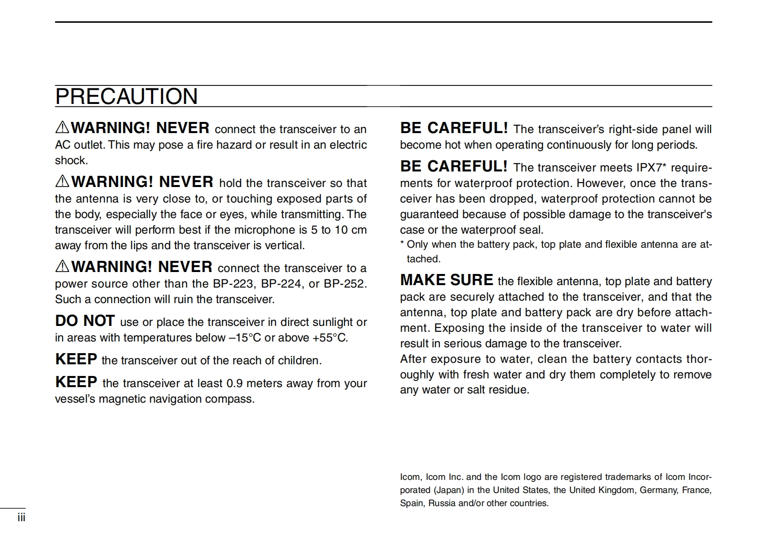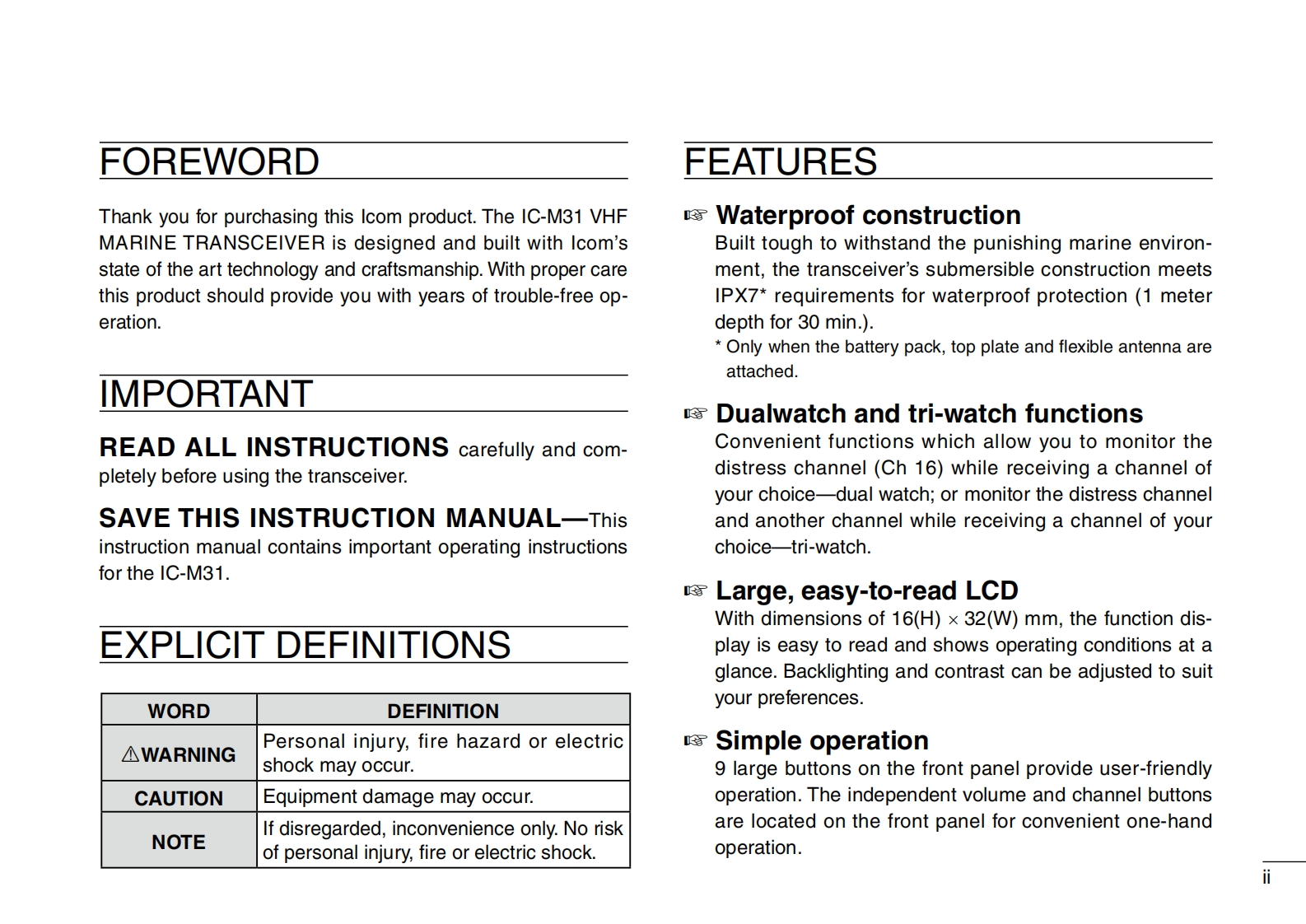 icom_icm31_使用说明书手册找手册网31天前发布关注私信1.38MB36页037icom_icm31_使用说明书手册此内容为付费资源,请付费后查看¥19¥21黄金会员免费钻石会员免费登录购买付费资源 第1页 / 共36页 第2页 / 共36页 第3页 / 共36页 第4页 / 共36页 第5页 / 共36页 第6页 / 共36页 第7页 / 共36页 第8页 / 共36页 第9页 / 共36页 第10页 / 共36页 试读已结束,还剩26页,您可下载完整版后进行离线阅读 THE END艾可慕 文本预览 INSTRUCTION MANUALVHF MARINE TRANSCEIVERC-M31COMO。DUAL16SCNDIAL+VOLIcom Inc. 查看更多 收起部分 喜欢就支持一下吧收藏