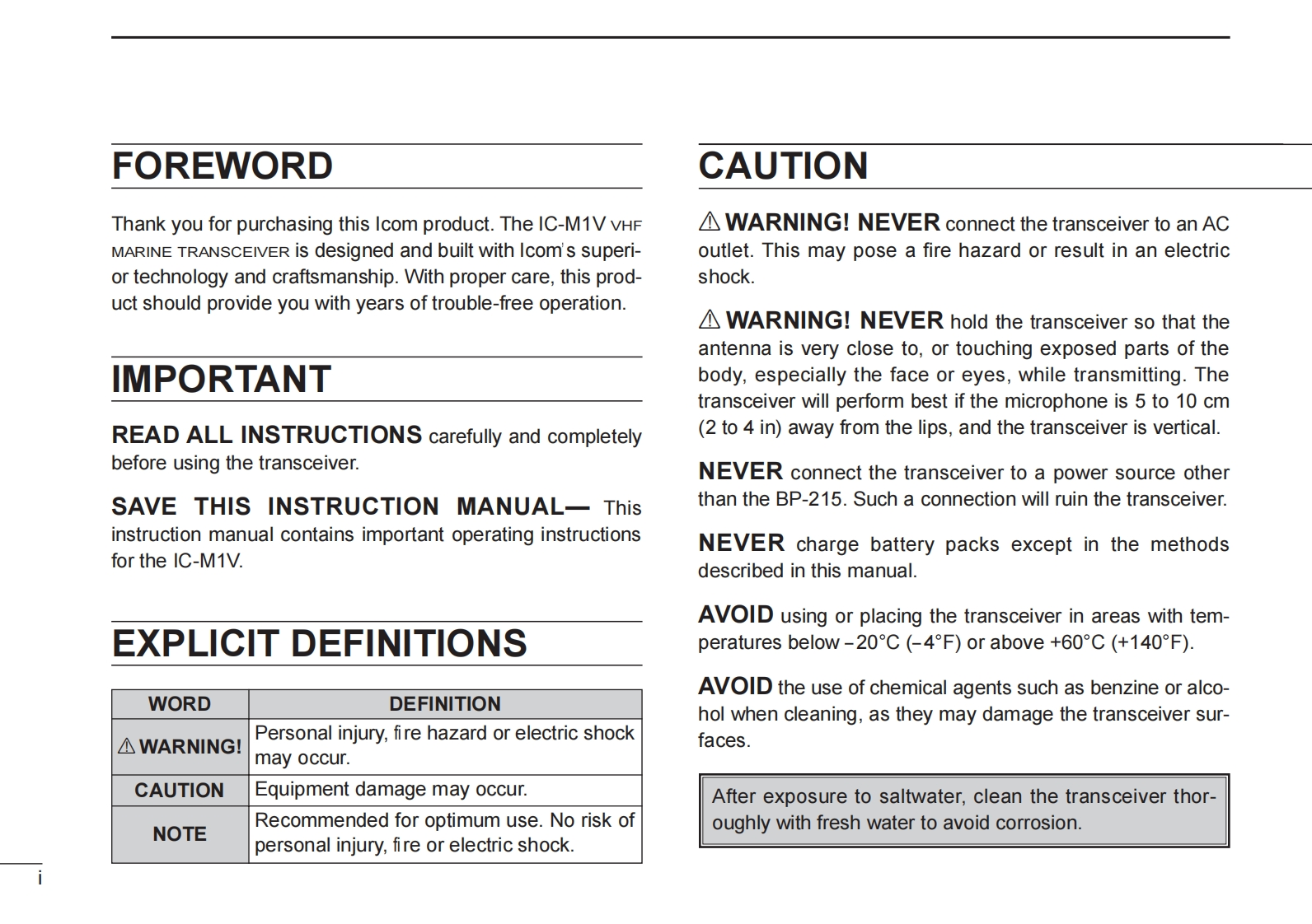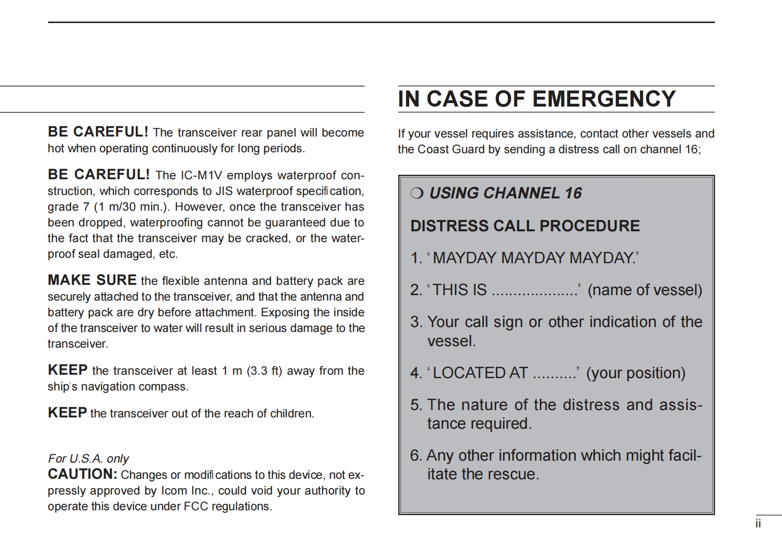 INSTRUCTION MANUALVHF MARINE TRANSCEIVERIC-MIV6This device complies with Part 15 of the FCC rules.Operation is sub-ject to the following two conditions:(1)This device may not causeharmful interference,and (2)this device must accept any interferencereceived,including interference that may cause undesired operation.ICOMIcom Inc.w