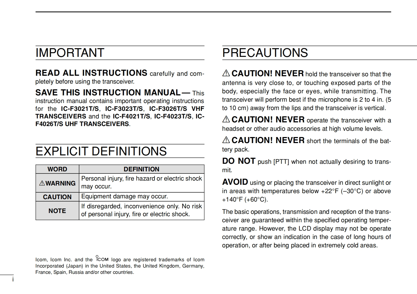 COMINSTRUCTION MANUALVHF TRANSCEIVERSIC-F3021T/S1C-F3023T/S1C-F3026T/SUHF TRANSCEIVERSIC-F4021T/SI-F4023T/SICOMIC-F4026T/SThis device complies with Part 15 of the FCC Rules.Operation isIcom Incsubject to the condition that this device does not cause harmfulinterference.Po7The photo shows the 10-key0Icom Inc.version VHF transceiver.