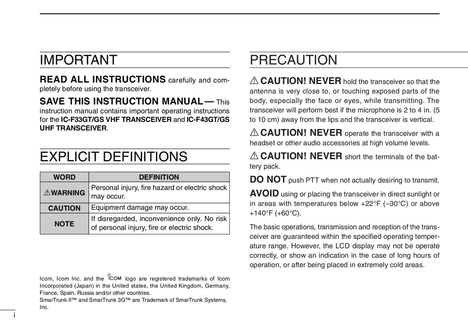 COMBIIS 1200CompatibleINSTRUCTION MANUALVHF TRANSCEIVERIC-F33GT/GSUHF TRANSCEIVERIC-F43GT/GSICOMThis device complies with Part 15 of the FCC Rules.OperationIcom Inc.is subject to the condition that this device does not causeharmful interference.P30Icom Inc.