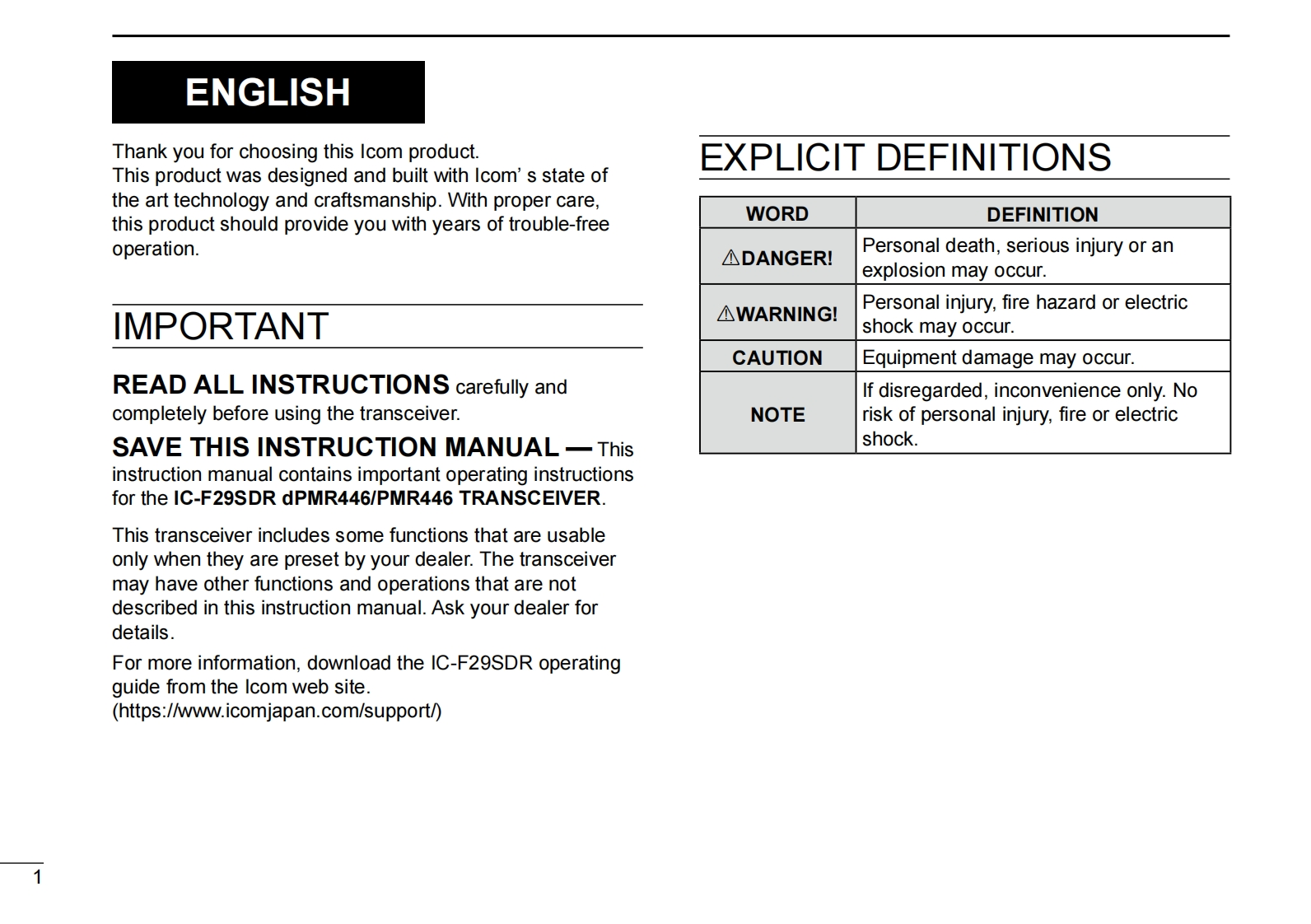 COMBASIC MANUALBASIS BEDIENUNGSANLEITUNGMANUAL BASICOdPMR446/PMR446 TRANSCEIVERaPMR446/PMR446-HANDFUNKGERATTRANSCEPTOR dPMR446/PMR446PORTATIF dPMR446/PMR446RICETRASMETTITORE dPMR446/PMR446NOTICE DE BASEIC-F29SDRMANUALE BASEIcom Inc.