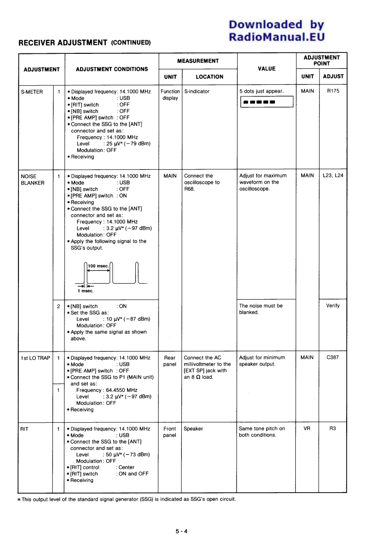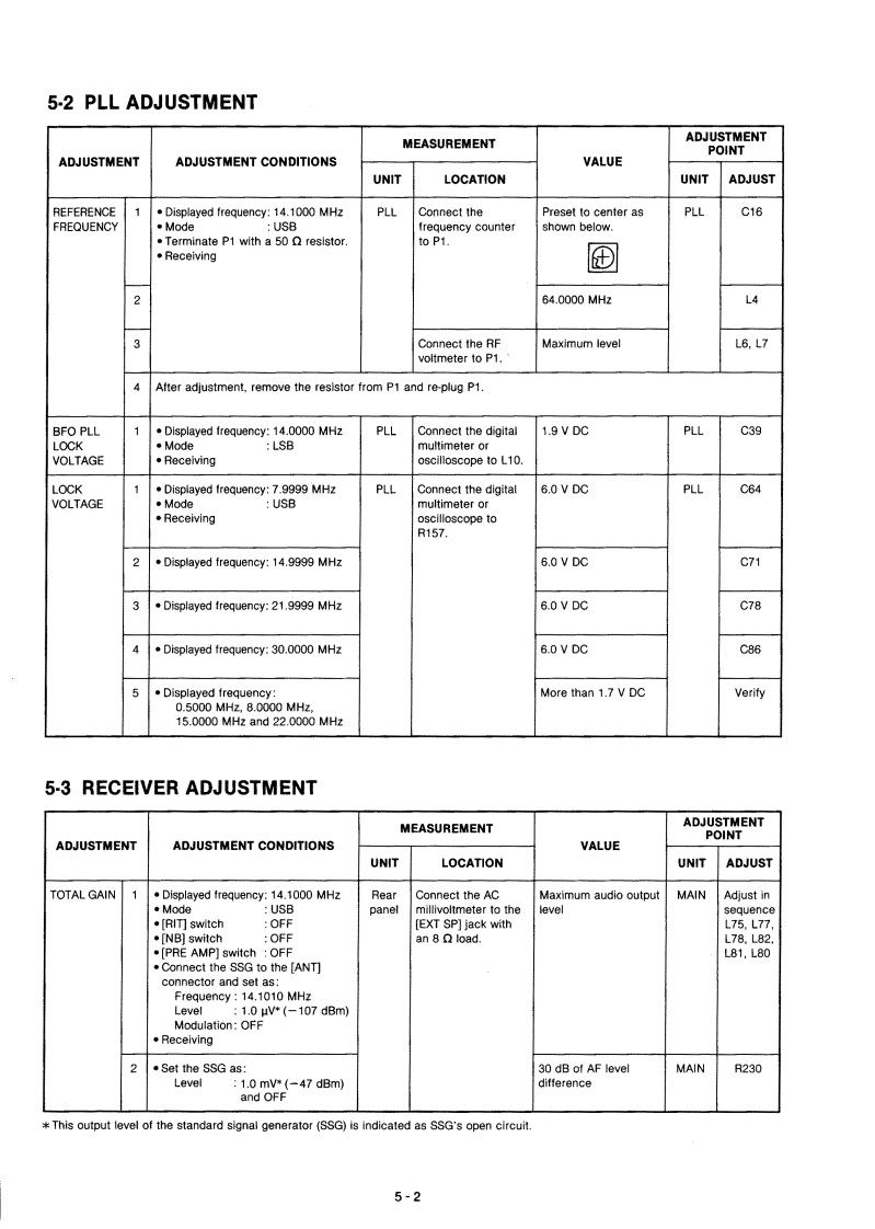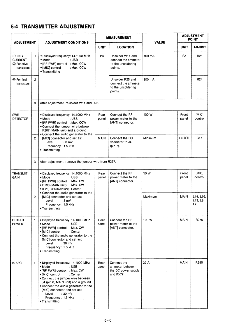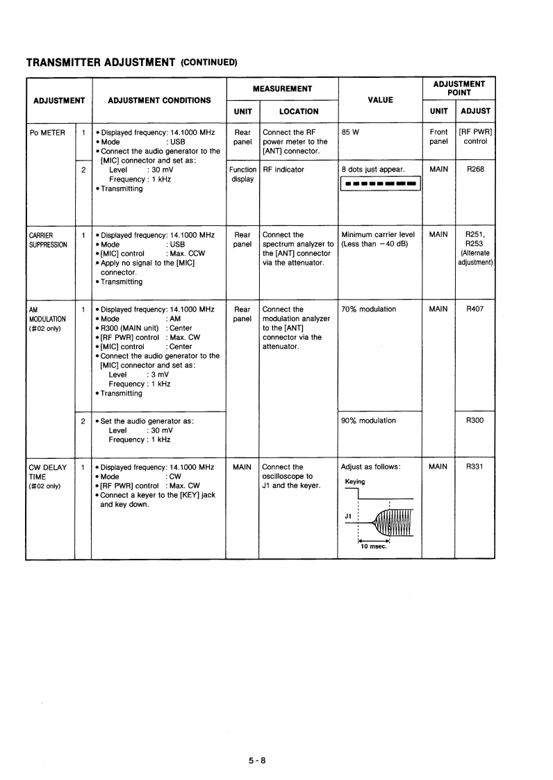 SECTION 5ADJUSTMENT PROCEDURES5-1 PREPARATION BEFORE SERVICINGREQUIRED TEST EQUIPMENTEQUIPMENTGRADE AND RANGEEQUIPMENTGRADE AND RANGEDC power supplyOutput voltage:13.8VDcAC millivoltmeterMeasuring range 10 mV-10 VCurrent capacity30 A or moreDC voltmeterInput impedance 50 kQ/DC or betterRF power meterMeasuring range:10-200wAmmeterMeasurement capability:1 A and 30 A(terminated type)Frequency range:1.8-30MHzImpedance:50QAudio generatorFrequency range:300-3000MHzSWRLess than 1.2:1Output level:1-500mWFrequency counterFrequency range:0.1-100MHzAttenuatorPower attenuation50 or 60 dBFrequency accuracy:1 pom or betterCapacity150 W or moreSensitivity100 mV or betterSpectrum analyzerFrequency range:At least90MHzRF voitmeterFrequency range:0.1-100MHzSpectrum bandwidth:+100 kHz or moreMeasuring range:0.01-10VFM deviation meterFrequency rangeAt least 30 MHzDigital multimeterInput impedance 10 MQ/DC or betterMeasuring range:0to±10kHzStandard signalFrequency range:0.1-100MHzModulation analyzerFrequency range At least 30 MHzgenerator (SSG)Output level:0.1uV-32mVMeasuring range:0-100%(-127to-17dBm)External speakerImpedance:80Distortion meterFrequency range:1kH土10%Max.input power:5wMeasuring range:1-100%OscilloscopeFrequency rangeDC-20 MHzMeasuring range:0.01-10VCW:ClockwiseCCW:Counterclockwise■CONNECTIONSpectrumanalyzerFM deviationAttenuatorStandard signalmeter50 or 60 dBgeneratorModulationanalyzerRF power meter200W/50QCAUTION:DO NOT connect theto [KEY]Keyersignal generator whiletransmitting.toD013.8to the[ANT]to [EXT SP]DC power supplyconnector13.8V/30AMicrophone connectorAC(Front panel view)millivoltmeter881C-77Pin 1MIC INPUTAudioSpeakePin 7 GNDgenerator-(Microphone-ground)PTTDownloaded byRadioManual.EUtoMC匈5-1