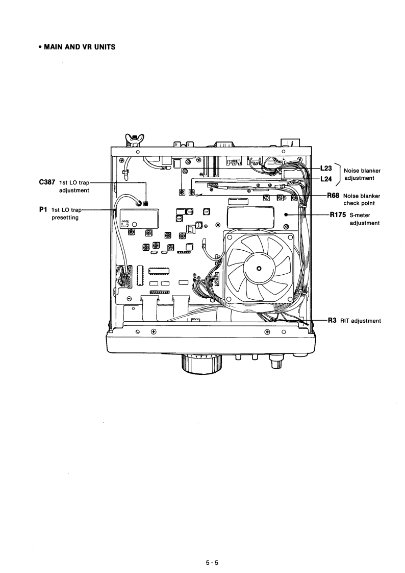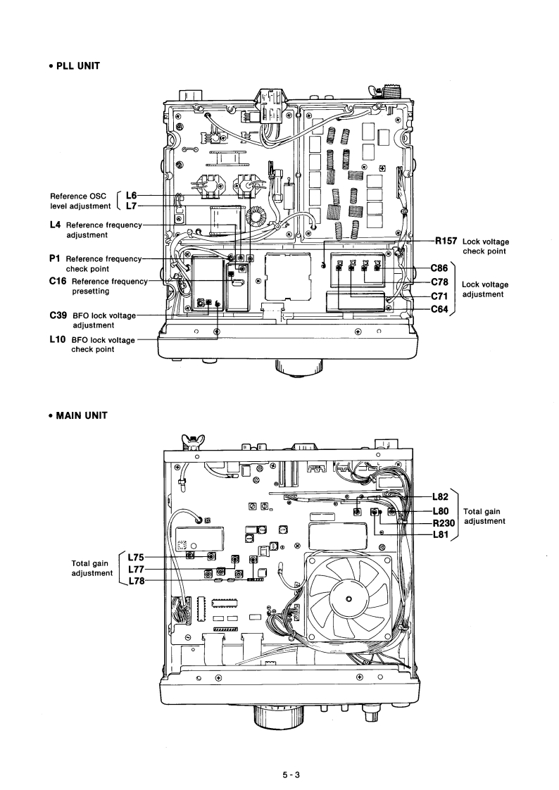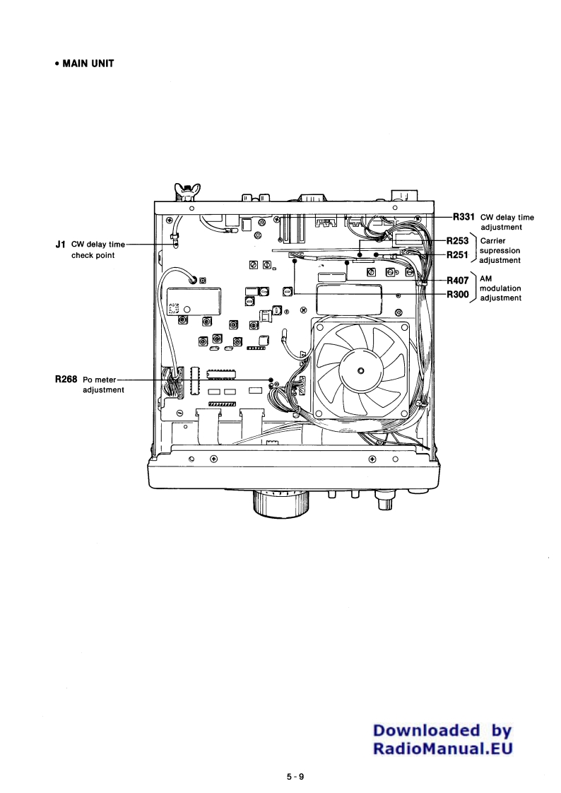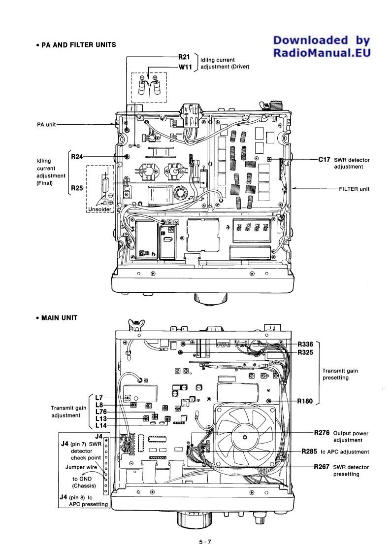 SECTION 5ADJUSTMENT PROCEDURES5-1 PREPARATION BEFORE SERVICINGREQUIRED TEST EQUIPMENTEQUIPMENTGRADE AND RANGEEQUIPMENTGRADE AND RANGEDC power supplyOutput voltage:13.8VDcAC millivoltmeterMeasuring range 10 mV-10 VCurrent capacity30 A or moreDC voltmeterInput impedance 50 kQ/DC or betterRF power meterMeasuring range:10-200wAmmeterMeasurement capability:1 A and 30 A(terminated type)Frequency range:1.8-30MHzImpedance:50QAudio generatorFrequency range:300-3000MHzSWRLess than 1.2:1Output level:1-500mWFrequency counterFrequency range:0.1-100MHzAttenuatorPower attenuation50 or 60 dBFrequency accuracy:1 pom or betterCapacity150 W or moreSensitivity100 mV or betterSpectrum analyzerFrequency range:At least90MHzRF voitmeterFrequency range:0.1-100MHzSpectrum bandwidth:+100 kHz or moreMeasuring range:0.01-10VFM deviation meterFrequency rangeAt least 30 MHzDigital multimeterInput impedance 10 MQ/DC or betterMeasuring range:0to±10kHzStandard signalFrequency range:0.1-100MHzModulation analyzerFrequency range At least 30 MHzgenerator (SSG)Output level:0.1uV-32mVMeasuring range:0-100%(-127to-17dBm)External speakerImpedance:80Distortion meterFrequency range:1kH土10%Max.input power:5wMeasuring range:1-100%OscilloscopeFrequency rangeDC-20 MHzMeasuring range:0.01-10VCW:ClockwiseCCW:Counterclockwise■CONNECTIONSpectrumanalyzerFM deviationAttenuatorStandard signalmeter50 or 60 dBgeneratorModulationanalyzerRF power meter200W/50QCAUTION:DO NOT connect theto [KEY]Keyersignal generator whiletransmitting.toD013.8to the[ANT]to [EXT SP]DC power supplyconnector13.8V/30AMicrophone connectorAC(Front panel view)millivoltmeter881C-77Pin 1MIC INPUTAudioSpeakePin 7 GNDgenerator-(Microphone-ground)PTTDownloaded byRadioManual.EUtoMC匈5-1