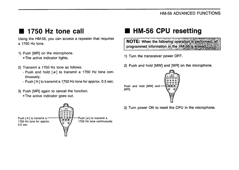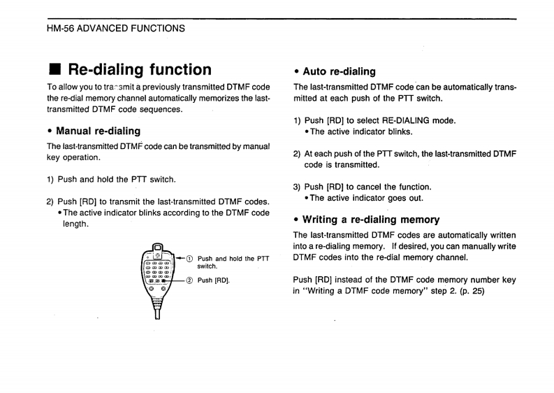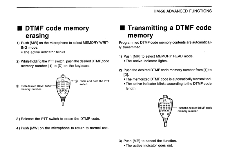 HM-56 ADVANCED FUNCTIONSThe HM-56 HAND MICROPHONE is equipped with 14 DTMFWriting a DTMF codecode memory channels and a re-dialing function for auto di-aling.Up to 22-digit telephone number,etc.can be memo-memoryrized into each memory channel.Program a DTMF code memory channel as follows.NOTE:Set [LOCK]on the microphone to the OFF posi-1)Push [MW]on the microphone to select the MEMORYtion to use HM-56 functions.WRITING mode..The active indicator blinks.■3 modes2)While holding the PTT switch,push the desired DTMF codememory number from [1]to [D]on the keyboard.The HM-56 has 3 modes as follows:Keep pushing the PTT switch.·MEMORY WRITING mode3)While pushing the PTT switch,push the desired keys upUsed when writing DTMF codes into a DTMF code memoryto 22 digits.channel..The active indicator blinks fast.4)Release the PTT switch.·MEMORY READING mode5)Push [MW]on the microphone to memorize the code intothe DTMF code memory channel.Used when reading DTMF codes from a DTMF code memorychannel.The active indicator lights continuously.-①Push and hold the PTTswitch.②Push the desired DTMF·RE-DIALING modecode memory number.Used when recalling the last-transmitted DTMF codes.The active indicator blinks slowly.other PDFclea母eght to youby mrvrigp在cm