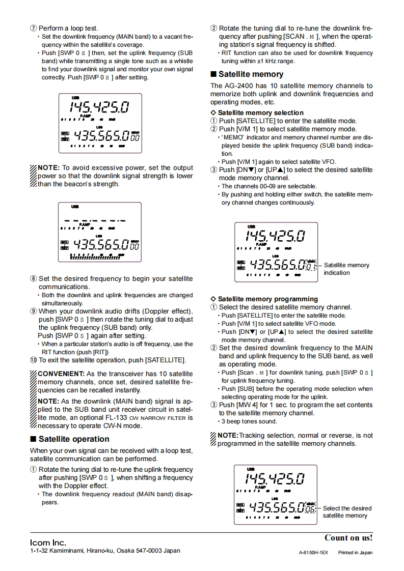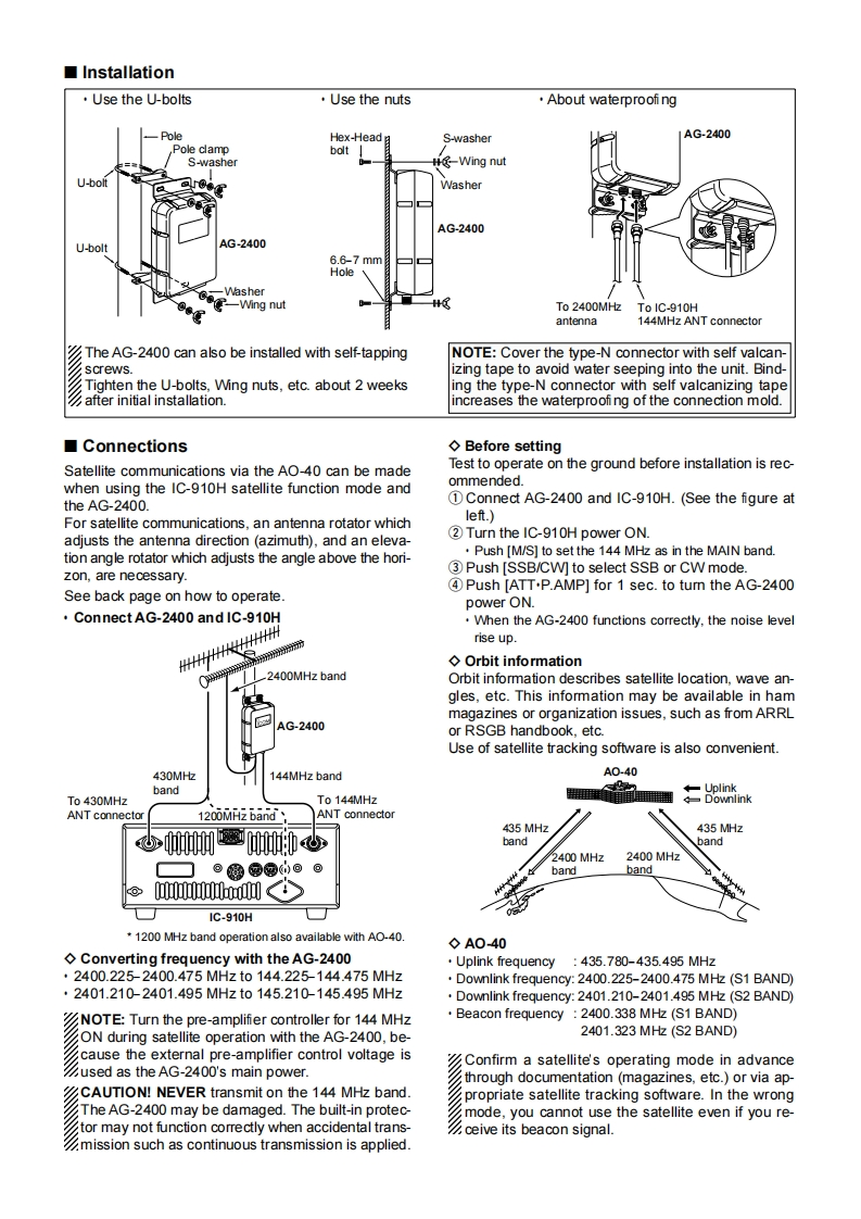 INSTRUCTION MANUALThank you for purchasing this Icom product.2.4 GHz DOWN CONVERTERThe AG-2400 is designed and built with Icom'sAG-2400superior technology and craftsmanship.Withproper care this product should provide you withyears of trouble-free operation.IMPORTANTEXPLICIT DEFINITIONSREAD THIS INSTRUCTION MANUALWORDDEFINITIONCAREFULLY before attempting to operating the AG-Personal injury,fire hazard or electric2400.AWARNINGshock may occur.SAVE THIS INSTRUCTION MANUAL-ThisCAUTIONEquipment damage may occur.manual contains important safety and operating in-NOTEIf disregarded,inconvenience only.No riskstructions for the AG-2400.of personal injury,fire or electric shock.PRECAUTIONSSPECIFICATIONS:2400-2402MHzCAUTION!The coaxial cable between this down·Receive frequency·Out put frequency:144-146MHzconverter unit and your transceiver should be clamped·Total gainMore than 25 dBto the antenna pole to prevent the down converter unit·Total NF valueLess than 1.5 dBfrom weighing down the preamplif er.Input/Output connector Type-NKEEP the unit away from TV or radio antennas toAntenna impedance:502GroundingNegative groundingprevent interference.·Power consumptionApprox.200 mACAUTION FOR INSTALLATIONDimensions(Projections not included)AG-2400 is intended for professional installation only.:172W0×69.5(H×230(D)mmWe are not responsible for any building breakage,any:622W)×294(Hx9h6(D)indamage resulting from a drop of the AG-2400 from a·Veight(approx.):1.18kg;2.6b410zhigh place or unstable site resulting in personal injury,nor any accident in any other cases.If the AG-2400must be installed at such high place or unstable site,SUPPLIED ACCESSORIESbe sure to consult an expert engineer.◇FEATURESO Down Converter for satellite (AO-40)inS-mode operationO Built-in Low Noise Amplifier (LNA)3(oTotal NF value is less than 1.5 dB.41Conversion Gain is more than 25 dB®O Built-in Receiver-Suppression-Control Fil-⑤⊙-⊙-8--⊙ter closes up the uplink and downlinkantennas.(1.8 feet at the minimum)①U-boltsO Built-in the Receiving Protection Circuit….2②U-bolt platesThe built-in circuit protector may not function cor-2rectly when the accidental transmission such as③Washers(M6)4continuous transmission is applied.Such transmis-④Spring washers(M6).4sion is out of the specifed guarantee for accidental⑤Wing nuts(M6)..….4transmission damage to the AG-2400.6Hex head bolts (M6x50)...........................4O Waterproof,weather resistance and pre-⑦Self-tapping screws(6x30A0)...4vention from rusting due to salt water.Instruction manualO No power cable wiring is necessary.Icom,Icom Inc.and the icoM logo are registered trademarks of lcomIncorporated (Japan)in the United States,the United Kingdom,Ger-many,France,Spain,Russia and/or other countries.