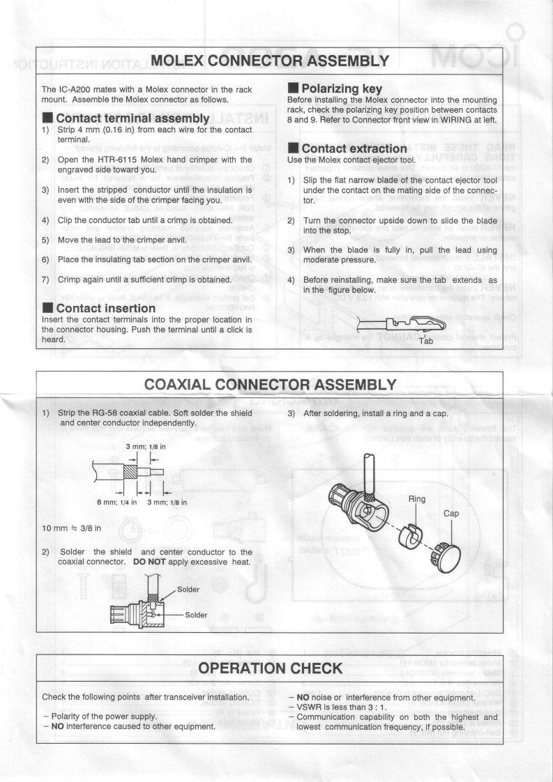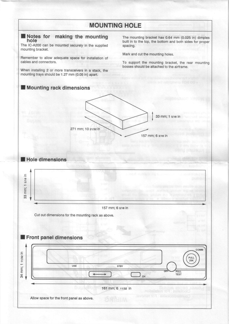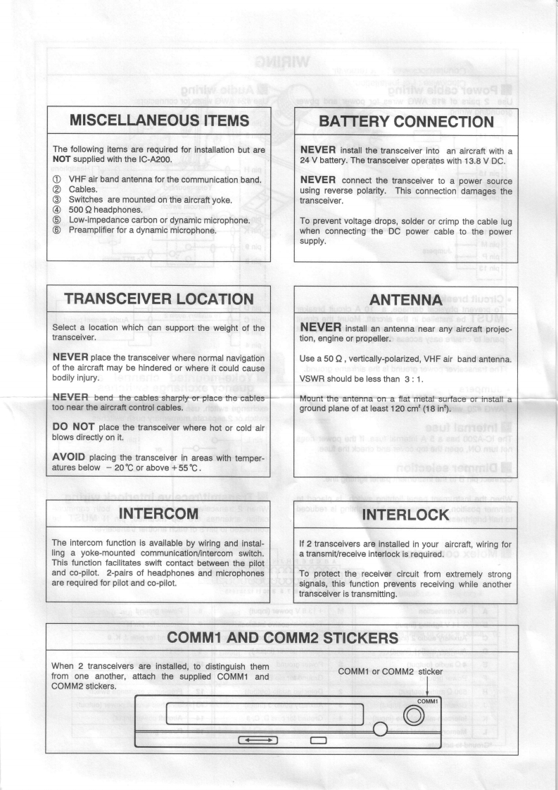 COM1C-A200INSTALLATION INSTRUCTIONSIMPORTANTINSTALLATION PROCEDUREREAD THESE INSTALLATION INSTRUC-TIONS CAREFULLY before attempting to installInstall the IC-A200 according to the following procedure.the IC-A200 in an aircraft.This sheet contains importantCheck the quantity of parts.Refer to UNPACKING.safety instructions for the IC-A200.②Prepare miscellaneous items required for instal-lation.Refer to MISCELLANEOUS ITEMS.NEVER install the transceiver where normal navi-3Prepare required wiring.Refer to MOLEX CONNEC-gation of the aircraft may be hindered.TOR ASSEMBLY,COAXIAL CABLE ASSEMBLY andWIRING.NEVER install an antenna near any aircraft projection.Assemble supplied mounting bracket and otherengine,or propellerparts.Refer to RACK MOUNT ASSEMBLY.Cut the mounting hole.Refer to MOUNTING HOLE.INSTALL a circuit breaker between the aircraft battery④Mount the IC-A200 into the mounting bracket.Referand the IC-A200.to RACK MOUNTING.⑦Check the IC-A200 operation.Refer to OPERATIONNEVER install the transceiver in an aircraft with a 24 VCHECK.battery.The transceiver operates with 13.8 V DC.Set protect channels,if required.Refer to MEMORYPROTECTION.Check operation after installationProtect channel content CANNOT be changed by acustomer.UNPACKINGThe following parts are supplied with the IC-A200Make sure you have received all parts and that there isInspect the quantity of each part carefully.no shipping damage.①②③④⑤⑥⑦⑧⑨⑩①②0冒④⑤⑥⑦口①Mounting bracket....Nut (No.6)........Molex connector (4338-15).1①Screw(N0.6×1/2)Molex terminals (4366-GL).........30.6④Screws (No.4X1/2)...Crimp nuts(N0.6)…Screw(No.6×1/2)..⑤BNC L-shaped antenna connector.................set46⑥Washer (lcom washer V)...1COMM1 StickerCOMM2 sticker....⑦GFuses (5 A).......C-shaped ring...Antenna cable clip.1Molex polarizing key....2⑨Self-crimping nut (No.6).