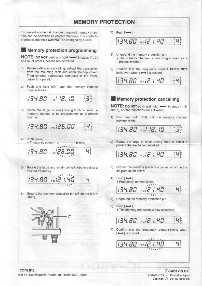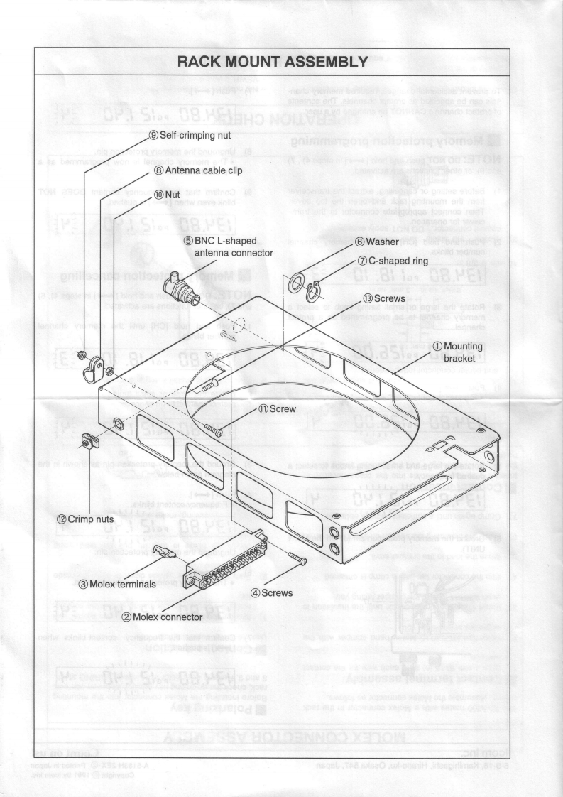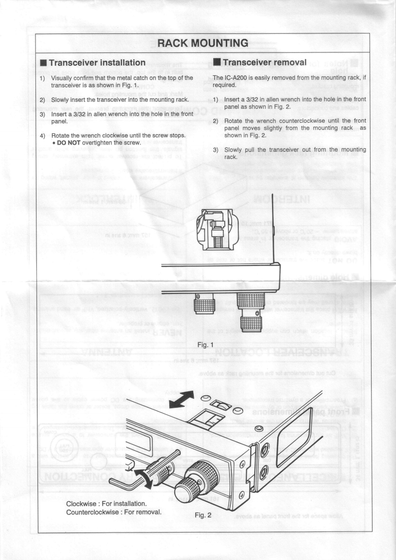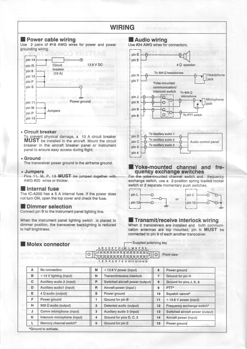 COM1C-A200INSTALLATION INSTRUCTIONSIMPORTANTINSTALLATION PROCEDUREREAD THESE INSTALLATION INSTRUC-TIONS CAREFULLY before attempting to installInstall the IC-A200 according to the following procedure.the IC-A200 in an aircraft.This sheet contains importantCheck the quantity of parts.Refer to UNPACKING.safety instructions for the IC-A200.②Prepare miscellaneous items required for instal-lation.Refer to MISCELLANEOUS ITEMS.NEVER install the transceiver where normal navi-3Prepare required wiring.Refer to MOLEX CONNEC-gation of the aircraft may be hindered.TOR ASSEMBLY,COAXIAL CABLE ASSEMBLY andWIRING.NEVER install an antenna near any aircraft projection.Assemble supplied mounting bracket and otherengine,or propellerparts.Refer to RACK MOUNT ASSEMBLY.Cut the mounting hole.Refer to MOUNTING HOLE.INSTALL a circuit breaker between the aircraft battery④Mount the IC-A200 into the mounting bracket.Referand the IC-A200.to RACK MOUNTING.⑦Check the IC-A200 operation.Refer to OPERATIONNEVER install the transceiver in an aircraft with a 24 VCHECK.battery.The transceiver operates with 13.8 V DC.Set protect channels,if required.Refer to MEMORYPROTECTION.Check operation after installationProtect channel content CANNOT be changed by acustomer.UNPACKINGThe following parts are supplied with the IC-A200Make sure you have received all parts and that there isInspect the quantity of each part carefully.no shipping damage.①②③④⑤⑥⑦⑧⑨⑩①②0冒④⑤⑥⑦口①Mounting bracket....Nut (No.6)........Molex connector (4338-15).1①Screw(N0.6×1/2)Molex terminals (4366-GL).........30.6④Screws (No.4X1/2)...Crimp nuts(N0.6)…Screw(No.6×1/2)..⑤BNC L-shaped antenna connector.................set46⑥Washer (lcom washer V)...1COMM1 StickerCOMM2 sticker....⑦GFuses (5 A).......C-shaped ring...Antenna cable clip.1Molex polarizing key....2⑨Self-crimping nut (No.6).