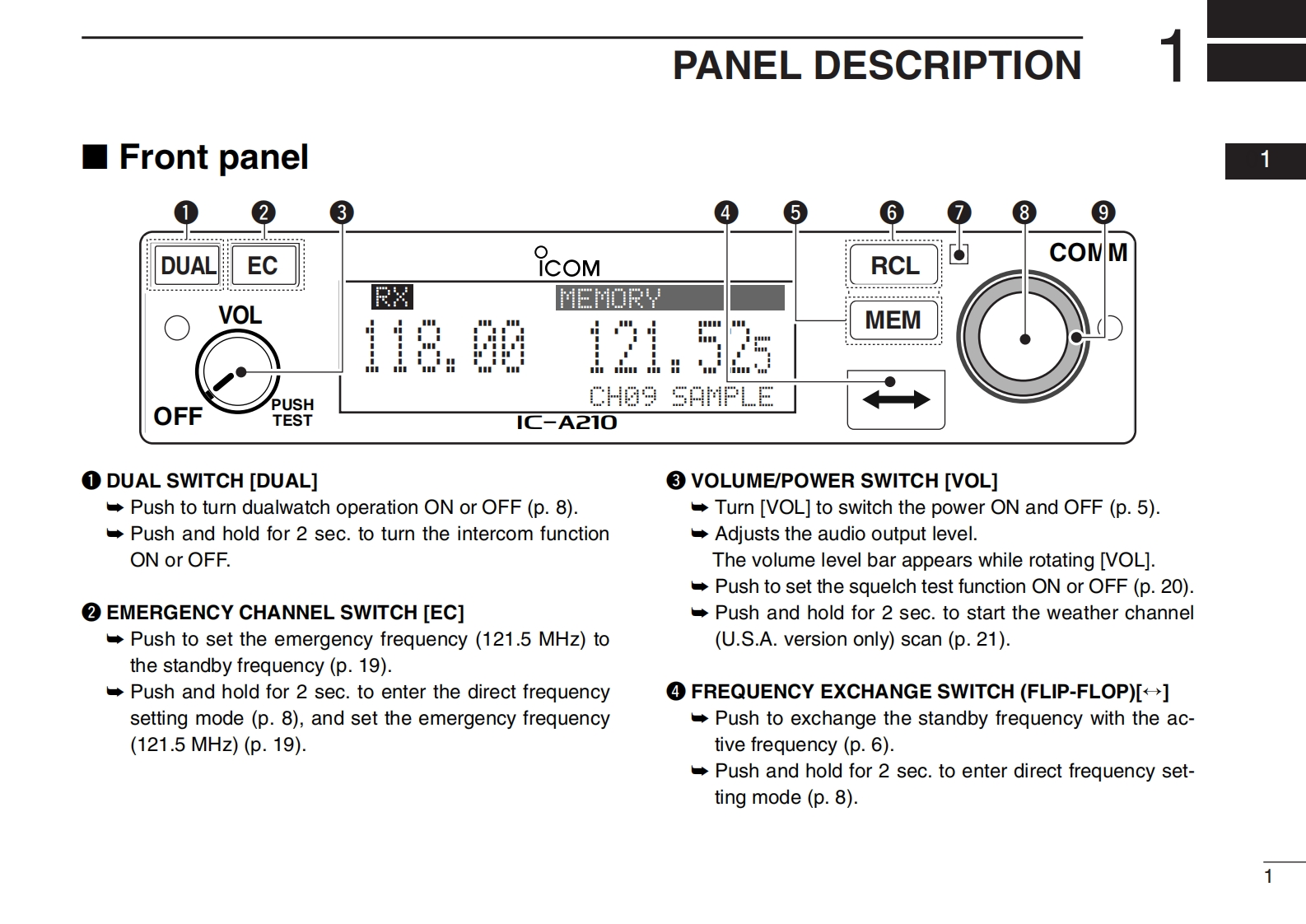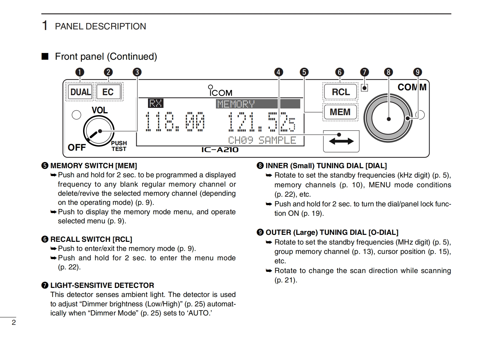 INSTRUCTION MANUALDUALECCOMRCL◆COMMVOL丑VHF AIR BAND TRANSCEIVER118.00136.975MEM1C-A210OFFIC-A210This device complies with Part 15 of the FCCRules.Operation is subject to the condition that thisdevice does not cause harmful interference.Icom Inc.