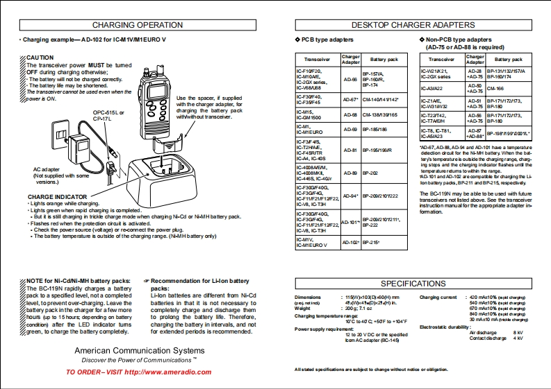COMATTACHING A DESKTOP CHARGER ADAPTERThank you for puchasing the BC.119NDESKToP CHARGER.The BC-119N chargesThere are 2 deskop charger adapter typesFor types requiring the AD-75/AD-88:for the BC-119N.One has a PCB,the otherDESKTOP CHARGERa Ni-Cd or Ni-MH battery pack in approx.Install the optional AD-75 or AD-88 to the1-2 hrs.,or a Lion batlery pack ndoes not.The non-PCB types require anBC-119N with 4 scsews (supplied with theAD.BC-119Napprox.2-3 hes.addisonal PCB (AD-75 or AD-88).For some75/AD-88),then attach a desktop chargerPlease read these instructions thoroughlyversions,the AD-75 or AD-88 is already inadapter to the BC-119N.See the trans-before operating the BC-119N.stalled in the BC-119N.cevver's ins truction manual for an approveddesktop charger adapter.◆For the PCB types:Installing the AD-75/AD-88Connect the plugs of an appropriate desk-CAUTIONtop charger adapter and the BC-119N,theninstalled the adapter with the screws sup.A WARNING!To reduce the risk of injury.Make sure battery and charger con-pled with the adapter).For some versions,thecharge only specifed lcom Ni-Cd,Ni-MHtacts are aways dean,otherwise batdeskop charger adapter is aleady installed.or Li-lon rechargeable battery packs.teries may not fuly charge.Installing the PCB type adapterOther types of battery packs/cases maySAVE THESE INSTRUCTIONS!Theseburst,causing damage and personalinstructons contain important safety andinjury.operating details for the BC.119N.AUSE INDOORS ONLYI NEVER exposeNot usedAn appeopriate desktop charger adapterSee NOTE belowthe charger to main,snow or any lquids.must be purchased separately to chargeNEVER et metal,wire,etc.touch anyyour lcom battery packs.intemal part ofthe chager.Installing the non-PCB type adapterNEVER incinerate used battedes.ThisIn order to get the maximum lfe out of yourmay cause an explosion.Ni-Cd battedes:NEVER use the charger when it is covered1.Avvoid overcharging-batteries must beby objects which impede heat dispersal.removed from the charger to stopSee NOTE beowcharging.Batteries should not bePlace the charger in a secure place tocharged for more than 15 hours afterNOTE:Some of the PCB type desktopavoid inadvertent use by children.the LED indicator tums geen.charger a时apters{nd.A0-758朗do notAVOID charging in conditons of extreme2.Use the batteries untl they becomeneed comection of the 3-phn comector.cold (under 10C:+50PF)or extreme heatalmost completely exhausted underThe comection is requ■ed④ny for the(over +40C:+104*F).Battedies may notnormal condtons.instaling adapter that is compatble withcharge under extreme temperatures.If your batleries seem to have nocharging a Li-lon battery pack.Keep the charger away from TV sets orcapacity even after being fuly charged,radios to prevent interlerence.completely dischange them,then fullyANEVER attempt to charge akaline orcharge them again.If they still do notACAUTIONFiox the connector withdry cell batteries.They may burst causingretain a charge (or very lice),new batAbout the 3-pin