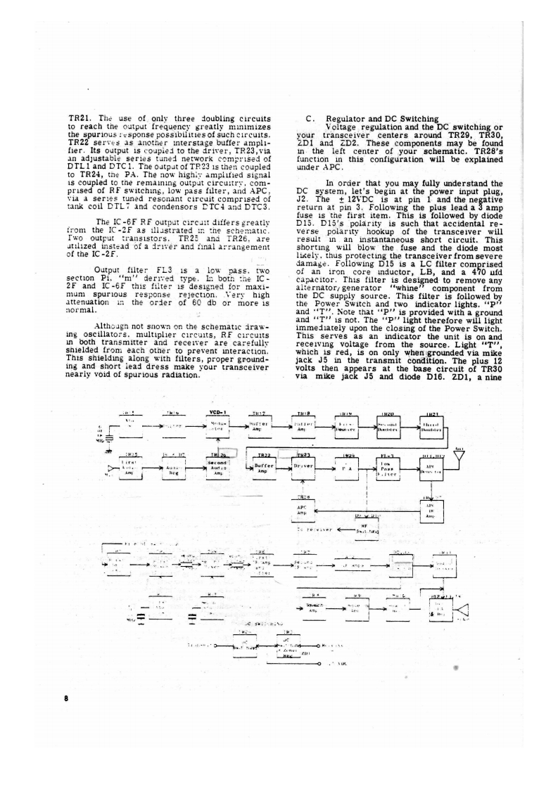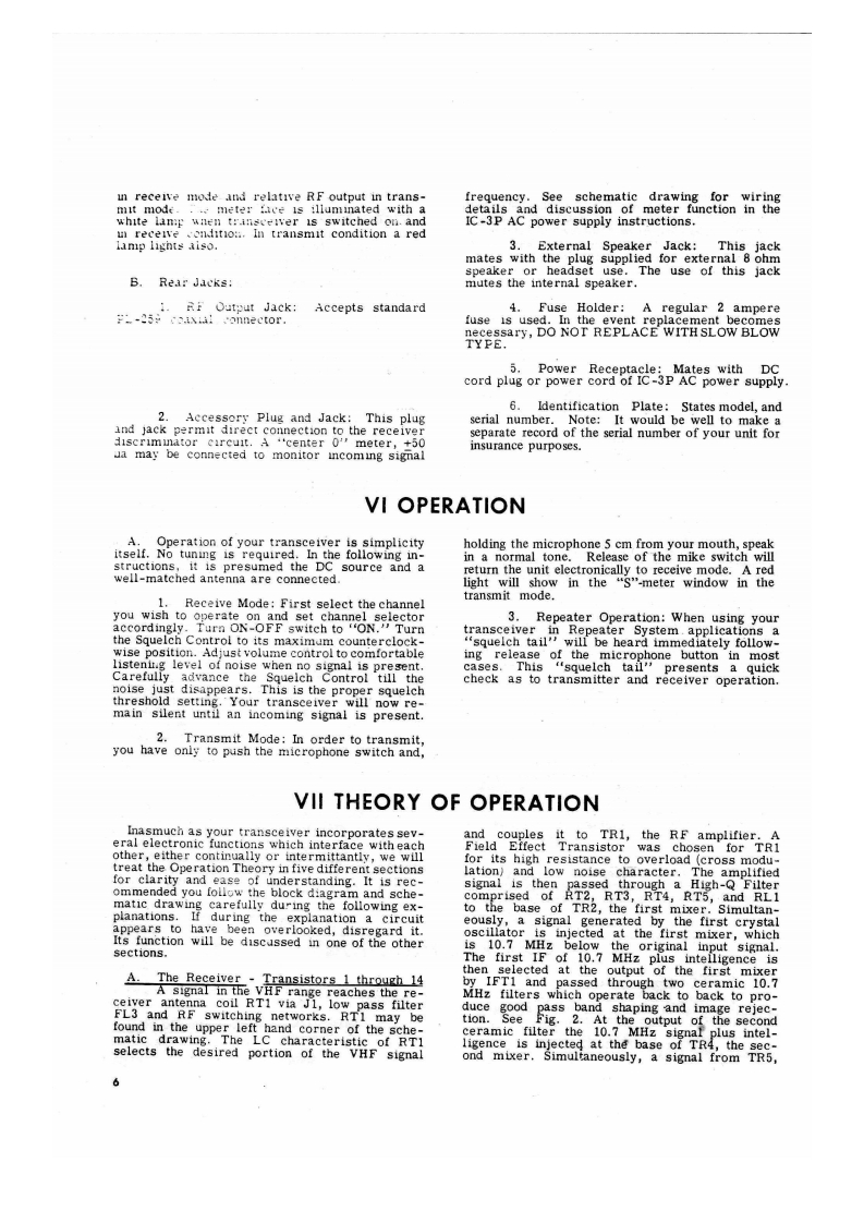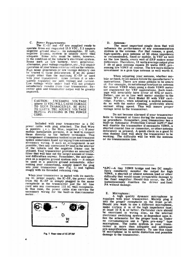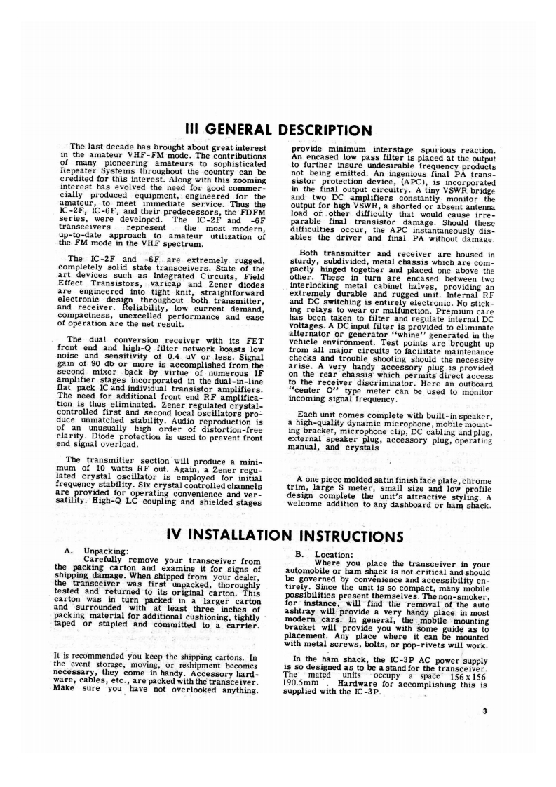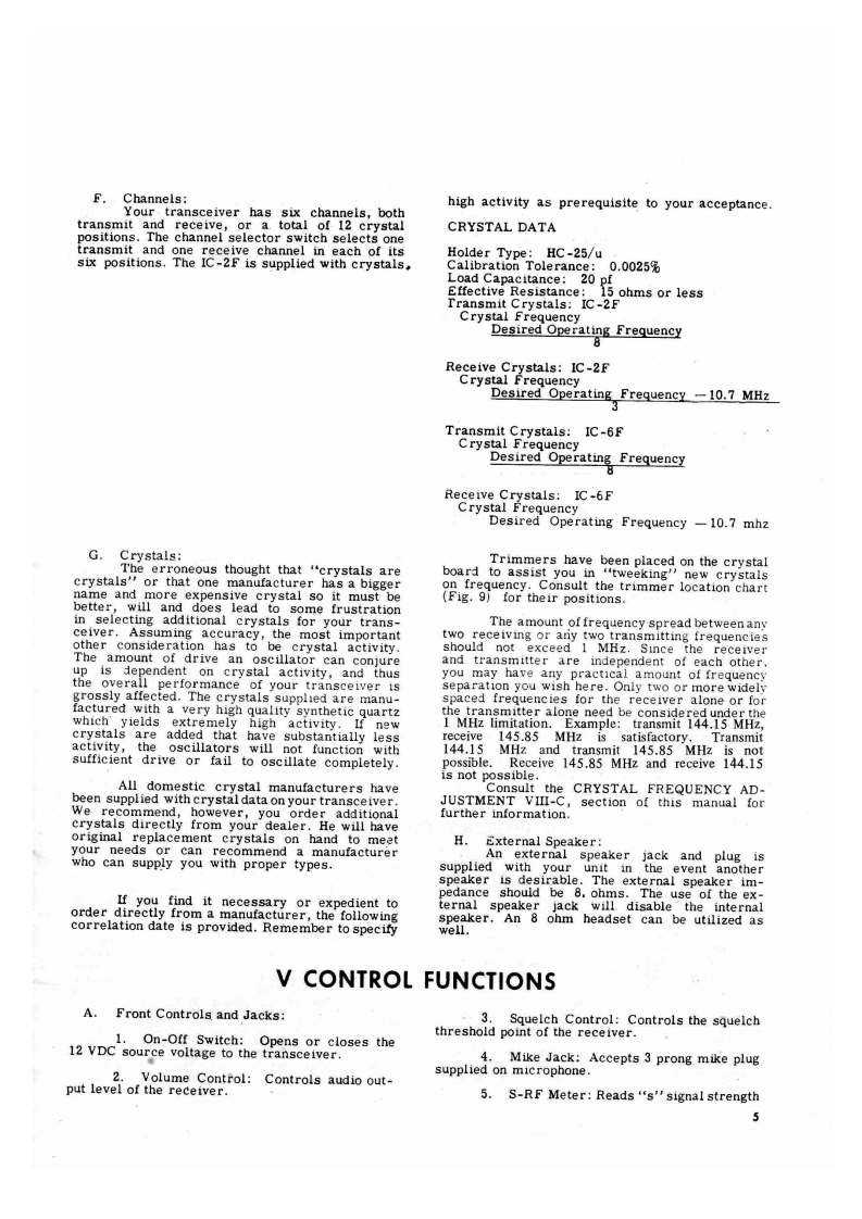 I INTRODUCTIONInoue IC-2F 2meter FM trans-ceiver and its 6 meter counterpart,the IC-6Fare the finest commereially produced products forthe VHF-FM amateur enthusiast available.Nocorners have been cut in engineering,design,con-struction,or performance.The completely solidstate character of the units is fully State-of-the-Art.Many new innovations for convenience andsuperior performance have been incorporated aswell.We recommend that you take the time nowto carefully read the contents of this manual andbecome acquainted with this extraordinary trans-ceiver.You may be sure of many,many hours oftrouble-free operating pleasure ahead and the prideof ownership that comes from having the best.II SPECIFICATIONSFREQUENCY COVERAGE:IC-2F,144 to 148 MHz:IC-6F,50 to 54 MHzNote:Maximum frequency spread of 1 MHz recommended between any two receive frequencies or anytwo transmit frequencies.Six channels available.SI2E:58 mm high x 156 mm wide x 216 mm deep.WEIGHT:2kgFRONT PANEL CONTROLS AND JACKS:Channel switch,on-off switch,volume control,squelch control,microphone jack.REAR JACKS:Antenna jack,accessory socket,external speakerANTENNA INPUT:jack,fuse holder,power socket.50 to 52 ohmsPOWER REQUIREMENTS:CURRENT DRAIN:13.5 VDC 1.5 VDC,negative groundReceive-125 mA average;Transmit-2.5 ARECEIVER SPECIFICATIONS:Type:Double conversionSensitivity:Better than 0.4 uv@20 db of quietingFirst IF:10.7 MHzSecond IF:455 KHzSpurious Response:-60dbSquelch:Adjustable -5 to-15 dbBandwidth:±15KHz@6 db pointAudio Output Power:wattOutput Impedance:8 ohmsFrequency Control:Crystal(45 MHz)TRANSMITTER SPECIFICATIONS:Power Input:20 wattsRF Power Output:10 watts minimumFrequency Control:Crystal(18 MHz)Maximum Frequency Deviation:Adjustable up to 15 KHzAudio Input:10KNote:As is our custom,the stated specifications are the mini-mum performance that may be expected.It is not unusualfor owners to experience better performance,i.e.,0.1ONuv receiver sensitivity or 14 watts output froma givenc-6unit.