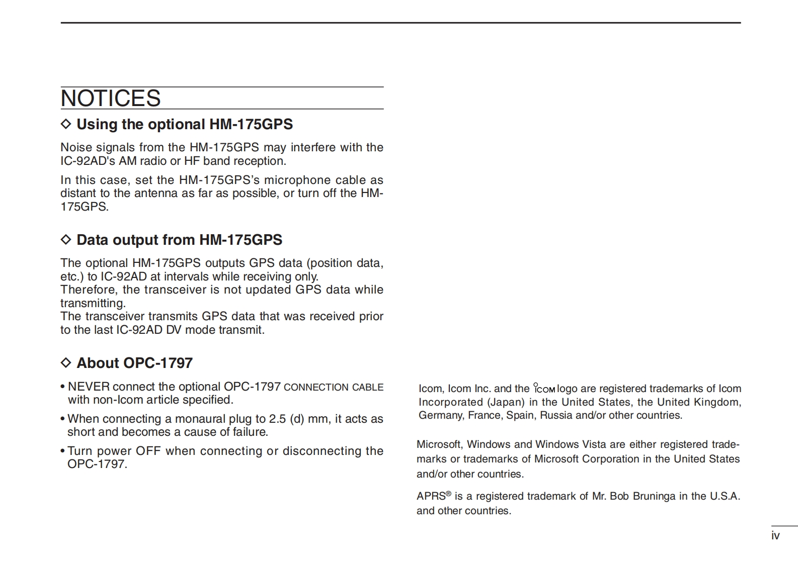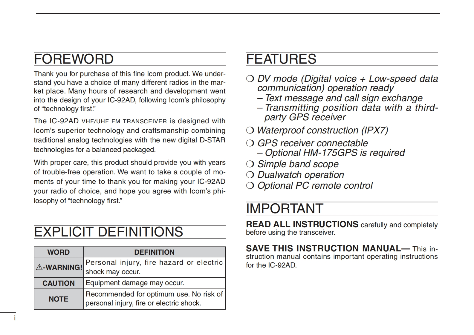 COMINSTRUCTION MANUALVHF/UHF DIGITAL TRANSCEIVERIC-92ADICOM92AD (79SUBMERSIBLE C-92ADThis device complies with Part 15 of the FCC Rules.Operationis subject to the following two conditions:(1)this device maynot cause harmful interference,and (2)this device must acceptany interference received,including interference that may causeundesired operation.D-STARWARNING:MODIFICATION OF THIS DEVICE TO RECEIVE CEL-LULAR RADIOTELEPHONE SERVICE SIGNALS IS PROHIBITED@UNDER FCC RULES AND FEDERAL LAW.Icom Inc.