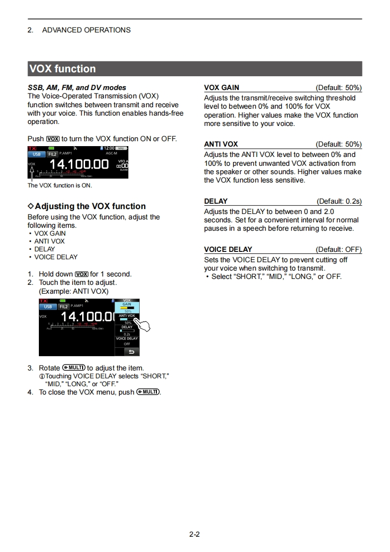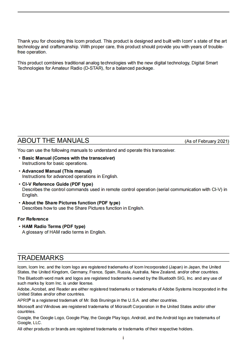 @cOMADVANCED MANUALHFNHF/UHF ALL MODEINTRODUCTIONTRANSCEIVER1C-7051BATTERY CHARGING2ADVANCED OPERATIONS3SCOPE OPERATION (ADVANCED)4microSD CARD (ADVANCED)5 VOICE RECORDER FUNCTIONS6VOICE TX MEMORY FUNCTION7MEMORY OPERATION8 SCANS9 OTHER FUNCTIONS10 Bluetooth OPERATIONThis manual describes instructions for advanced features andinstructions.11 WIRELESS LAN OPERATIONSee the BASIC MANUAL that come with the transceiver forprecaufions and basic operations.12 GPS OPERATION(ADVANCED)13 D-STAR OPERATION (BASIC)14 D-STAR OPERATION (ADVANCED)15 ABOUT THE DV GATEWAY FUNCTION16 MAINTENANCE(ADVANCED)17 UPDATING THE FIRMWAREIcom Inc.18 ADVANCED CONNECTIONS