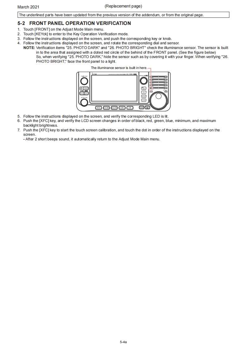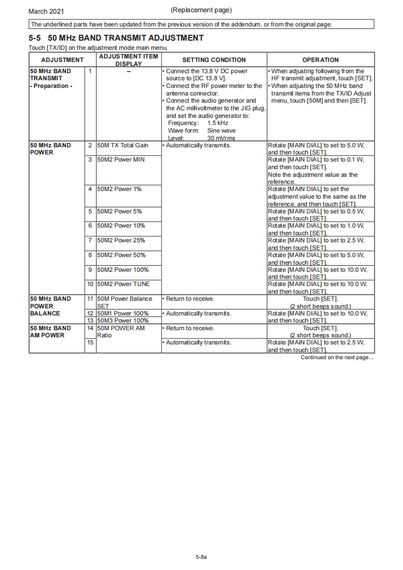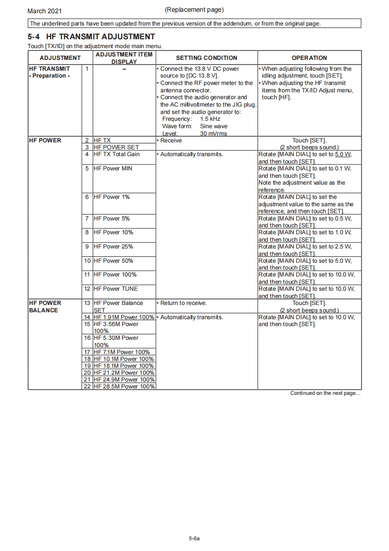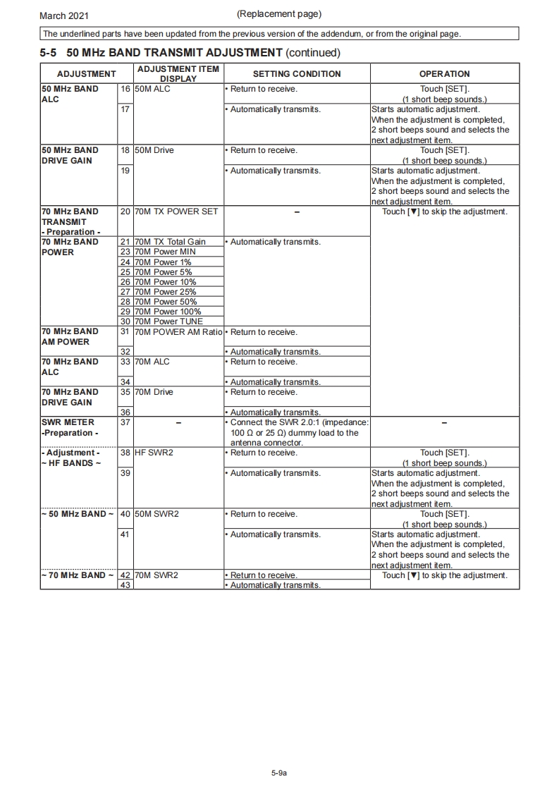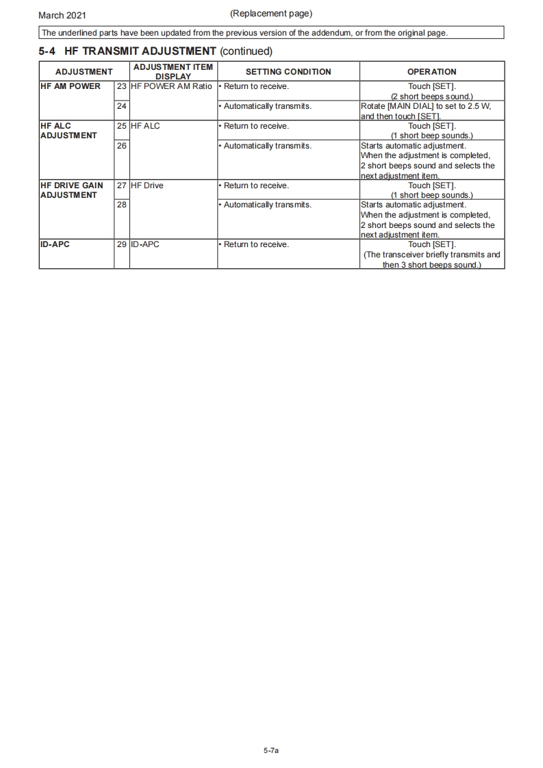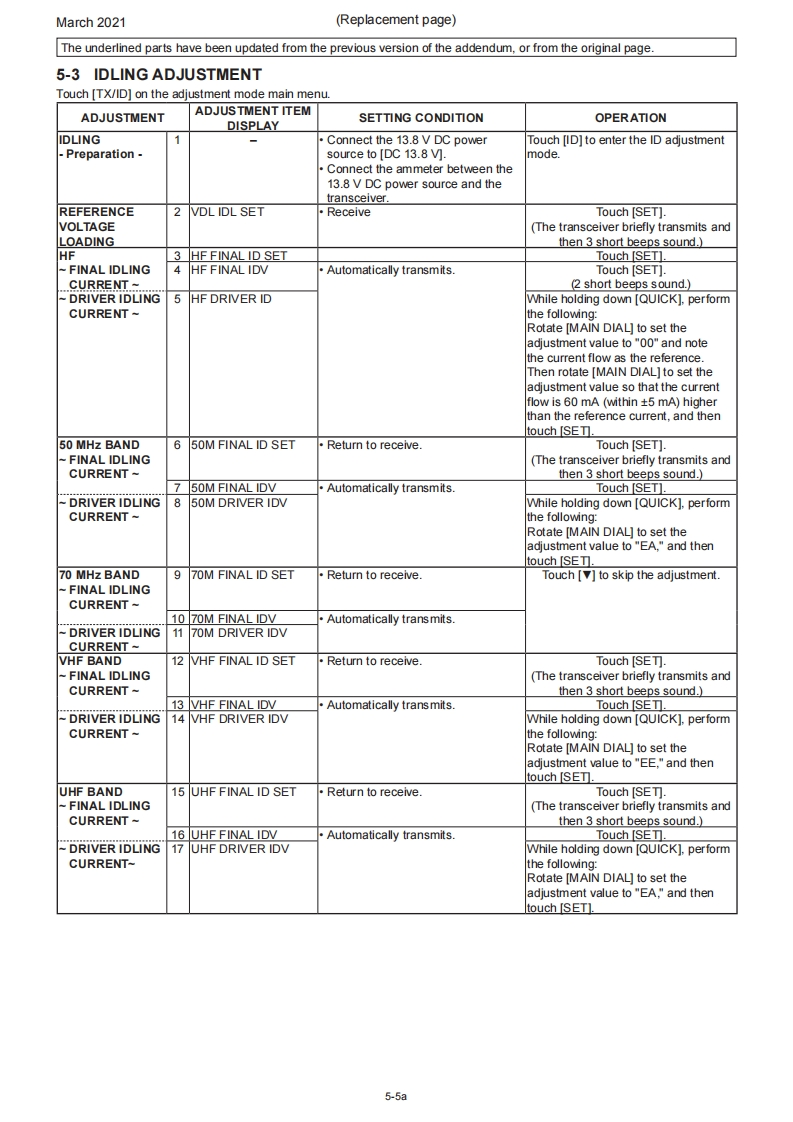 March 2021SERVICE MANUALERRATA1C-705Please note the following corrections and refer to the replaced pagesERRATASECTION 5 ADJUSTMENT PROCEDURESHEADINGDESCRIPTIONMISTAKE CORRECTION Page5-1 PREPARATIONIn the "REQUIRED EQUIPMENT"tableAmmeter wasAmmeter isnot in the tableadded.5-15-4 HF TRANSMITAdjustment value for the [HF TX Total Gain)ADJUSTMENT0.5w5.0w5-6item5-10 VHF BAND RECEIVE SSG frequency for the [VHF Tuned-BPF 1]72.2015MHz75.2015MHz5-17ADJUSTMENTitem5-11 UHF BAND RECEIVE SSG frequency for the [UHF Tuned-BPF402.2015MHz400.2015MHz5-19ADJUSTMENTitemNOTE:Corrected parts on each replaced page are underlined.REPLACED CONTENTSSECTION 5ADJUSTMENT PROCEDURES5-1a~5-19a