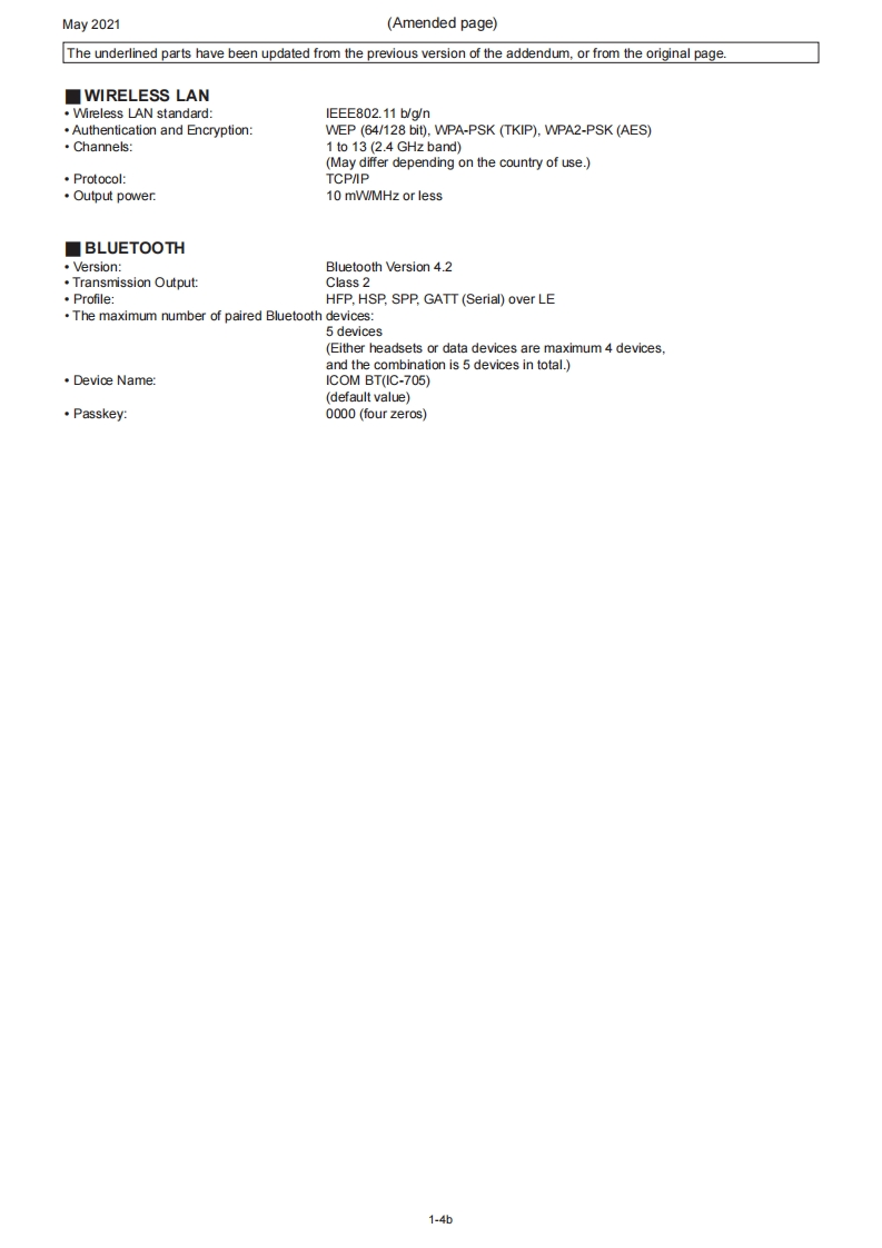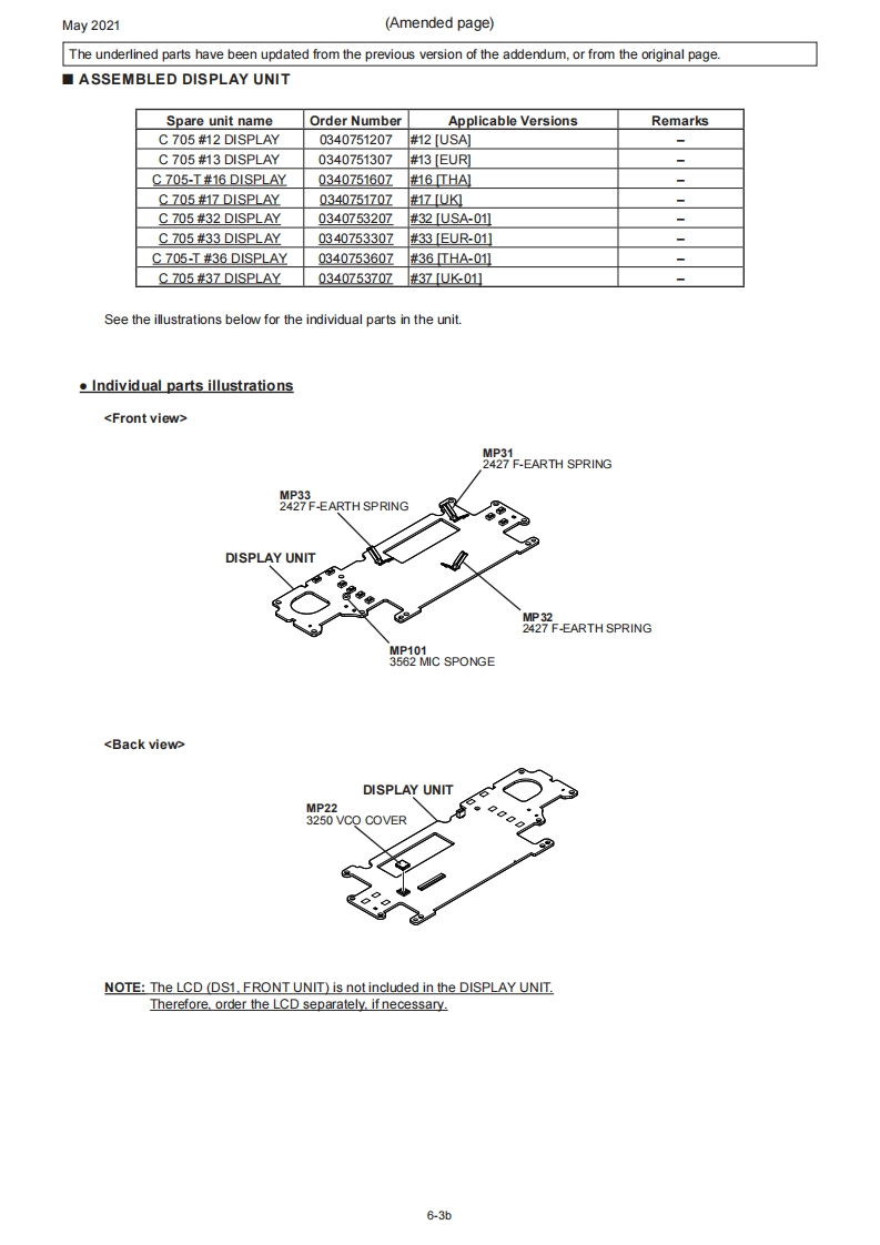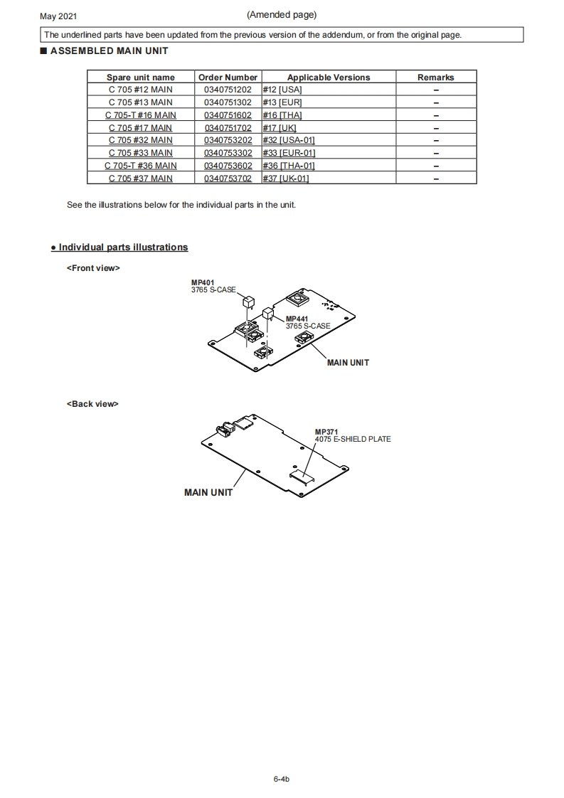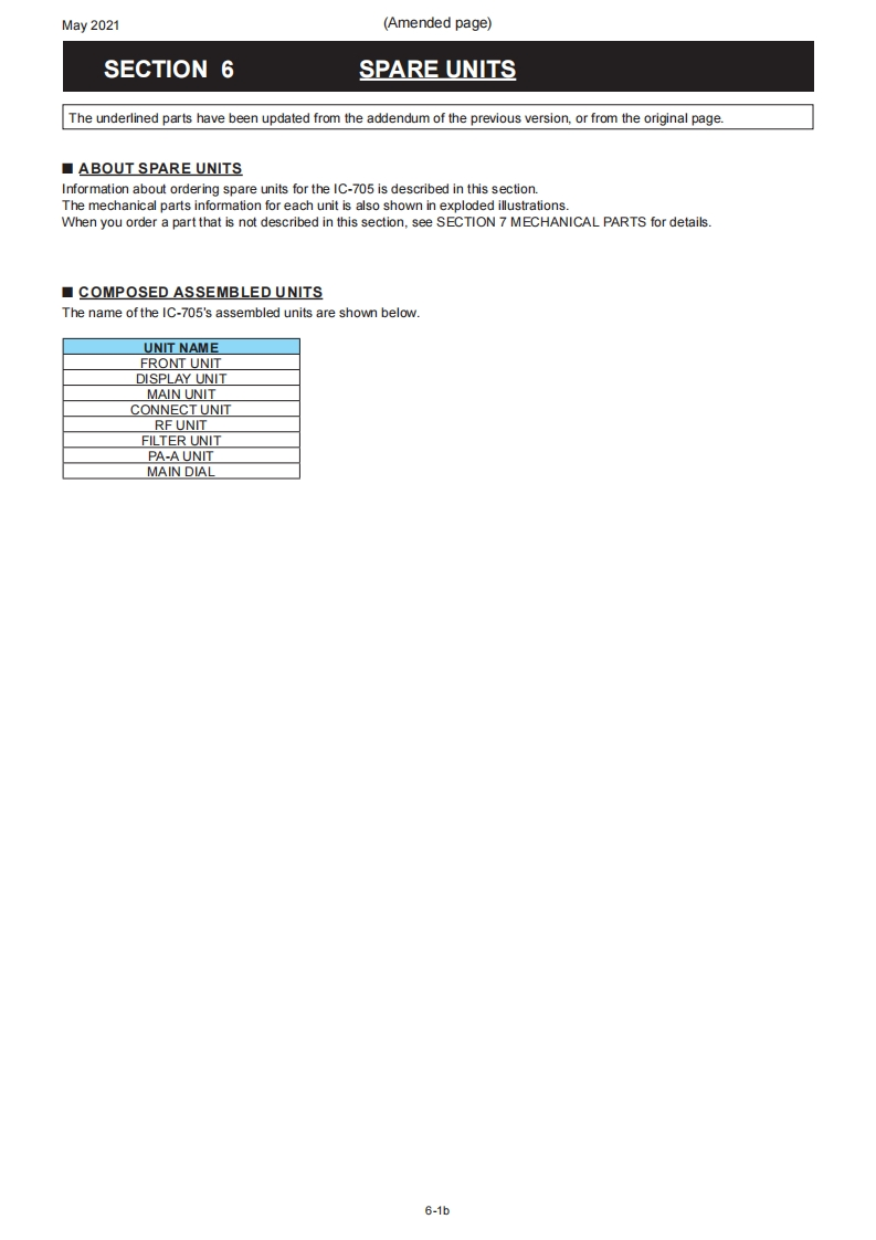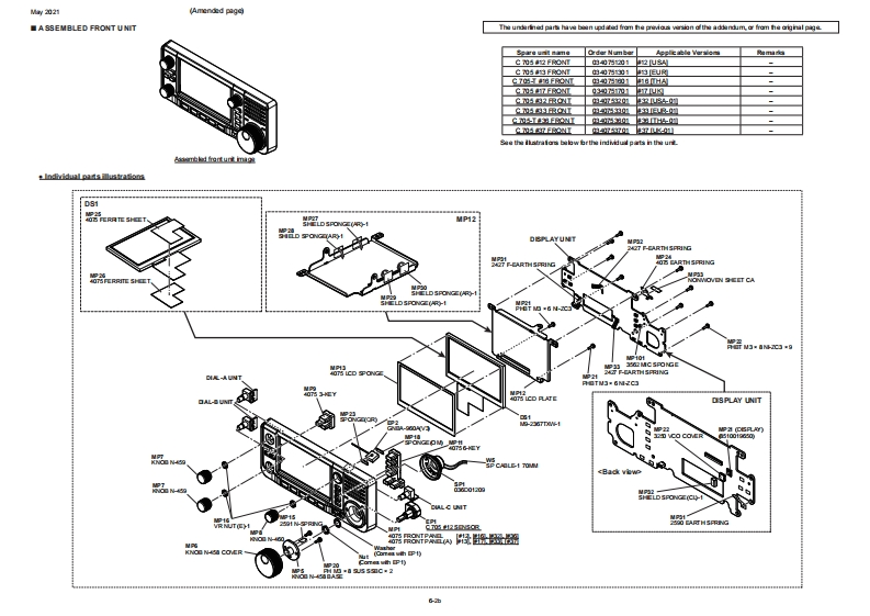 May 2021COMSERVICE MANUALADDENDUM1C-705/1C-705-TNOTE:Use these amended pages as one addendum set.Do not mix them up with the previous master pages.DefinitionsReplacement pageThe page to replace the original one.Addendum pageThe page to be added to the original set.Amended pageThe page to be added as change history.including corrections.Page number informationThe number of revisions can be easily understood by the addendum service manual's page number.The number of revisions (a,b,c..is added after the page number.CONTENTSSECTION 1SPECIFICATIONS.1-1b~1-4bSECTION 6SPARE UNITS...6-1b~6-9bSECTION 7MECHANICAL PARTS...7-1b-7-4bSECTION 8BOARD LAYOUT............................8-1b8-18bSECTION 9WIRING DIAGRAM9-1bSECTION 11SCHEMATIC DIAGRAM11-1b-11-26bSECTION 12RECOMMENDED SPARE PARTS..................12-1b-12-7bVERSION LISTModel5MHz435MHzAir bandFM radioVersionreceivereceiveNameNumber'VersionoperatioroperationRemarksfunctionfunction1C-70512USA1C-70513)EUR1C-705-T【16THA1C-705#1UK1C-705【32USA-011C-70533]EUR-011C-705-T3THA-011C-705【37UK-01"The first two digits of the serial number indicate its version number.Newly added version.