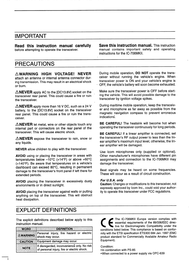 iCOMINSTRUCTION MANUALHFNHF TRANSCEIVERIC-706MKI君程95.沿699断1·SPLA/BThis device complies with Part 15f the FCC rulesOperation is subject to the lollowing two conditions:(1)This device nmay not causereceived,including interference that may cause undesired operationIcom Inc.