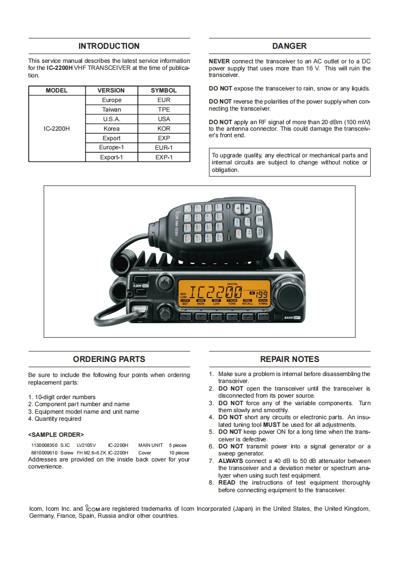 IC-2200H_维修操作说明书电器原理图手册找手册网31天前发布关注私信4.68MB54页037IC-2200H_维修操作说明书电器原理图手册此内容为付费资源,请付费后查看¥19¥21黄金会员免费钻石会员免费登录购买付费资源 第1页 / 共54页 第2页 / 共54页 第3页 / 共54页 第4页 / 共54页 第5页 / 共54页 第6页 / 共54页 第7页 / 共54页 第8页 / 共54页 第9页 / 共54页 第10页 / 共54页 试读已结束,还剩44页,您可下载完整版后进行离线阅读 THE END艾可慕 文本预览 iCOM'SERVICEMANUALVHF TRANSCEIVER1C-2200HIcom Inc. 查看更多 收起部分 喜欢就支持一下吧收藏