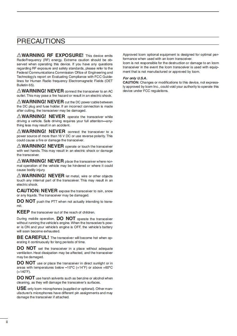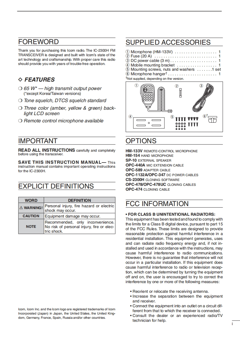 iCOMINSTRUCTION MANUALFM TRANSCEIVERIC-2300HIC-2300含12型里This device complies with Part 15 of the FCC Rules.Operation issubject to the following two condifions:(1)this device may not causeharmful interference,and (2)this device must accept amy interferencereceived,including interference that may cause undesired operation.Icom Inc.