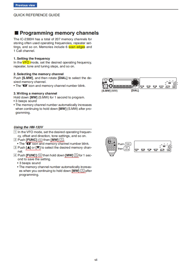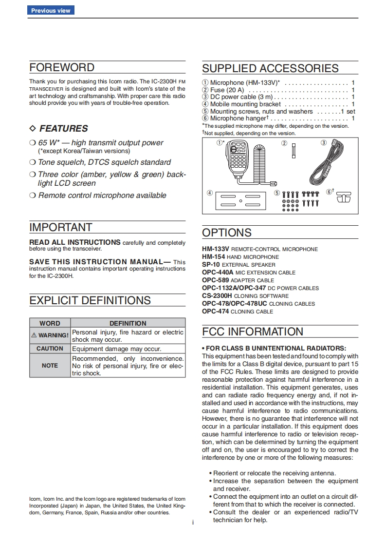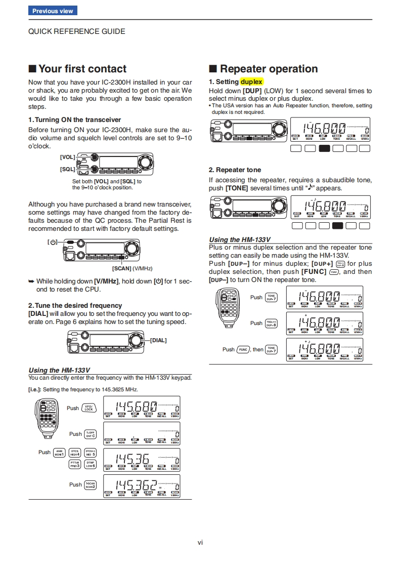 Previous viewINTRODUCTIONAbout this Instruction Manual (PDF format)These Instruction Manual describe the details of the IC-2300H's features.And,this PDF formatted manual providesyou with convenient functions,as follows.Move to the previously read page.Click [Previous view]at the left top on an each page,toPedaitvievmove back to the previously read page.10 OCET BEEPAND TONE SOUEL白H■Tone scan,4609.3Shows a term descriptionWhen the mouse cursor is moved over a term which出四ais highlighted in yellow,the description of term is dis-played.5609The screen shots at the right column,correspond tothe operating instructions and procedures shows bothsetting and operating example.万Phg白msc回othShows the location of keys达a回地当When the cursor is moved over a term with a red un-derline,a red circle appears around the appropriatekey(s)on the figure of HM-133V.Example:When the cursor is moved over [CLR]in-the description,a red circle appears aroundthe appropriate key(s).