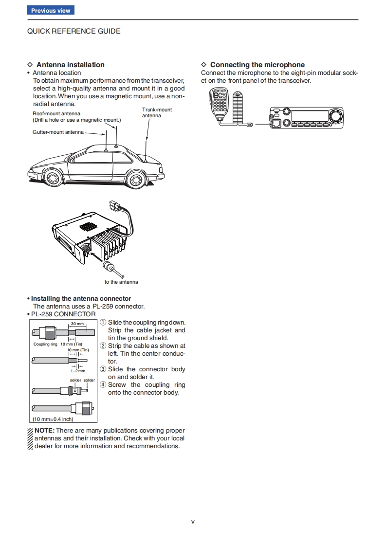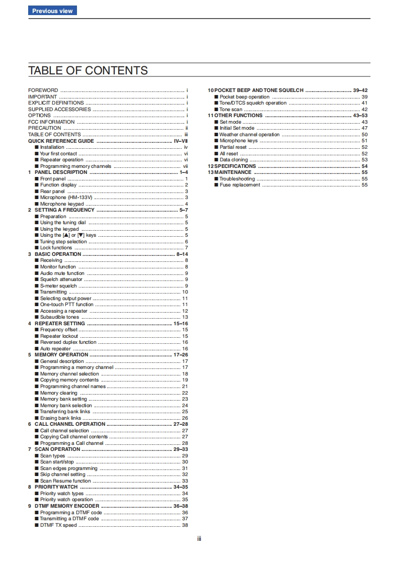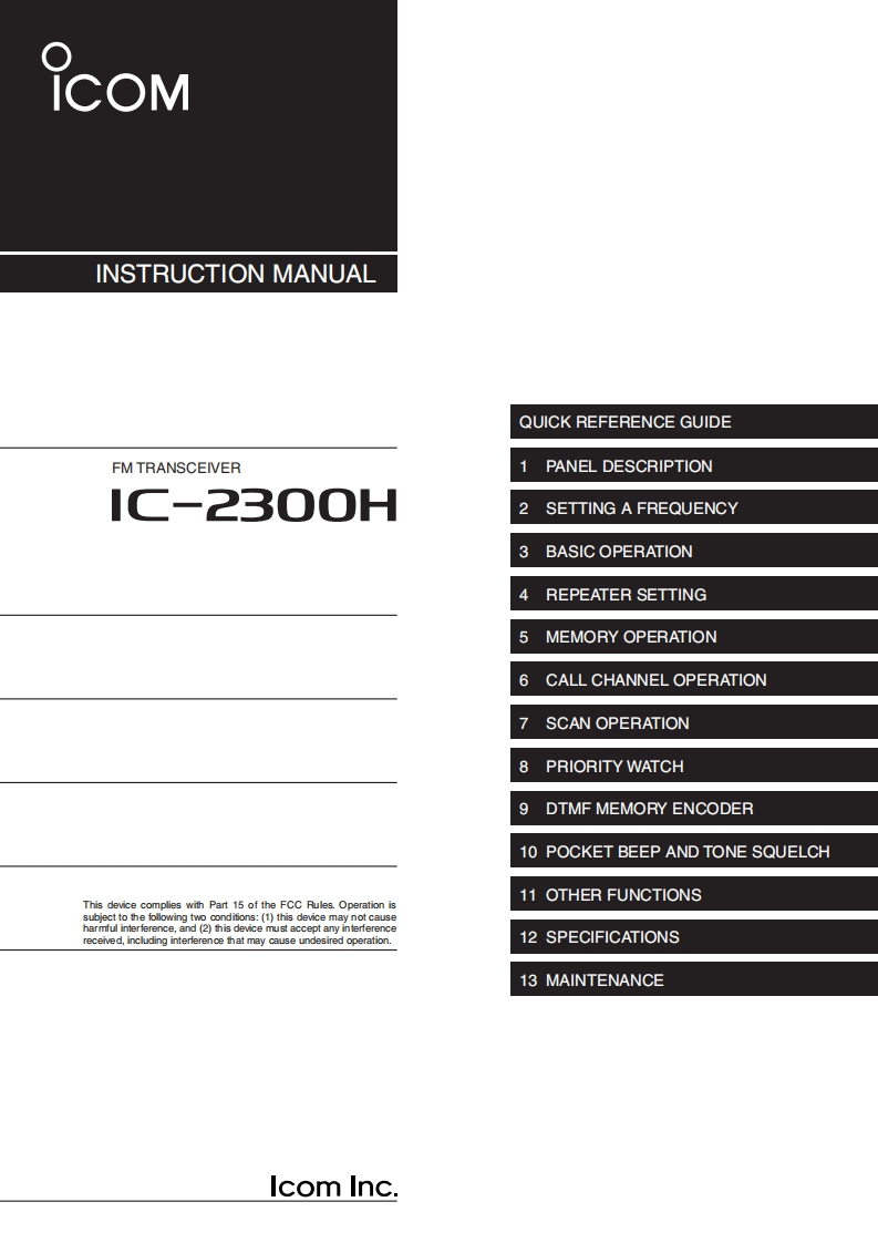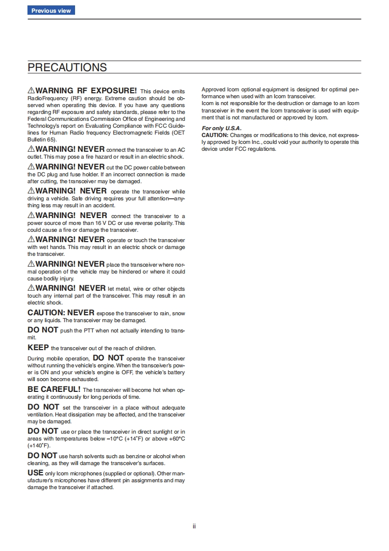 Previous viewINTRODUCTIONAbout this Instruction Manual (PDF format)These Instruction Manual describe the details of the IC-2300H's features.And,this PDF formatted manual providesyou with convenient functions,as follows.Move to the previously read page.Click [Previous view]at the left top on an each page,toPedaitvievmove back to the previously read page.10 OCET BEEPAND TONE SOUEL白H■Tone scan,4609.3Shows a term descriptionWhen the mouse cursor is moved over a term which出四ais highlighted in yellow,the description of term is dis-played.5609The screen shots at the right column,correspond tothe operating instructions and procedures shows bothsetting and operating example.万Phg白msc回othShows the location of keys达a回地当When the cursor is moved over a term with a red un-derline,a red circle appears around the appropriatekey(s)on the figure of HM-133V.Example:When the cursor is moved over [CLR]in-the description,a red circle appears aroundthe appropriate key(s).