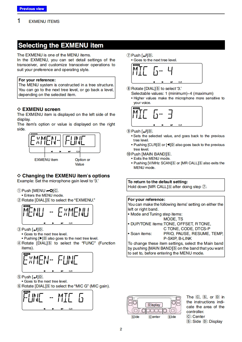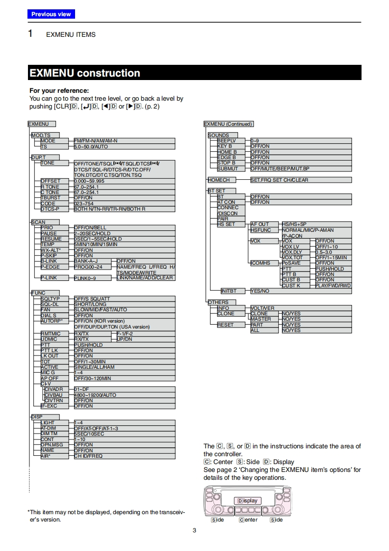 IC-2730A/MC-2730EEXMENU items and Cl-V informationThis document describes the IC-2730A/E's EXMENU items and Cl-V information.1.EXMENU itemsSelecting the EXMENU item.....◇EXMENU screen...….........Changing the EXMENU item's options...........................2EXMENU construction ........3Mode and Tuning step items.........4DUP/TONE items.5Scan itemSFunction items.…10Display items..…..13Sounds items.….15Home channel items..16Bluetooth Set items.............17Others items..….20Changing the microphone key's function assignment........21To the supplied HM-207 REMOTE-CONTROL MICROPHONE ............21To the optional HM-154 HAND MICROPHONE.........2To the optional VS-3 Bluetooth HEADSET..32.CI-V informationClV information.24◇Setting Cl-V data24Connecting to a PC..24◇Data format.24◇Command table...25Icom,Icom Inc.and the lcom logo are registered trademarks of Icom Incorporated (Japan)in Japan,the United States,theUnited Kingdom,Germany,France,Spain,Russia,and/or other countries.The Bluetooth word mark and logos are registered trademarks owned by Bluetooth SIG,Inc.and any use of such marks by lcominc.is under license.All other products or brands are registered trademarks or trademarks of their respective holders.A-7194-4EX1
