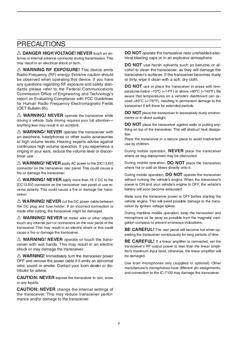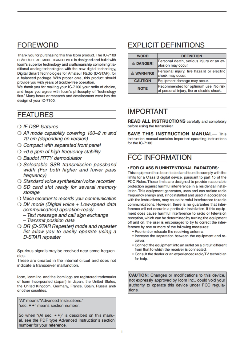 ICOMINSTRUCTION MANUALHF/VHF/UHF ALL MODE TRANSCEIVER1C-71000000COM7.100.00oThis device complies with Part 15 of the FCC Rules.Operationis subject to the following two conditions:(1)this device maynot cause harmful interference,and (2)this device must acceptany interference received,including interference that may causeundesired operation.WARNING:MODIFICATION OF THIS DEVICE TO RECEIVECELLULAR RADIOTELEPHONE SERVICE SIGNALS ISPROHIBITED UNDER FCC RULES AND FEDERAL LAW.Icom Inc.