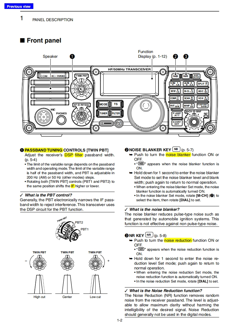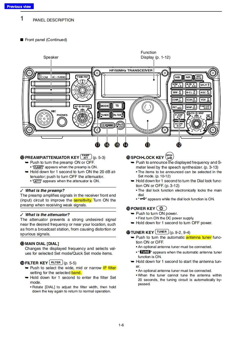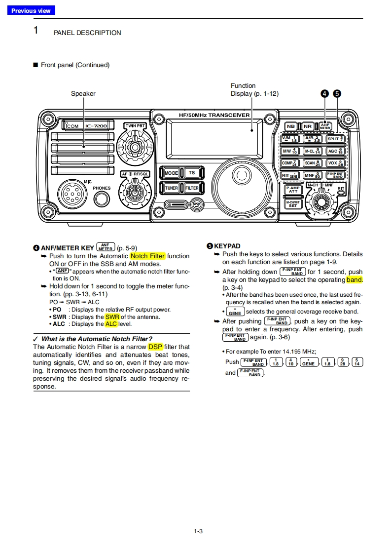 Previous viewINTRODUCTIONAbout these Advanced Instructions(PDF format)These Advanced Instructions describe the details of the IC-7200 features.This PDF formatted manual provides youwith convenient functions,as follows.The screen shots at the right column,correspond toMove to the previously read page.the operating instructions and procedures shows bothClick [Previous view]at the left top on an each page,tosetting and operating example.move back to the previously read page.■Frequancy ating0nuShows the location of keysWhen the cursor is moved over a term with a red un-08derline,a red circle appears around the appropriate①pah☐oum ON the o:uning Lncknkey(s)on the figure of the transceiver.H 0000Example:When the cursor is moved over [Ts in thedescription,a red circle appears around theappropriate key(s).electing k七bee年Shows a term descriptionhngethe eng heencyWhen the mouse cursor is moved over a term whichTuning ap S mo由is highlighted in yellow,the description of the term isdisplayed.⊙围向aIcom,Icom Inc.and the lcom logo are registered trademarks of lcom Incorporated (Japan)in Japan,the United States,theUnited Kingdom,Germany,France,Spain,Russia and/or other countries.Adobe and Adobe Reader are registered trademark of Adobe Systems Incorporated.All other products or brands are registered trademarks or trademarks of their respective holders.