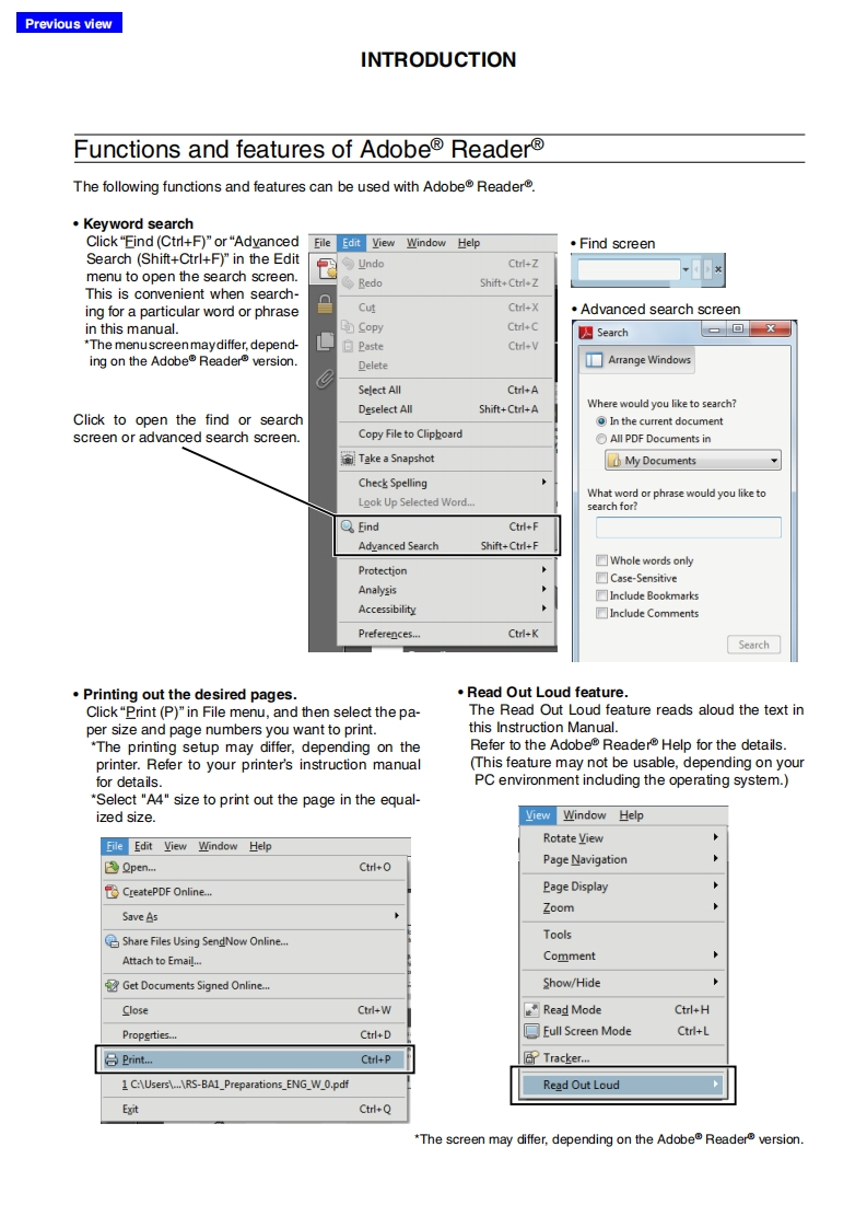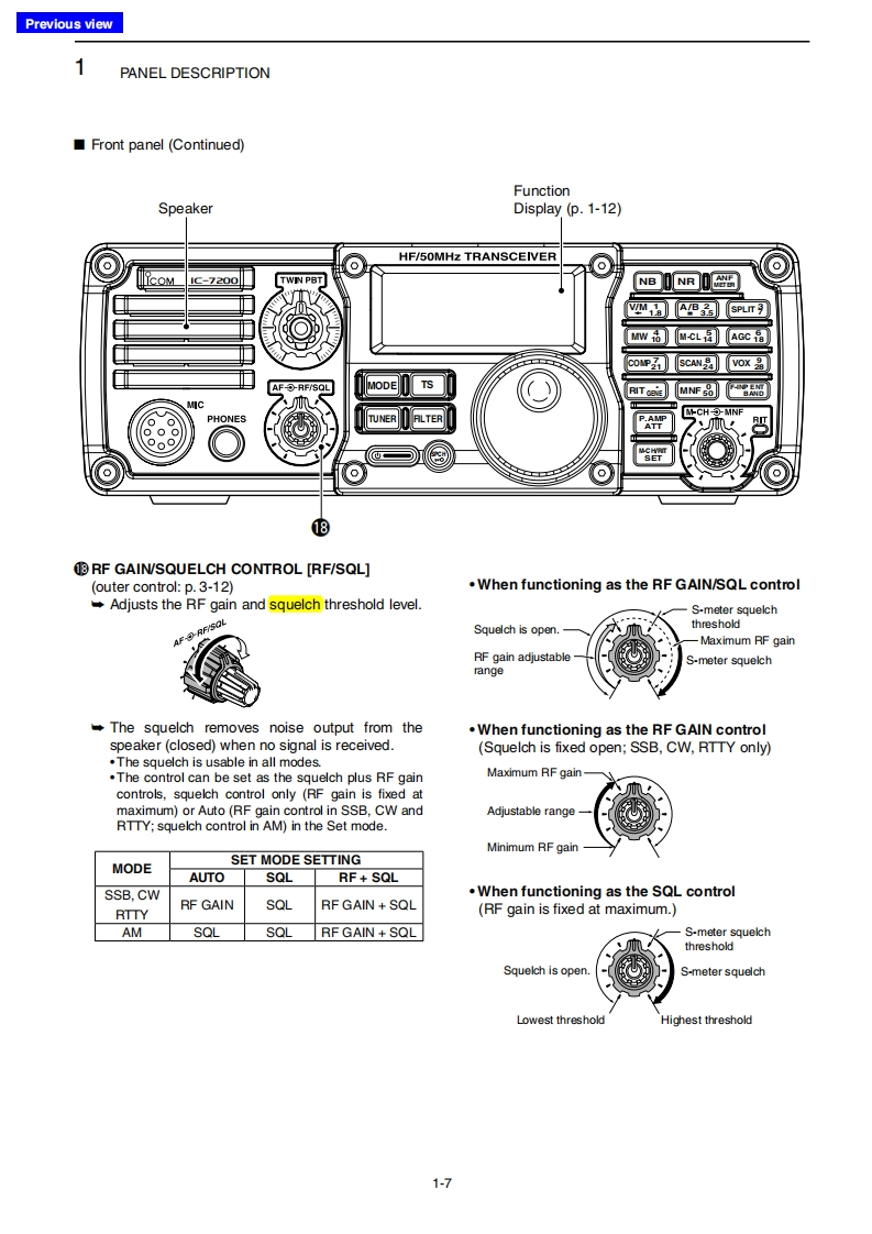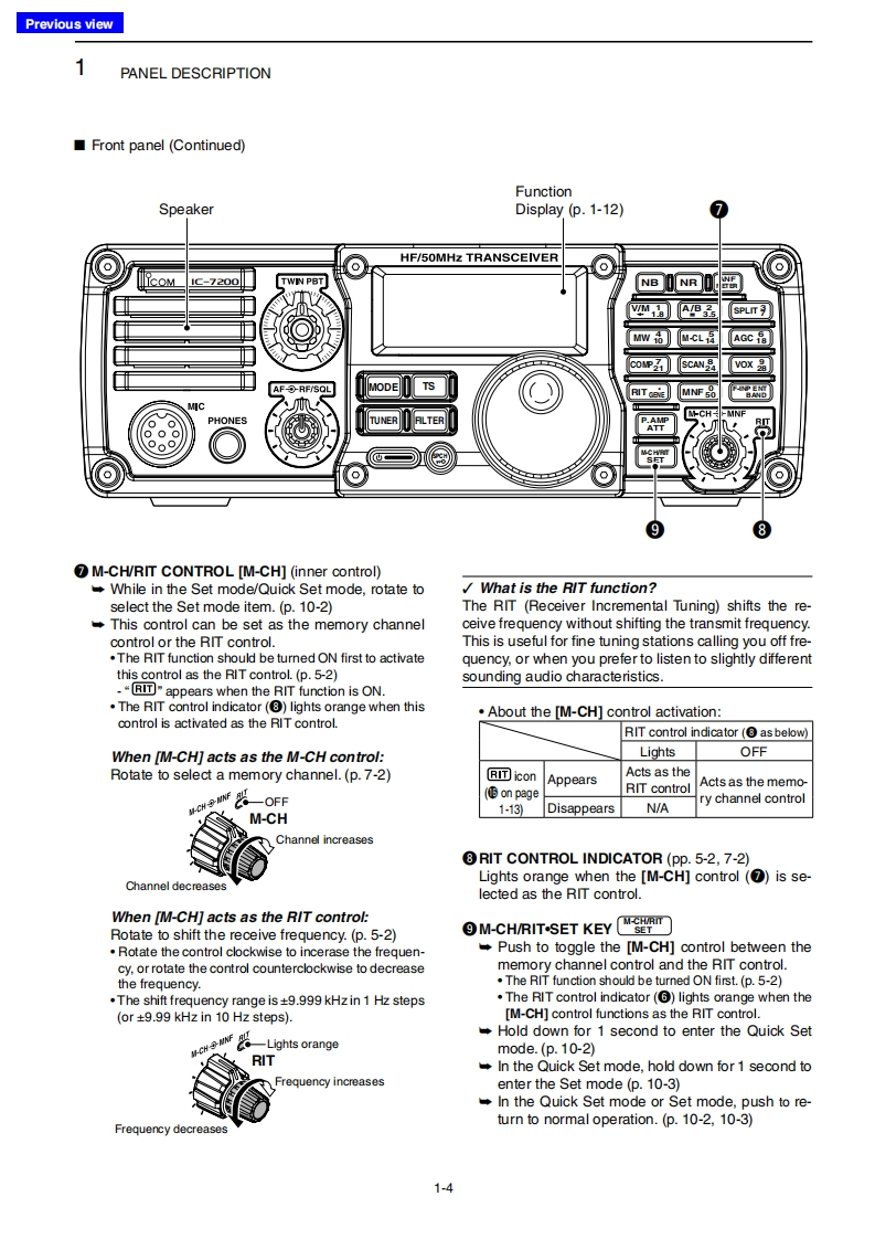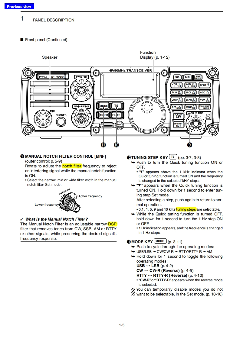 Previous viewINTRODUCTIONAbout these Advanced Instructions(PDF format)These Advanced Instructions describe the details of the IC-7200 features.This PDF formatted manual provides youwith convenient functions,as follows.The screen shots at the right column,correspond toMove to the previously read page.the operating instructions and procedures shows bothClick [Previous view]at the left top on an each page,tosetting and operating example.move back to the previously read page.■Frequancy ating0nuShows the location of keysWhen the cursor is moved over a term with a red un-08derline,a red circle appears around the appropriate①pah☐oum ON the o:uning Lncknkey(s)on the figure of the transceiver.H 0000Example:When the cursor is moved over [Ts in thedescription,a red circle appears around theappropriate key(s).electing k七bee年Shows a term descriptionhngethe eng heencyWhen the mouse cursor is moved over a term whichTuning ap S mo由is highlighted in yellow,the description of the term isdisplayed.⊙围向aIcom,Icom Inc.and the lcom logo are registered trademarks of lcom Incorporated (Japan)in Japan,the United States,theUnited Kingdom,Germany,France,Spain,Russia and/or other countries.Adobe and Adobe Reader are registered trademark of Adobe Systems Incorporated.All other products or brands are registered trademarks or trademarks of their respective holders.