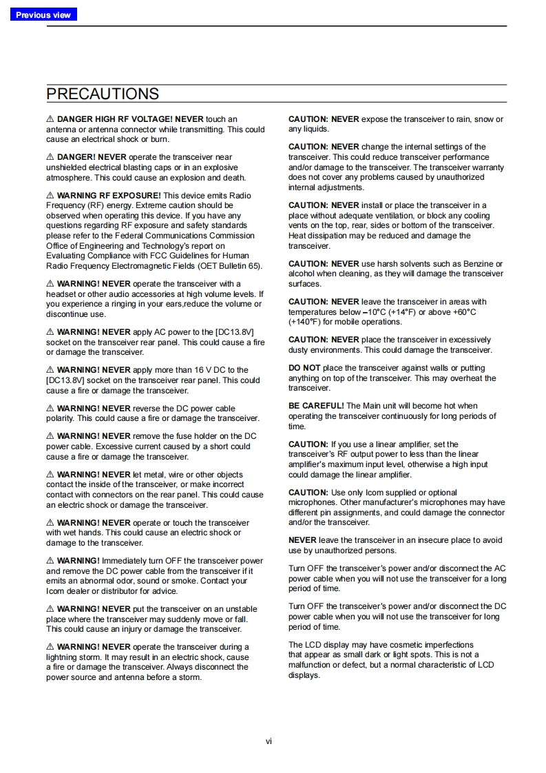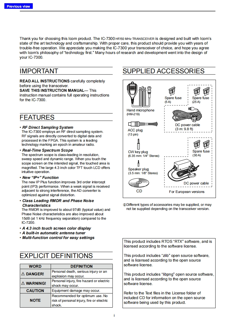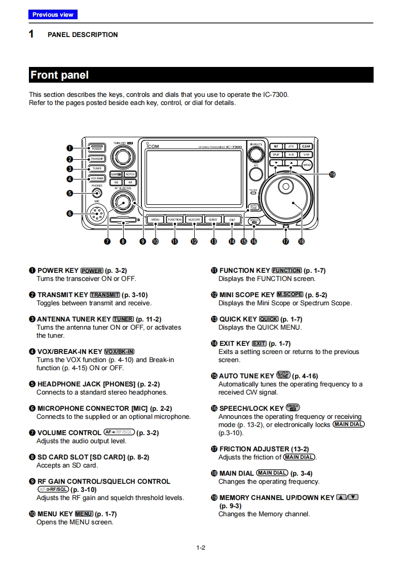 icomFULL MANUALINTRODUCTION1 PANEL DESCRIPTION2 INSTALLATION AND CONNECTIONS3 BASIC OPERATION4RECEIVING AND TRANSMITTINGHF/50 MHz TRANSCEIVER5SCOPE OPERATION1c-73006VOICE RECORDER FUNCTIONS7VOICE TX MEMORY OPERATION8 USINGAN SD CARD9 MEMORY OPERATION10 SCANS11 ANTENNA TUNER OPERATION12 SET MODE13 OTHER FUNCTIONS14 MAINTENANCE15 UPDATING THE FIRMWARE16 SPECIFICATIONS17 OPTIONS18 CONNECTOR INFORMATION19 CONTROL COMMANDINDEXABOUT CEIcom Inc.