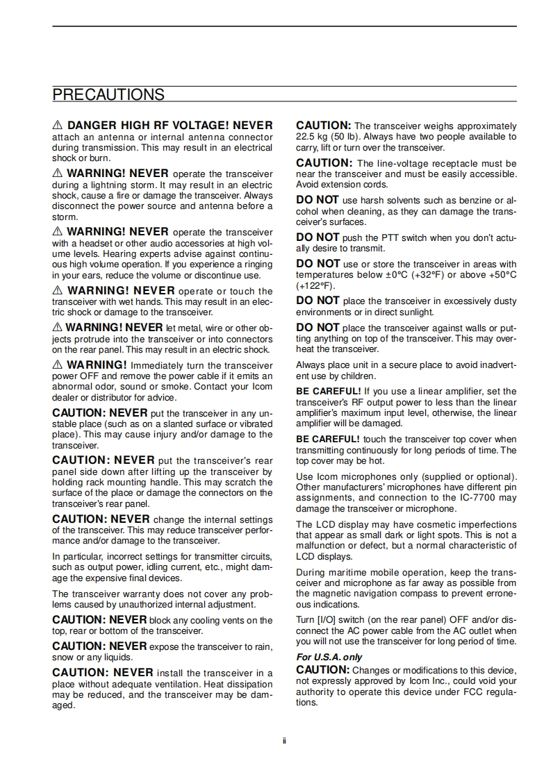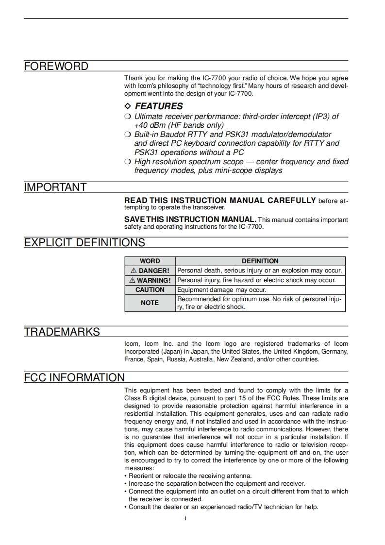 IC-7700_使用说明书手册_2018找手册网31天前发布关注私信8.65MB232页042IC-7700_使用说明书手册_2018此内容为付费资源,请付费后查看¥19¥21黄金会员免费钻石会员免费登录购买付费资源 第1页 / 共232页 第2页 / 共232页 第3页 / 共232页 第4页 / 共232页 第5页 / 共232页 第6页 / 共232页 第7页 / 共232页 第8页 / 共232页 第9页 / 共232页 第10页 / 共232页 试读已结束,还剩222页,您可下载完整版后进行离线阅读 THE END艾可慕 文本预览 HF/50 MHZ TRANSCEIVERIC-7700Instruction ManualA6937H-1EX-7Printed in Japan@2011-2018 lcom Inc. 查看更多 收起部分 喜欢就支持一下吧收藏