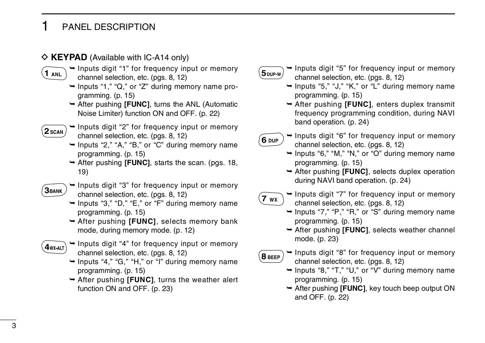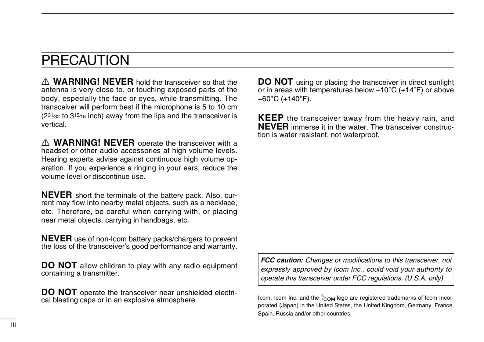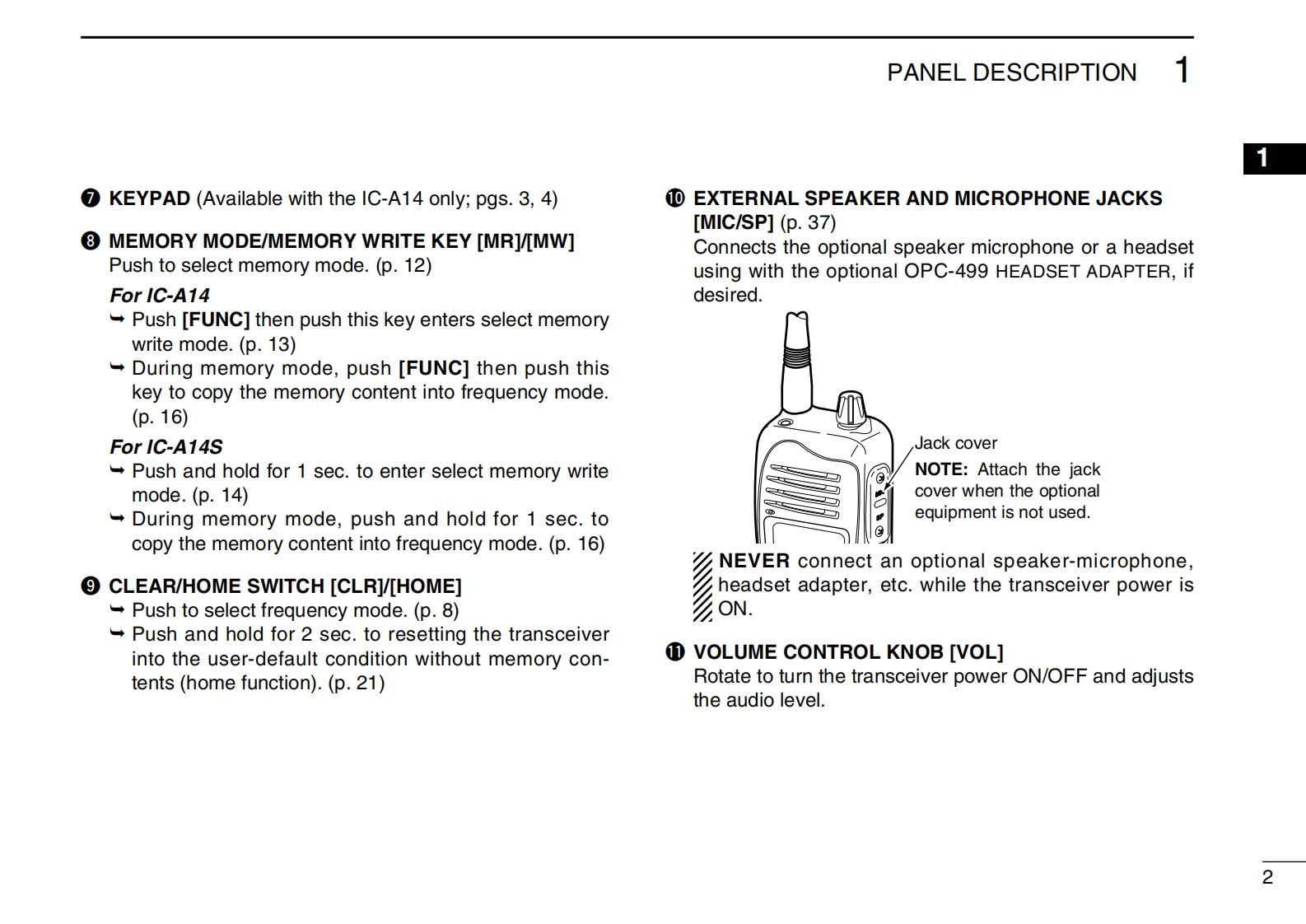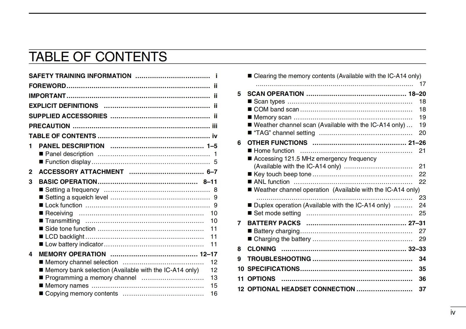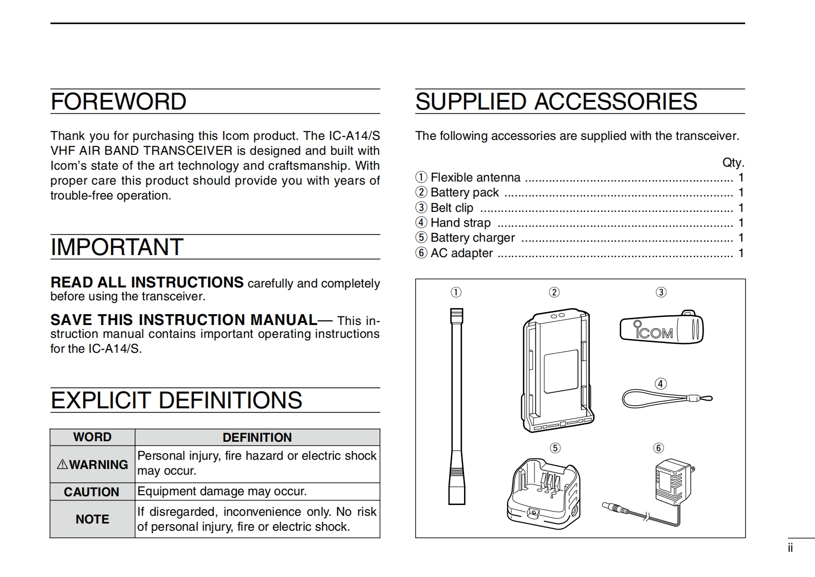 INSTRUCTION MANUALVHF AIR BAND TRANSCEIVERIEAl4sICOMICOMThis device complies with Part 15 of the FCC置a4置A5Rules.Operation is subject to the conditionthat this device does not cause harmful inter⊙0四四ference.1 ANL 25CAFUNCIcom Inc.▲IC-A14▲IC-A14S