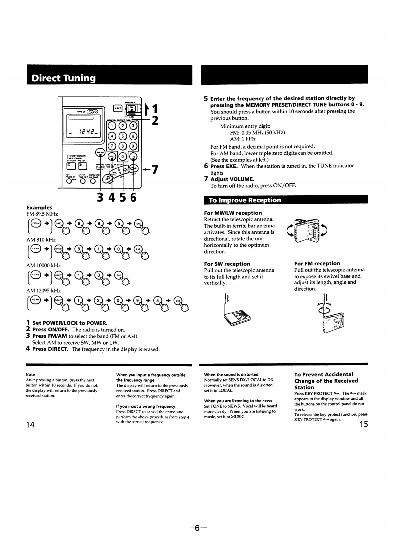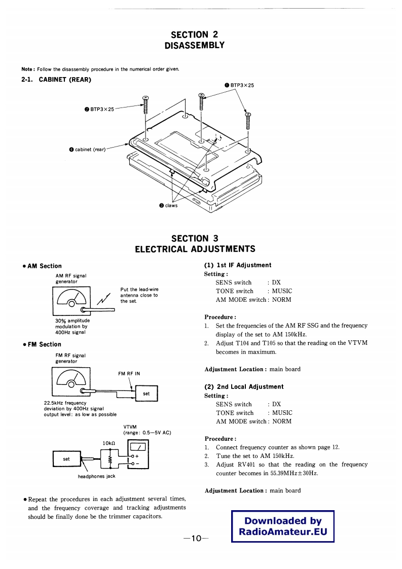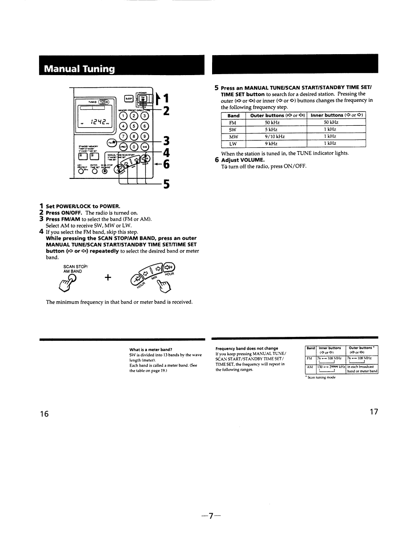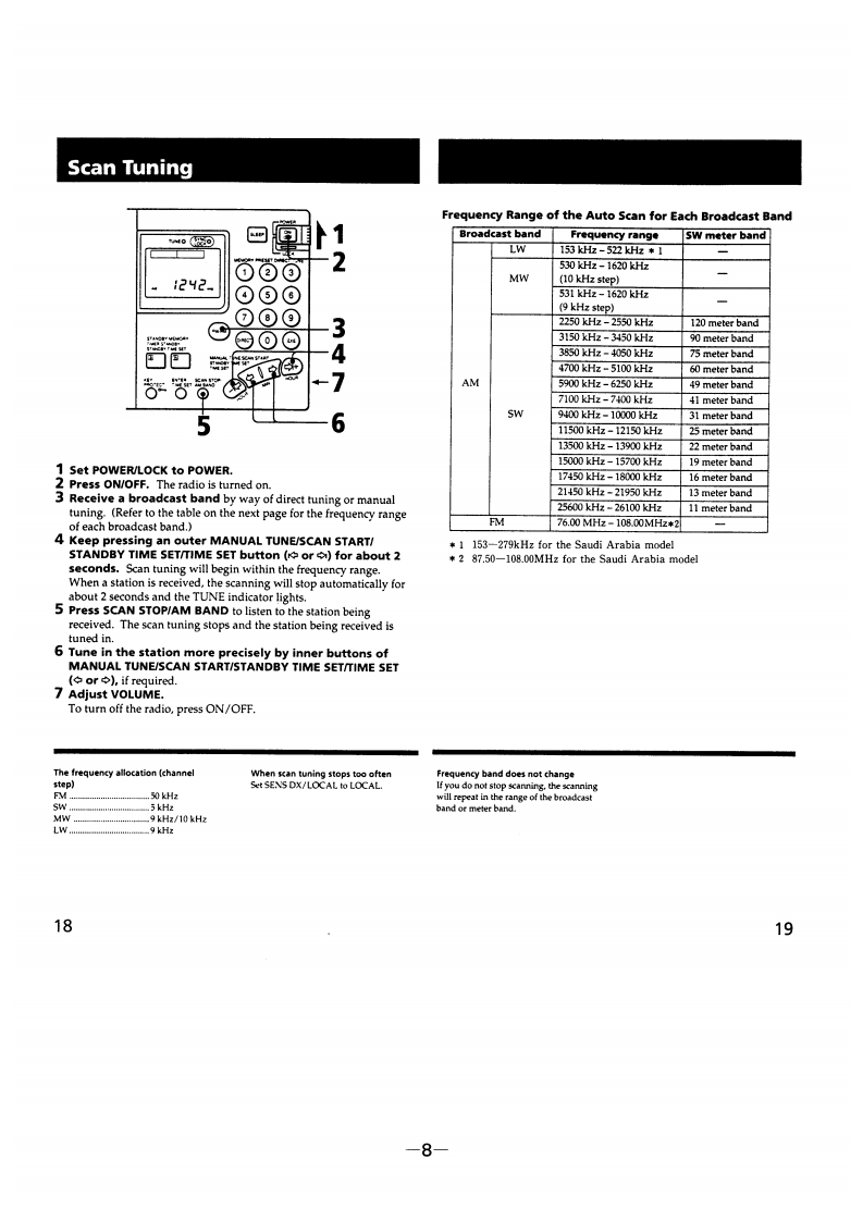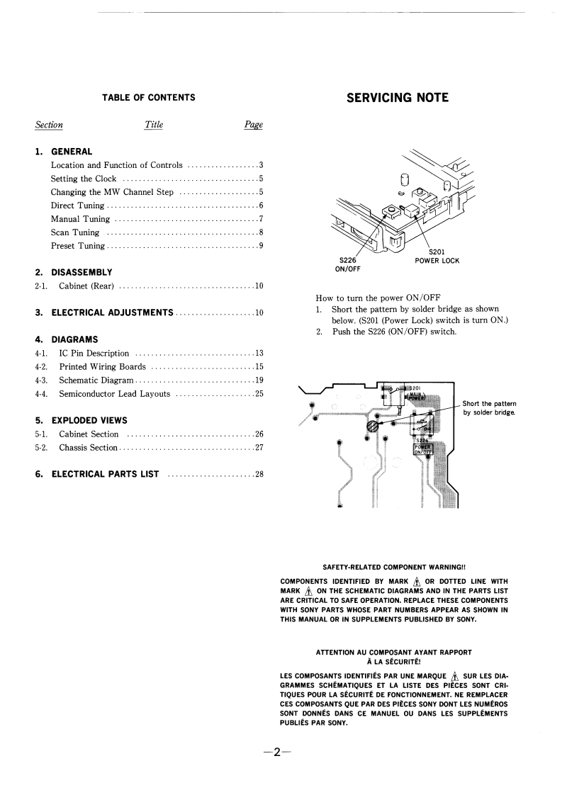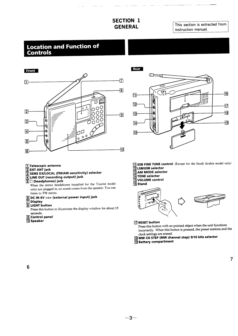 ICF-SW7600GSERVICE MANUALUS ModelCanadian ModelDownloaded byAEPModelRadioAmateur.EUSONYUK ModelE Model880Tourist Model…SPECIFICATIONSFEATURESCircuit systemFMSuperheterodyne.An FM stereo/SW /MW/LW receiver with worldwide band coverSW/MW/LW:Dual conversion superheterodyneage.Frequency rangeBand Saudi Arabia model Other models.Quartz controlled PLL (Phase Locked Loop)synthesizer system usingM875-108.0MHz76.0-108.0MHza microcomputer for easy pinpoint tuning.The tuned frequency isSW1621-26100kHz1621-29999kHzdigitally displayed.MW530-1620kHz530-1620kHzSSB (Single Side Band)can be received (except for the Saudi ArabiaLW 150-285 kHz150-529kH2model only).SpeakerPower outputmt09arankawashmsonic distortion).FM stereo reception for headphones (supplied for the Tourist model only).OutputsRecording output jack (stereo minijack)output level 245 mV (-10 dBs)Direct tuningTuning in the station by inputting the frequency ofoutput impedance 10 kilohm or lessthe station directlyHeadphones jack (stereo minijack)16 ohmsManual tuningEven if you don't know the frequency of the station,Power requirementsSVDCFour R6(size AA)batteriesyou can tune in the station precisely.DC IN 6V jack accepts:Scan tuningAutomatic searching of a stationSony AC-E601 AC power adaptorPreset tuningUp to 20 stations,10 stations each for FM and AM,(supplied for Tourist model only)can be preset for button-touch tuning.Battery lifeUsing Sony SUM-3(NS)batteries:Timer standbyReceiving a desired station at the desired timeFM:approx.15 hours,AM:approx.10 hoursSleep timerTurning the radio off automatically in 60 minutesUsing Sony AM-3(N)alkaline batteries:Power sourcesThree different power sources:internal batteries,F月M:approx.33 hours,house current,car batteriesAM:approx.20 hours(When listening for four hours a day at normal volume)DimensionsApprox.191.2118x 323 mm (w/h/d)75/8x43/4x15/16 inches)MassAn品3g888 indhwlingu。oz)including batterieAccessories suppliedBatteries (4)*1Stereo headphones (1)*1Ear pad (2)1AC power adaptor AC-E601 (1)*1AC plug adaptor (1)*1Compact antenna (1)Antenna connector (1)*1Carrying case (1)Wave handbook (1)2How to catch the wave (1)*1*1 supplied for the Tourist model only*2 not supplied for the Saudi Arabia model onlyFM STEREO/SW/MW/LWDesign and specifications subject to change without notice.PLL SYNTHESIZED RECEIVERMICROFILMSONY