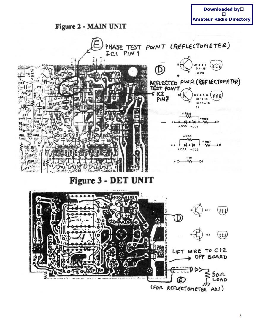 Downloaded by☐▣Amateur Radio DirectoryAT-500 HF AUTOTUNER MAINTENANCEBy Adam M.Farson,VA7OJ/AB40J.The Icom AT-500 HF automatic antenna tuner is an exceptionally hardy piece of gear.With reasonable care,it will givemany years of good service.Like any electromechanical device,the AT-500 benefits from occasional maintenance(cleaning and lubrication).This will improve its reliability and prolong its useful life.This article addresses threemaintenance areas:1.Motor and gear drive lubrication;2.Bandswitch cleaning and lubrication;3.Alignment of theinternal reflectometer.Prior to starting,power down the AT-500 and remove top and bottom case covers.1.MOTOR AND GEAR DRIVE LUBRICATION Refer to Figure 1,the IC-AT500 TOP VIEW.The worm gear drives of thecapacitor and bandswitch driving motors and,if need be,the motor bearings,should be re-lubricated every three to fouryears,or when a significant increase in mechanical noise is observed during tuning.Apply an amount of white or yellow nylon-gear grease the size of a match-head to the nylon worm gear on each motorshaft,(L)in Figure 1.Now power up the tuner,and set the front panel bandswitch first to 1.8,then to 24-28 to run themotors through the whole tuning range and distribute the grease.If a squeaky motor noise persists,apply a drop of clockoil to the front and rear bearings of each motor.DO NOT OVER-LUBRICATE!2.BANDSWITCH CLEANING Refer to(C)in Figure 1.The motor-driven bandswitch does not require routine cleaning.However,the gradual accumulation of dust over time on the film of lubricant on the RF contacts of the switch(S3-1 andS3-2)can ultimately lead to carbon-tracking and arcing.Should arcing ever occur under nommal operation(500W input,load SWR less than 3:1),carefully clean the ceramic bandswitch wafers with isopropyl alcohol and a small stiff-bristledbrush.Apply sufficient solvent to flush away all dirt and residue.Ensure that the switch wafers and contacts arecompletely free of carbon dust,brush bristles or other residue.Wait for the solvent to dry.Power up the tuner to run thebandswitch,then carefully re-lubricate the switch contacts with a good contact lube.Apply with a very fine artist's brush.Run the bandswitch again to distribute the lube.The required grease and contact lube can be purchased at an electronicssupply house.Do not use TV tuner cleaning products.Again,DO NOT OVER-LUBRICATE!3.ALIGNMENT OF THE INTERNAL REFLECTOMETERRequired Equipment:Bird (or equivalent)100W 50 ohm load with coax lead.Bird 43 RF wattmeter with 100H element or equiv.Refer to Figure 1(MAIN UNIT)and Figure 3(DET UNIT).This adjustment should be performed if the AT-500's matchingaccuracy after tuning is degraded to the point that the VSWR at the tuner input is greater than 1.2:1 with a 50 ohm load atthe output.ALIGNMENT PROCEDURE:1.Lift wire leading to tuning capacitor C12 off reflectometer output pad(E)in Figure 3,on DET board.Solder centreconductor of dummy load coax to this pad.Solder coax braid to adjacent ground plan